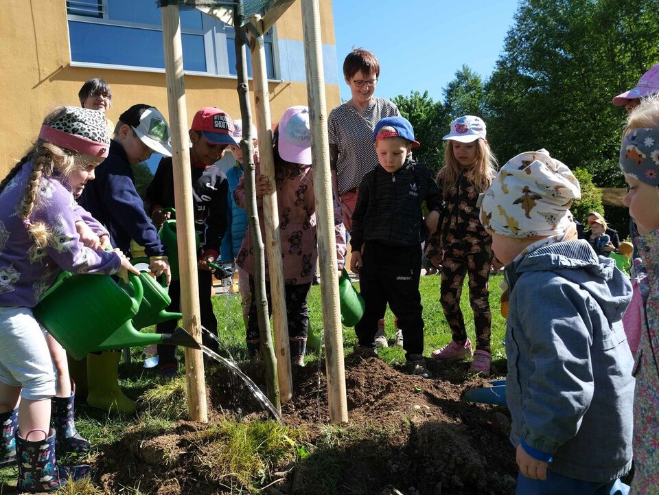 Mit einem neu gepflanzten Bau setzten wir am Tag der Kinderbetreuung ein Hoffnungszeichen in unserer christlichen Kita „Unterm Regenbogen“.