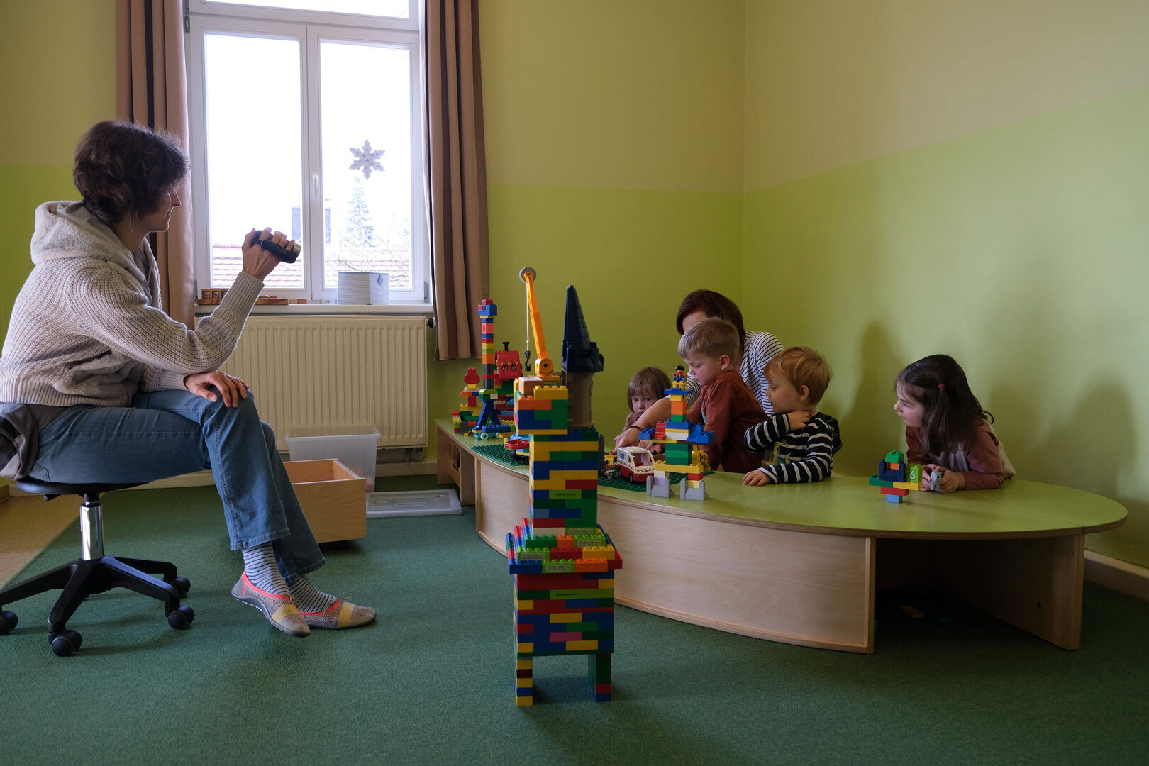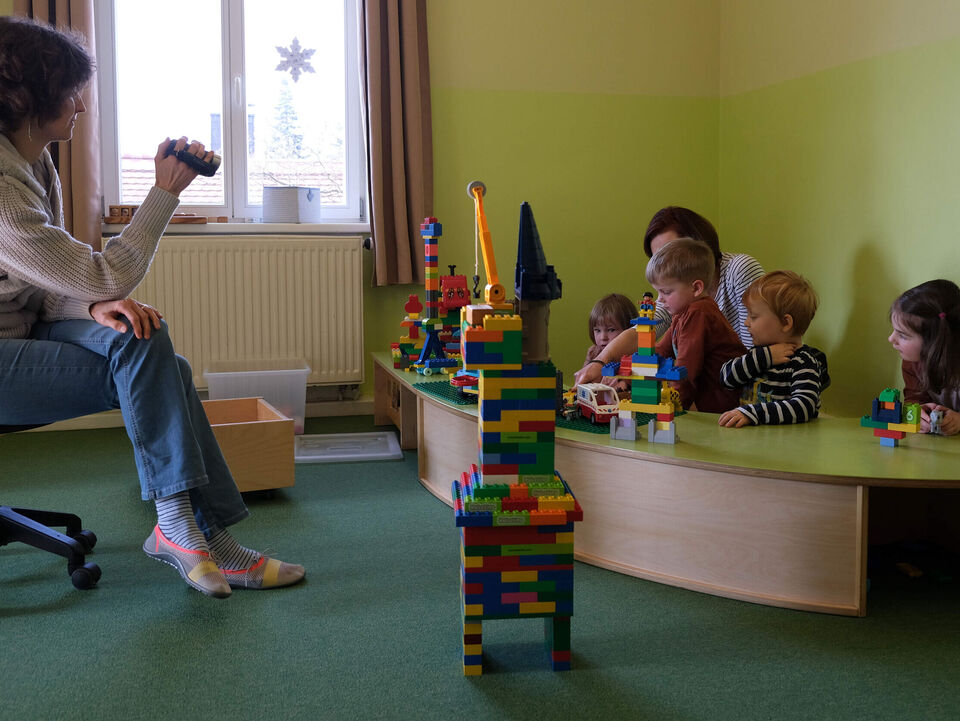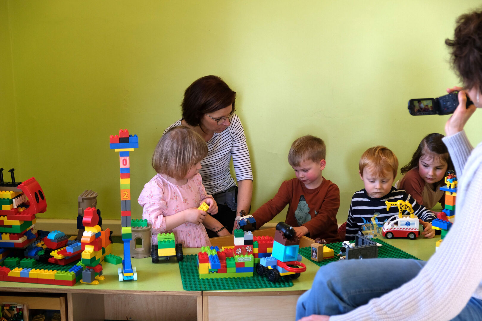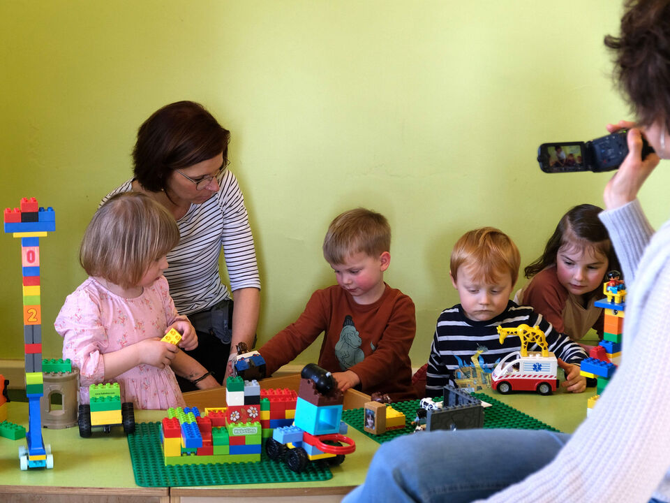 In der Bauecke der Integrativen christlichen Kita „Riesenzwerge“ geht es betriebsam zu. Vier Kinder stecken eifrig Duplo-Steine ineinander, setzen Tiere darauf, kommentieren, was sie gerade tun, fahren mit Autos an den Bauwerken vorbei, geben sich gegenseitig Teile. Erzieherin Katja Köhler sitzt mittendrin, fragt nach, hört zu, macht mit. Das alles geschieht vor der Kamera.