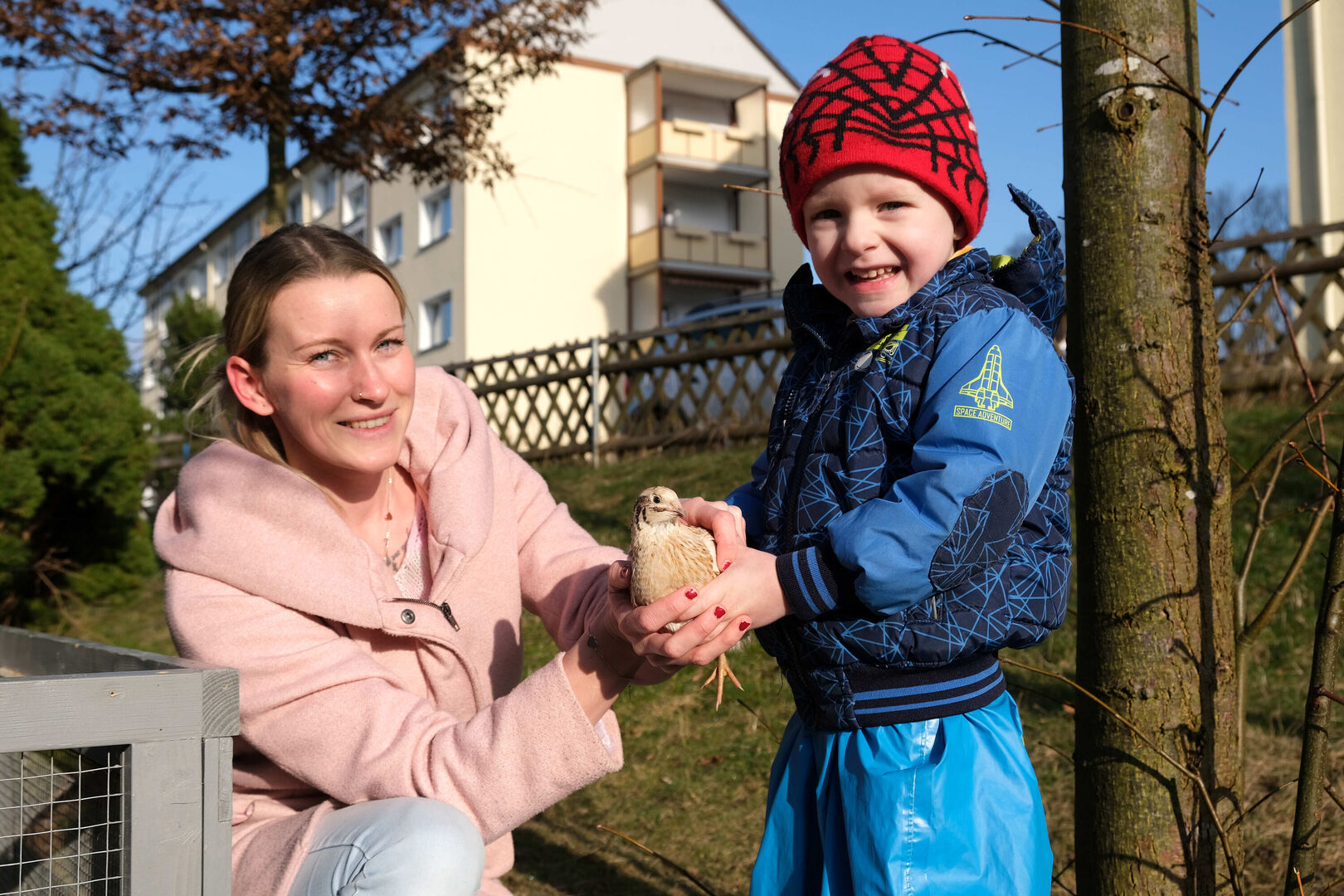 Im Naturkinderhaus Mulda ist neben dem Kinderlachen immer öfter auch Piepsen und Wiehern, Blubbern und Krabbeln zu hören. Denn die menschlichen Zweibeiner haben hier Gesellschaft: von Fischen und Schildkröten, afrikanischen Riesenschnecken und zuletzt Wachteln. Getreu dem Naturkonzept der Kita können die Kinder zahlreiche tierische „Mitbewohner“ versorgen, beobachten und genauer kennen lernen.