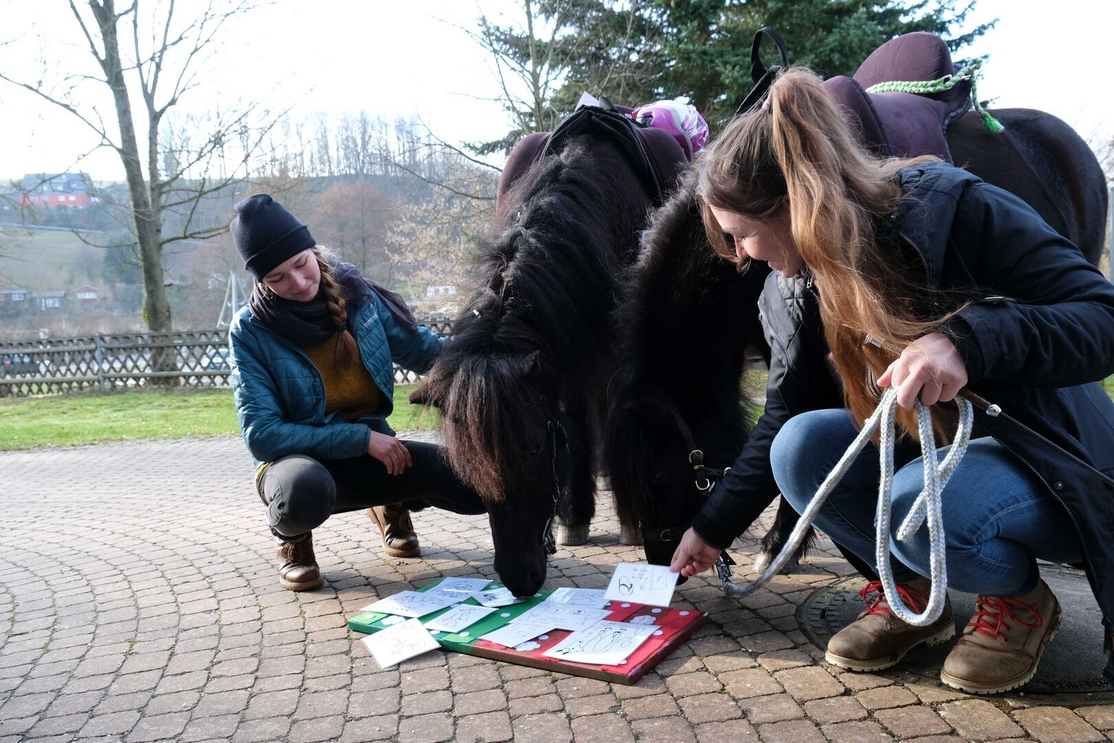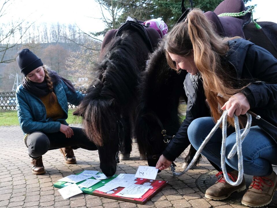 Aller 14 Tage gibt es außerdem die AG „Ponyzeit“ als Mitmachangebot am Nachmittag. Die Pferde-Mädels Helene und Rebecca kommen dann mit Neo und Loui in den Garten des Naturkinderhauses. Schon der Anblick der zwei Ponys begeistert die Kinder. Allerdings müssen sie sich zurückhalten, denn Helene und Rebecca vermitteln zuerst die Regeln im Umgang mit den Ponys.