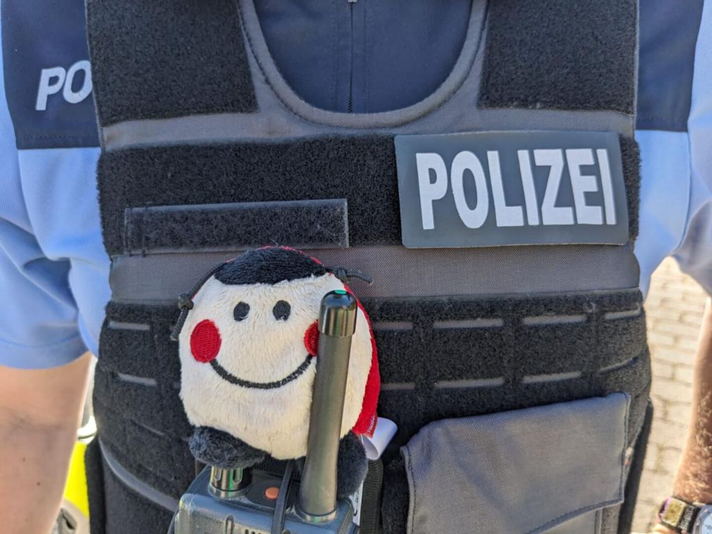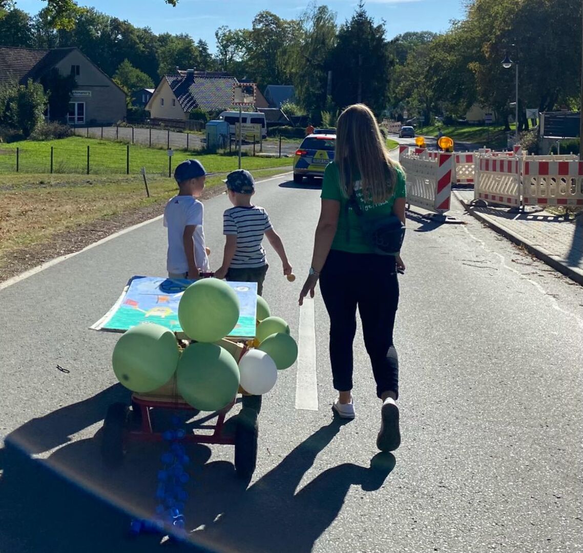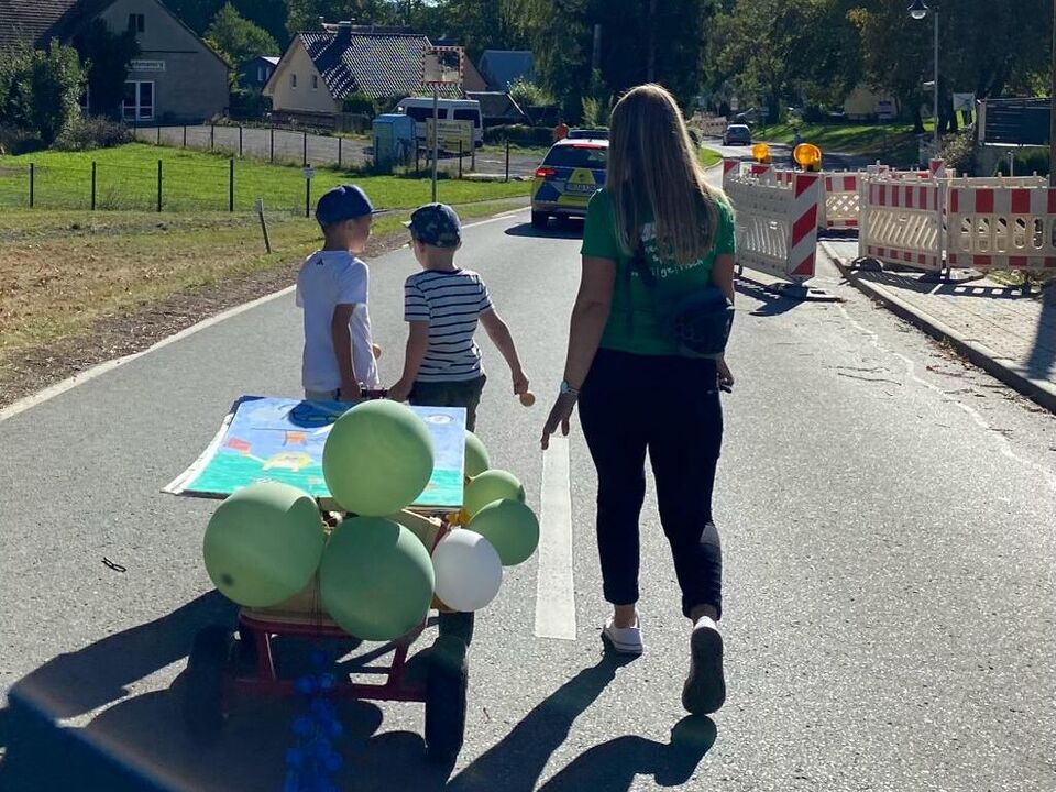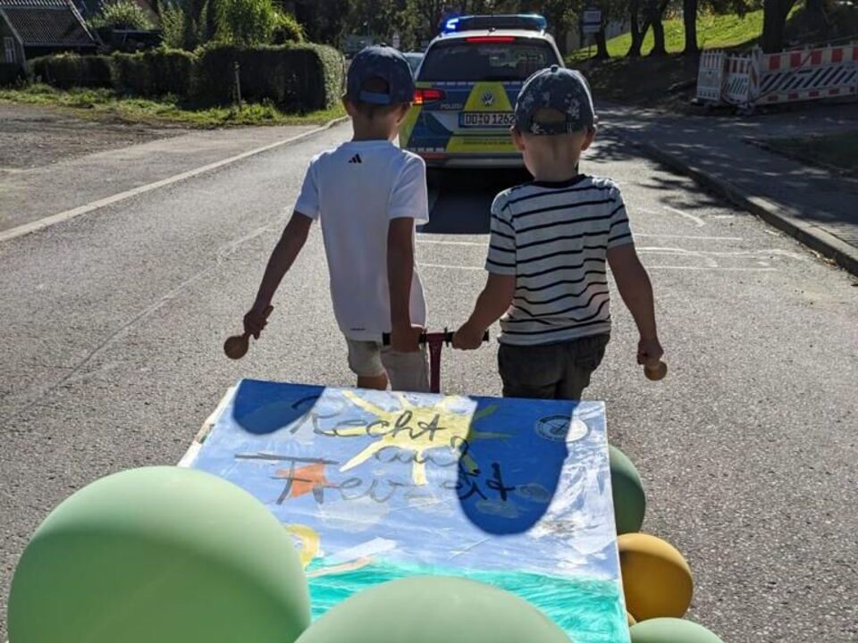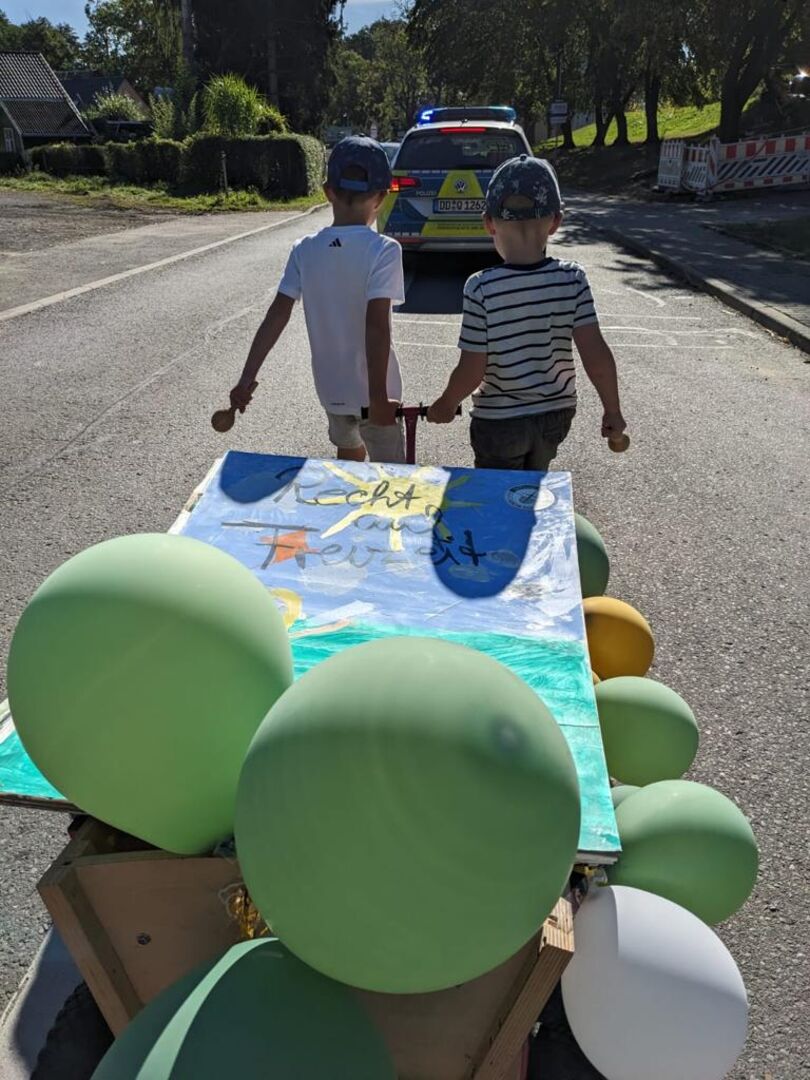 Mit Polizeischutz und ihren selbst gestaltenen Kinderrechte-Plakaten zogen die größeren Kinder der Kita „Sonnenkäfer“ zum Weltkindertag durch den Ort.