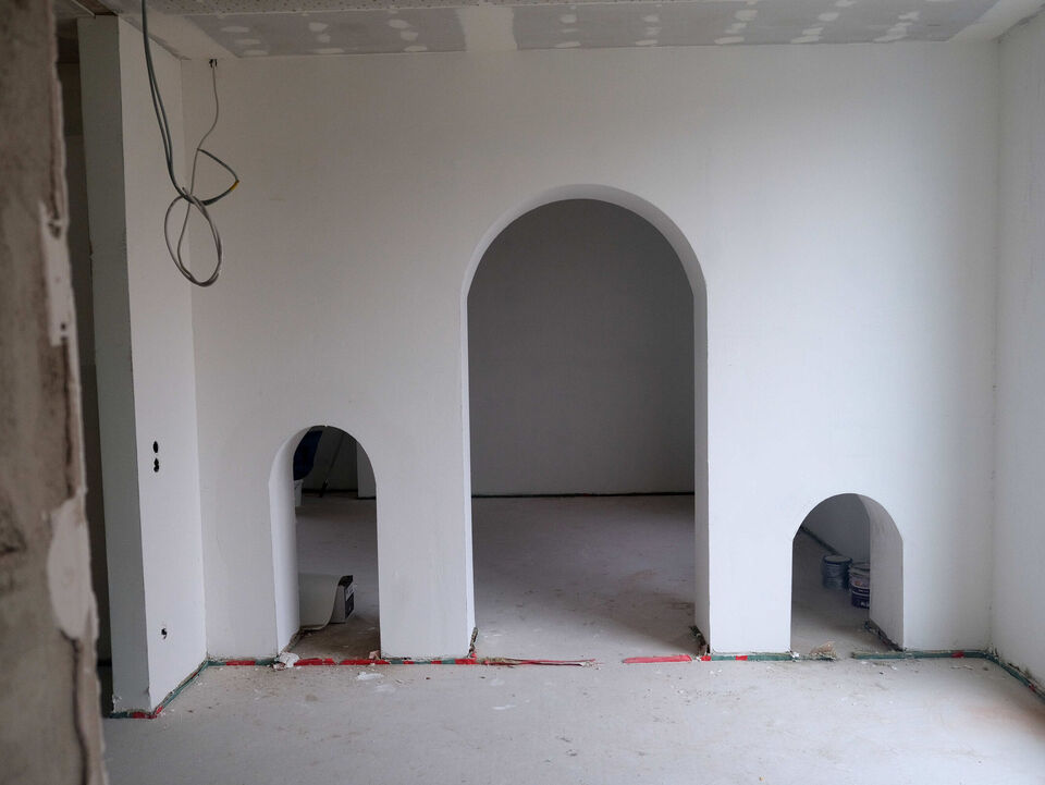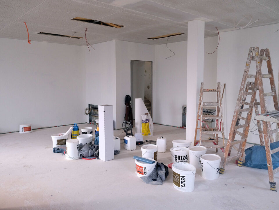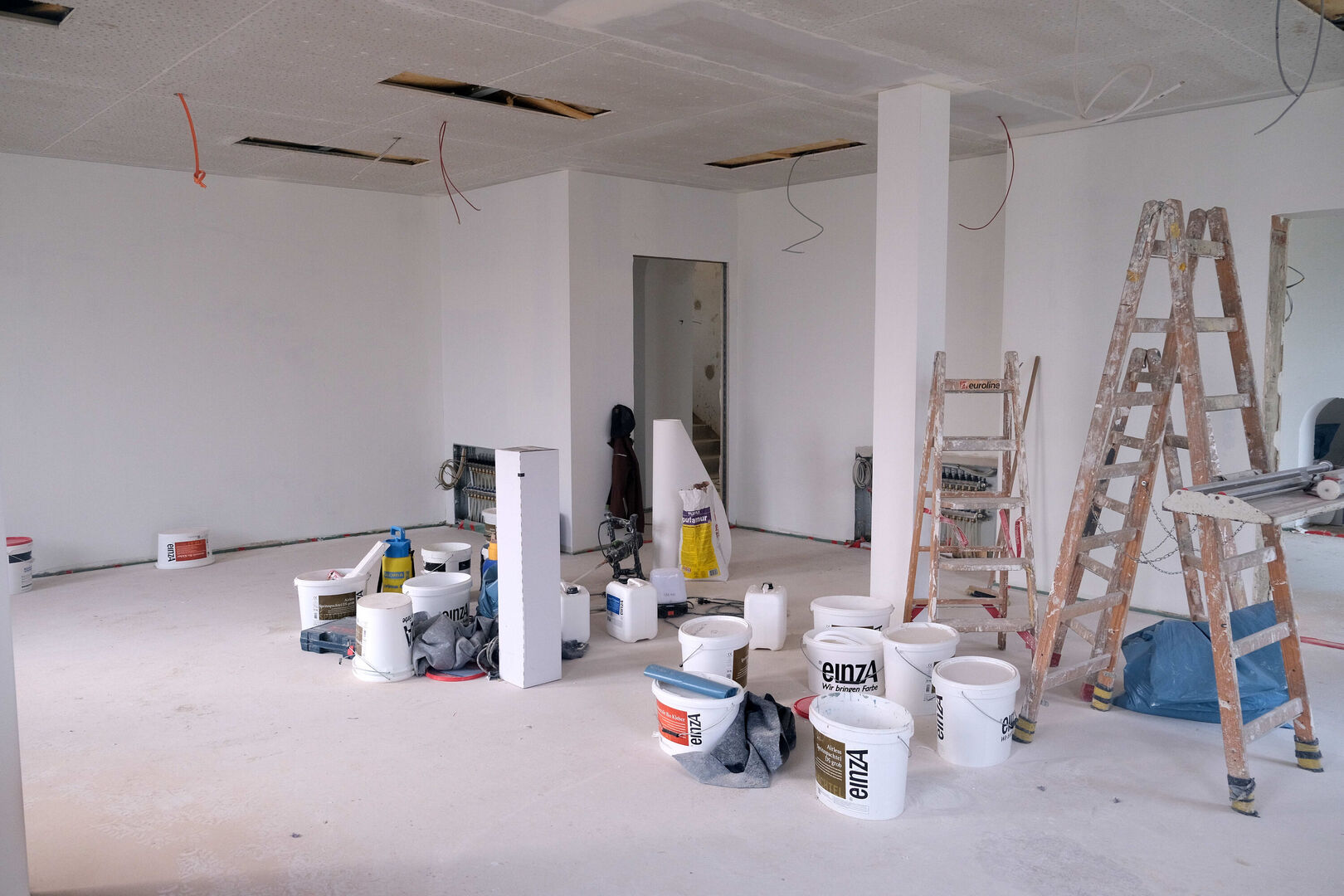 Der Innenausbau ist in vollem Gange: Maler- und Fliesenlegearbeiten auf allen Etagen gehen voran, Lampen, Steckdosen und Sanitärartikel werden derzeit montiert.