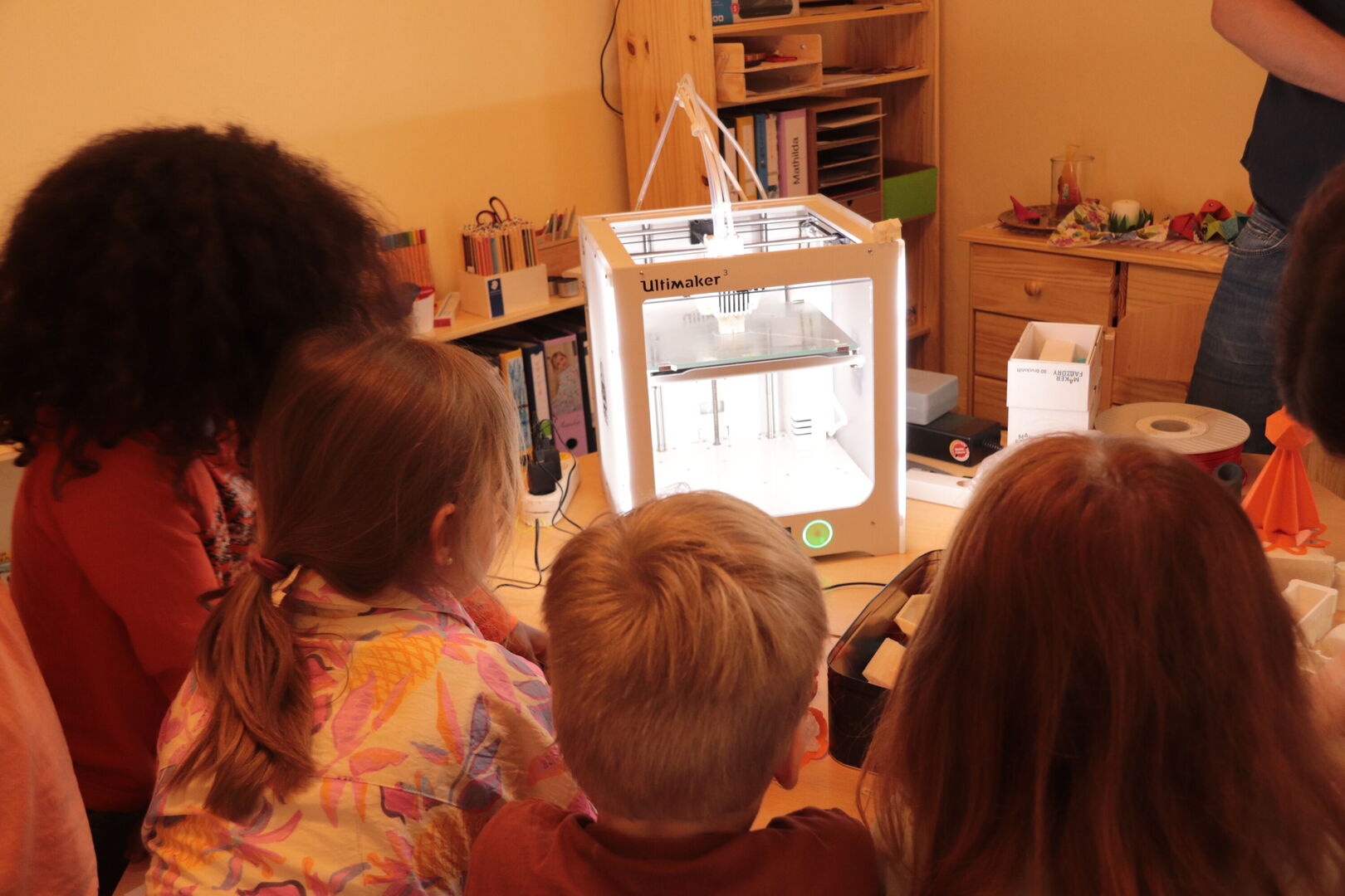 Mit ihren eigenen Augen konnten die Kinder beobachten, wie man ein Haus(-Modell) ausdrucken kann.