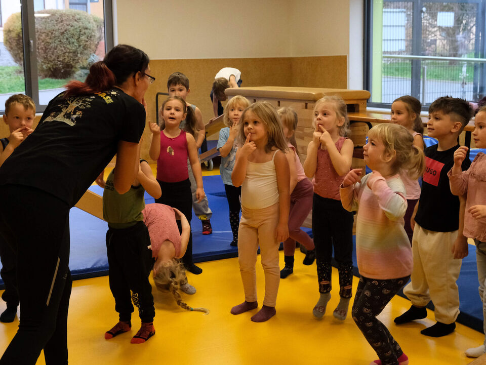 „Wenn die Kinder in der Krippe das erste Mal in meinen Sport kommen, trauen sie sich noch nicht viel zu“, so ihre Beobachtung. Mit ihrer eigenen Begeisterung steckt sie aber schon die Kleinsten an, so dass sie nach und nach mutiger werden. „Es ist toll zu beobachten, wie schnell die Kinder Fortschritte machen und sich immer mehr zutrauen.“ Die Gruppe von Vier- bis Sechsjährigen, die den Sportraum am vergangenen Donnerstag erobert hat, war erfahren genug, um die Kästen und Wippen, Rutschen und Kletterwände ohne Scheu in Angriff zu nehmen.