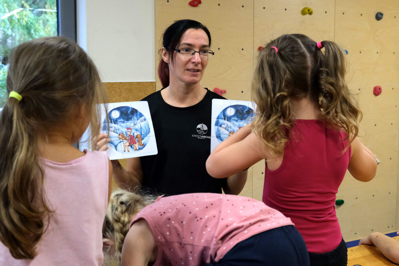 Am Ende der wilden Toberei ruft Sindy Hahn die ausgepowerten Kinder aber noch einmal zusammen. Sie hat zwei Bilder in der Hand, die den Heiligen Martin zeigen. Es sind Puzzle-Vorlagen und die einzelnen Teile dafür hat sie im Raum versteckt. Sofort gehen die Kinder auf die Suche und setzen nach und nach die Bilder zusammen. „Es ist mir wichtig, dass sich nicht nur der Körper bewegt, sondern auch das Gehirn“, erklärt die Erzieherin, „deshalb baue ich gern auch kleine kognitive Aufgaben ein.“