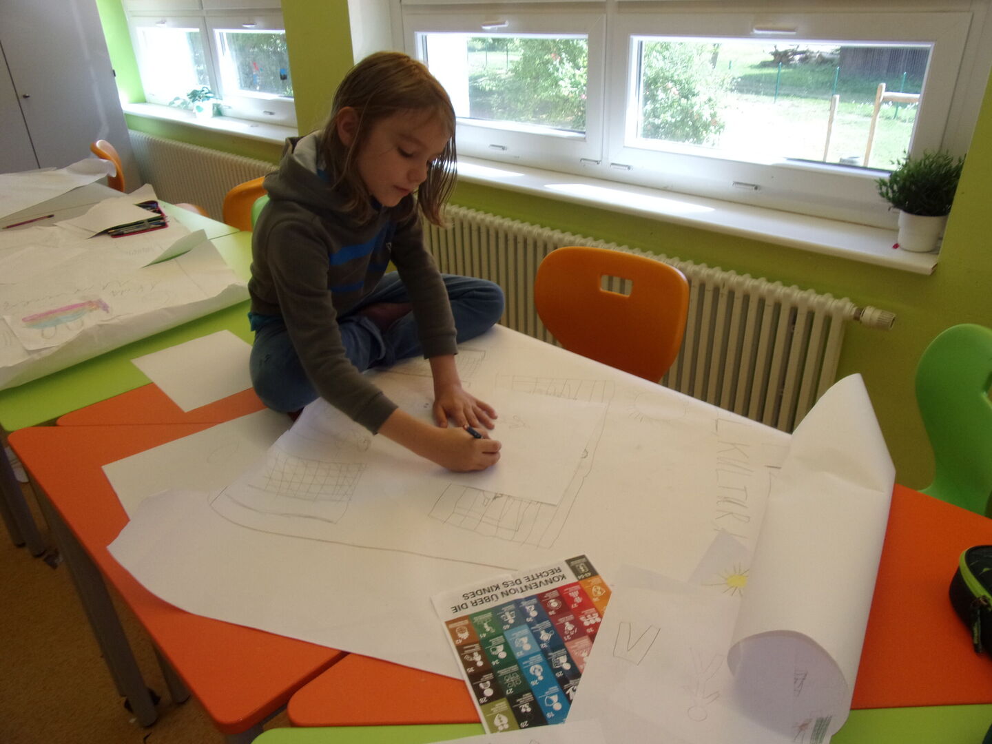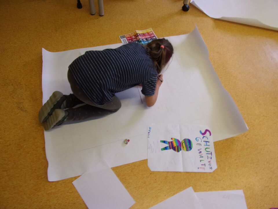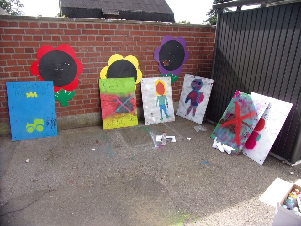 In den ersten Tagen gestalteten die Kinder ihr Motiv und übertrugen es dann auf größere Plakate, die mit den aufzuhängenden Wänden passgleich waren. Als nächstes mussten Schablonen angefertigt und ausgeschnitten werden, die notwendig sind, um beim Sprühen mit Farbe schöne und klare Umrisse zu garantieren. Im Freien, bei bestem Wetter und gut gesichert mit Mundschutz und Brille, wurden die Wände kreativ zu den Kinderrechten besprüht.
