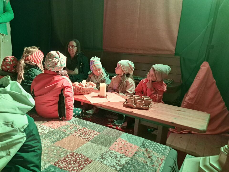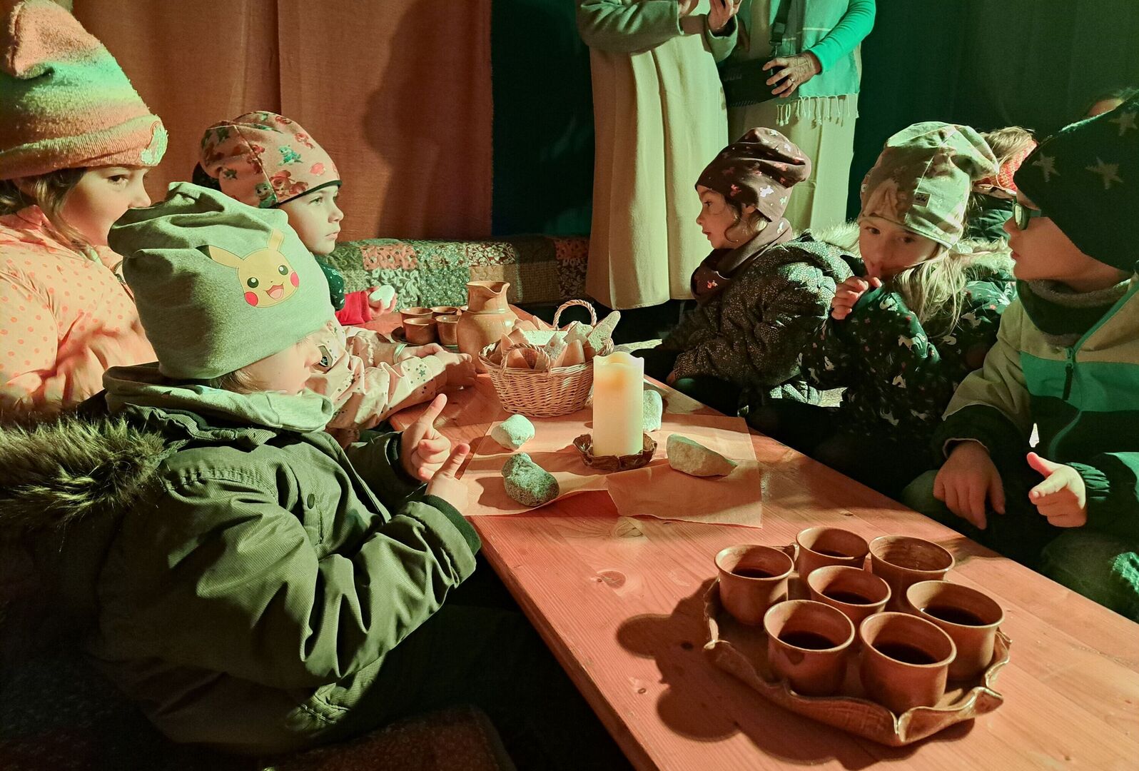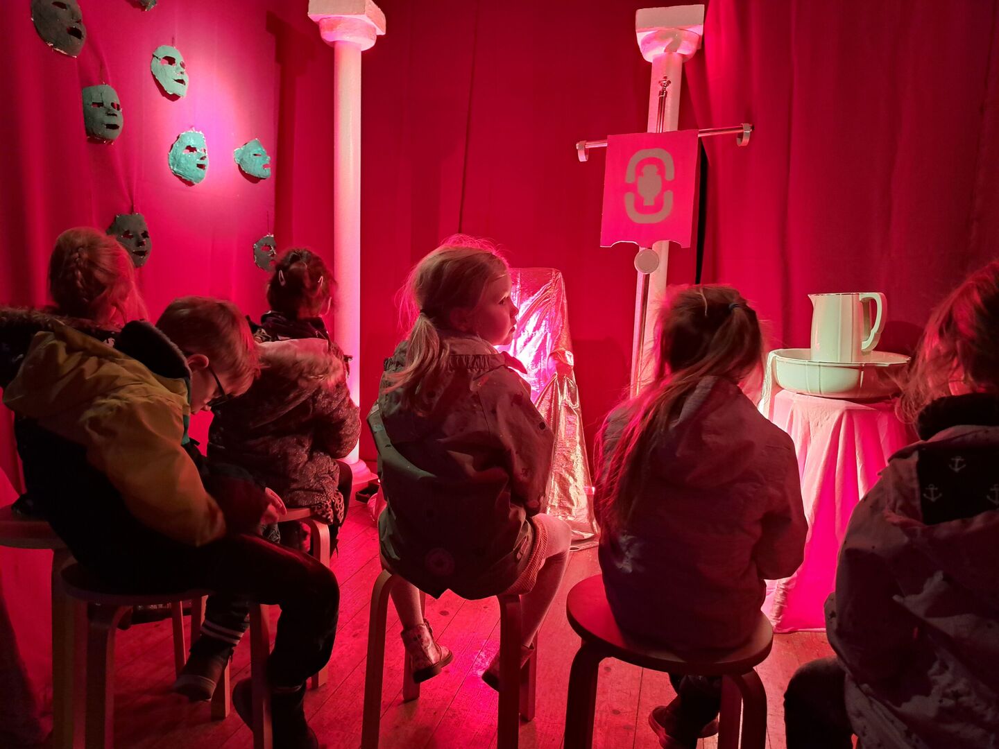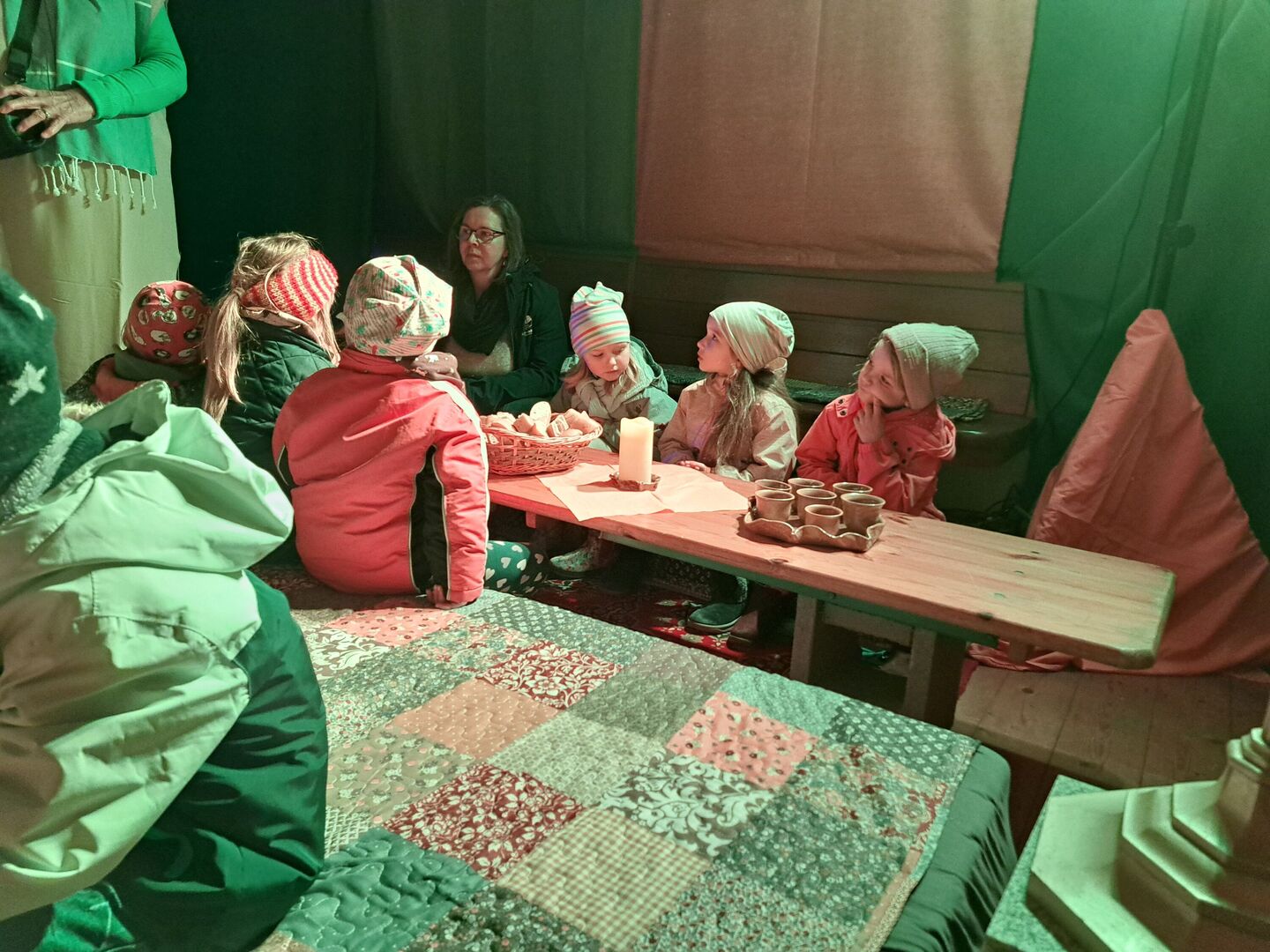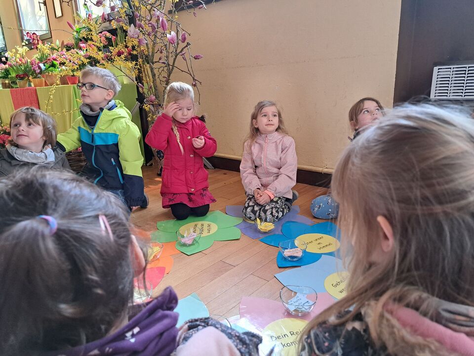 Die Kinder der Kirchenmäuse lauschen neugierig der Bibelgeschichte.