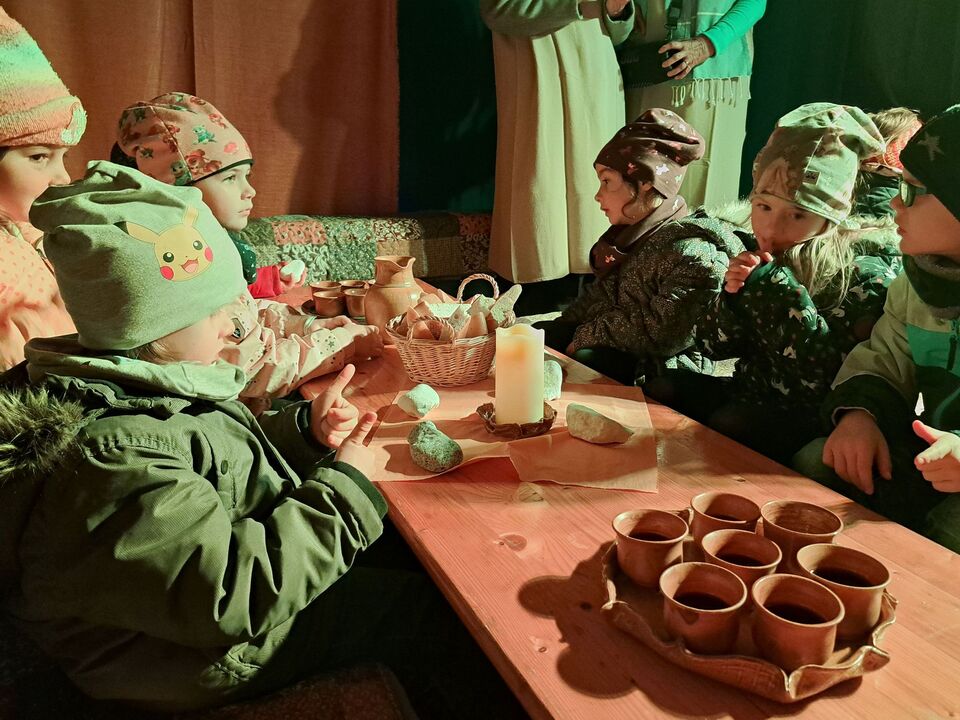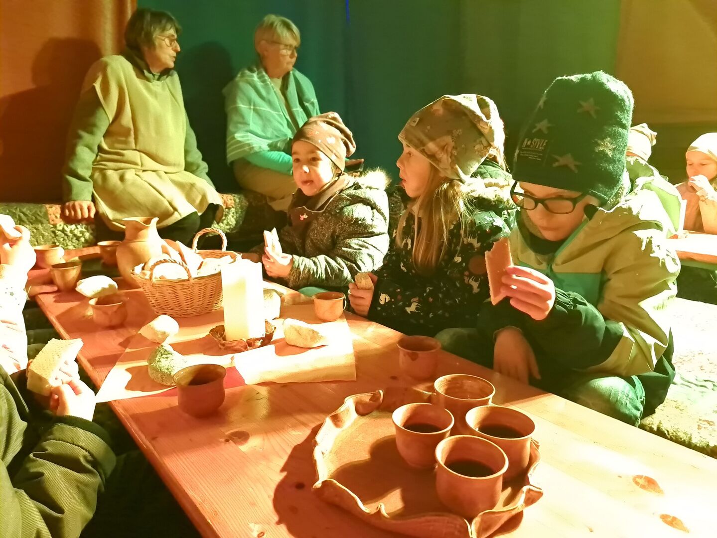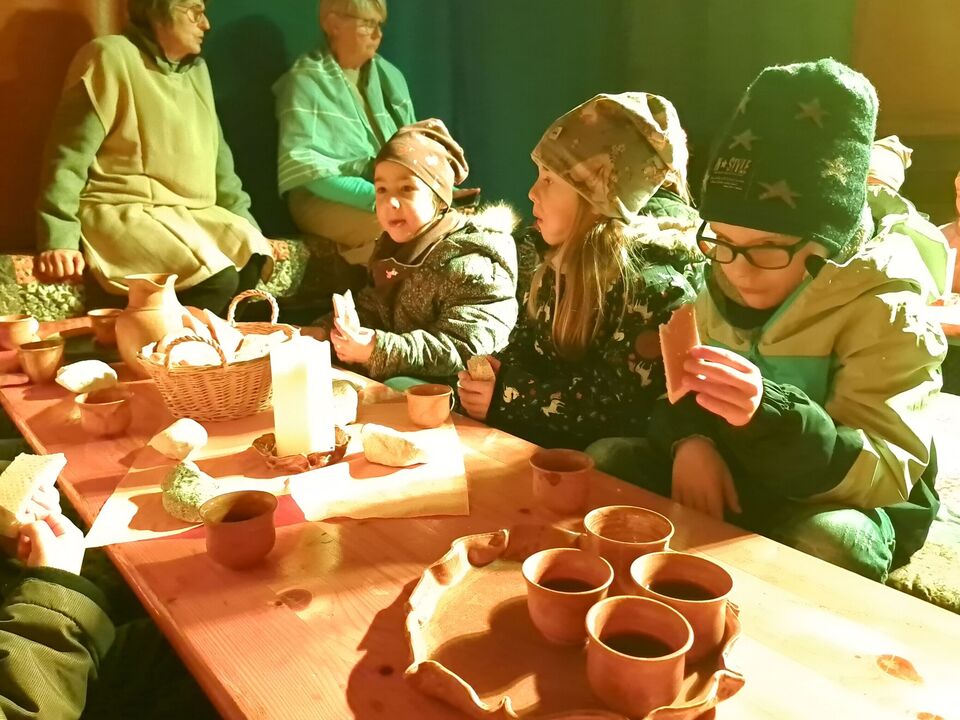 Als Symbol der Last, die wir Menschen durch kleine Lügen oder schlechte Worte und Taten auf uns nehmen, durfte jedes Kind einen Stein nehmen und ihn auf dem weiteren Weg durch den Ostergarten mit sich tragen. Jesus Geschichte führte uns hinab in den Keller der Kirche, durch kleine liebevoll hergerichtete Themenräume. Die Kirchenmäuse stiegen gespannt die Treppe hinunter und traten in einen gemütlich eingerichteten Raum mit kleinen Tischen und Sitzkissen ein. Dort feierten wir gemeinsam ein Abendmahl wie Jesus damals mit seinen zwölf Jüngern.