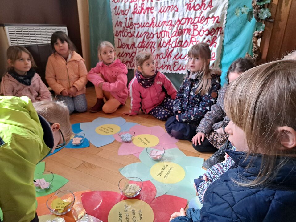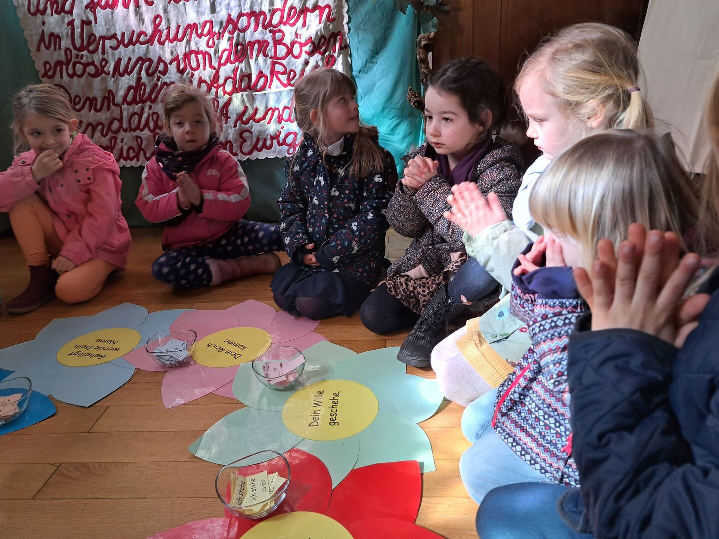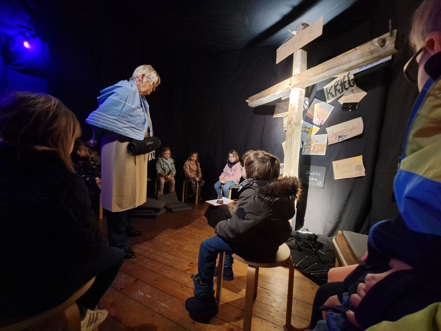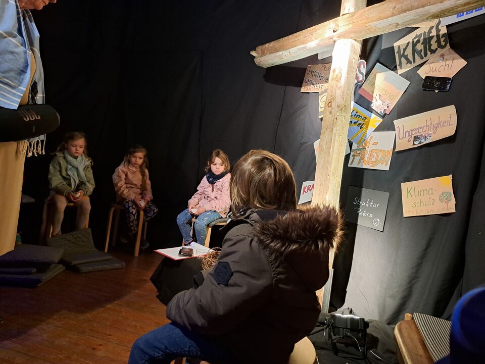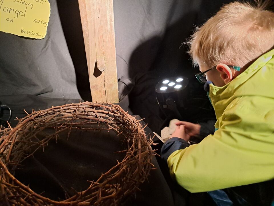 Doch Licht und Wärme streute der Gedanke, dass Jesus während dieses düsteren Moments in seinen Augen ganz viel Liebe trug und sich freute, zu Gott seinem Vater in den Himmel zu kommen, um von dort auf all uns Menschen aufzupassen. Symbolisch legten die Kirchenmäuse-Kinder ihre Steine, also alle getragenen Lasten am Kreuz vor Jesus ab.