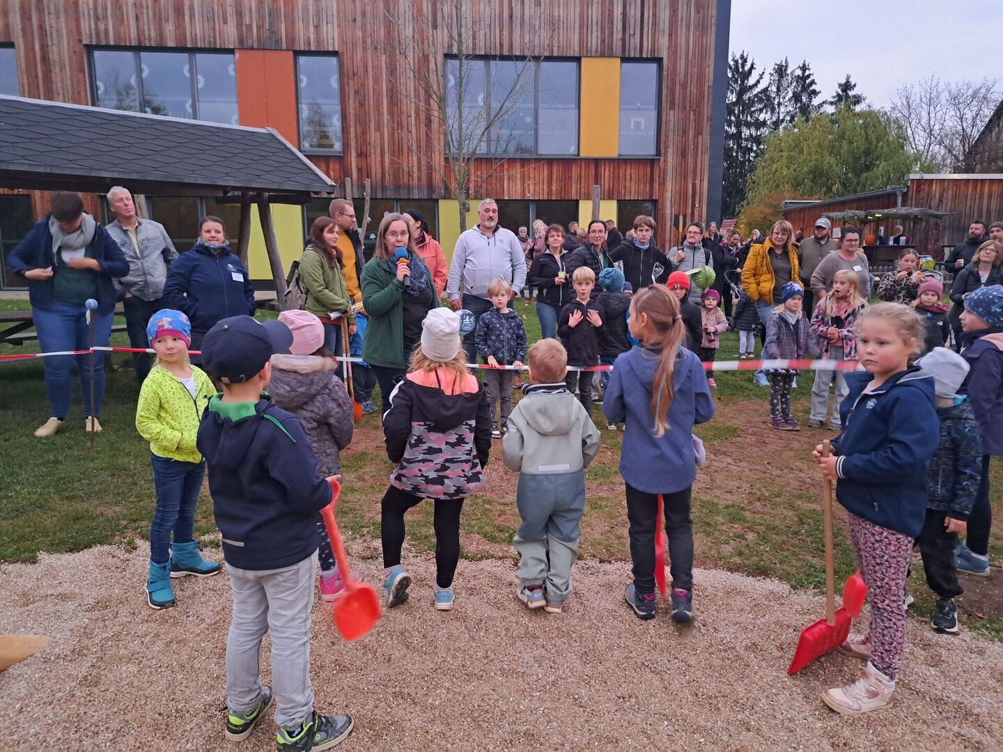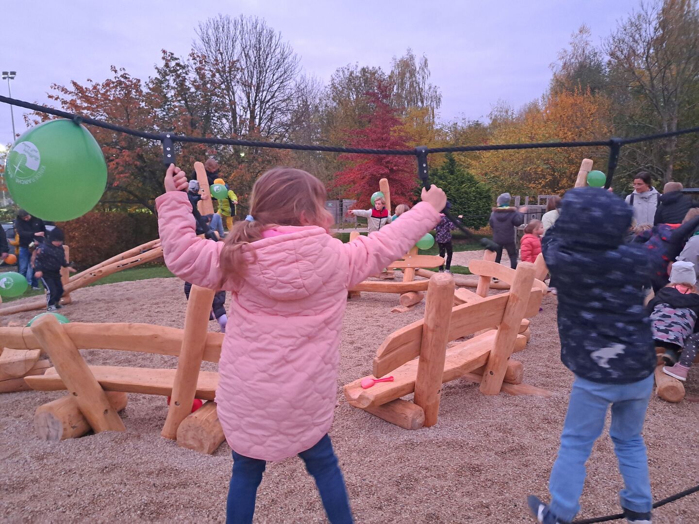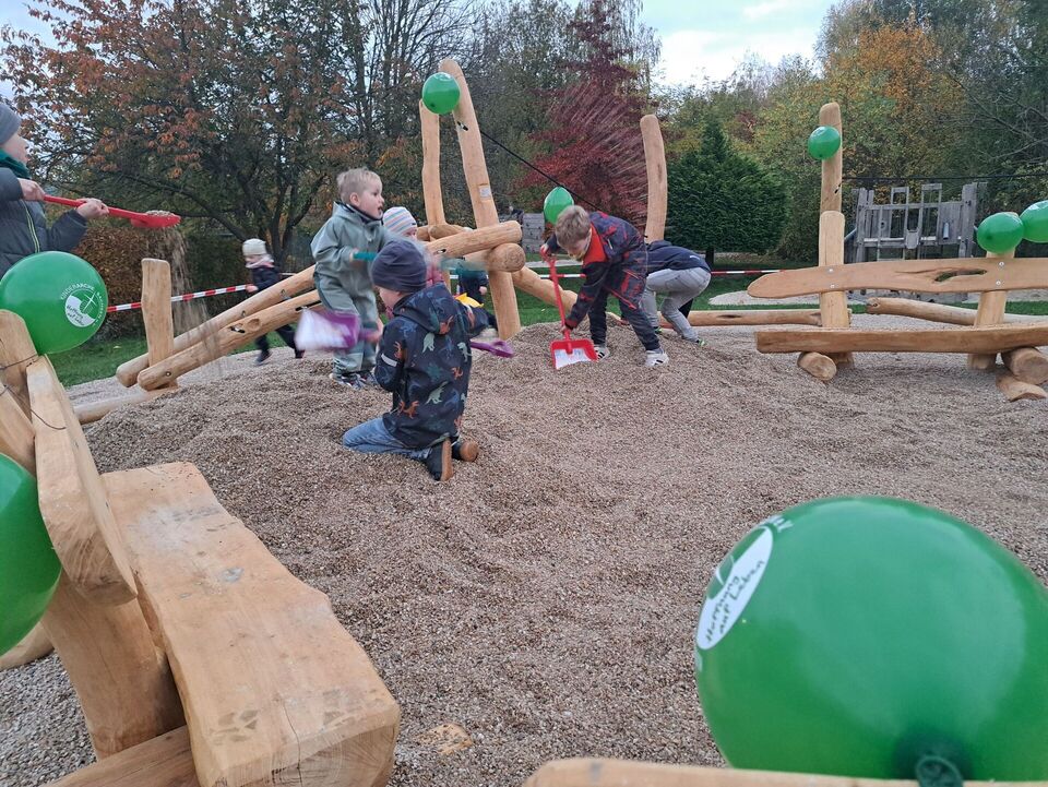 Anlässlich unseres traditionellen Herbstfestes fanden sich kurz vor Einbruch der Dunkelheit viele fleißige kleine Helferlein mit kunterbunten Schaufeln, um zwei „riesige Berge“ Fallschutzkies so zu verteilen, dass der neue Kletter- und Sitzbereich ein sicherer Ort für alle Kinder sein wird. Dieses abwechslungsreiche Spielgerät wurde eigens für die Bedürfnisse der Kinder unserer Kita durch die Firma „Freiholzgestaltung Drese“ entworfen und erbaut. Natürlich sorgte die Firma Schaffer & Neumann bereits vor der TüV-Abnahme für einen ordnungsgemäßen Fallschutz, aber um die gemütlichen Sitzbänke aus Robinie herum konnten wir eine Beteiligung unserer hilfsbereiten Kinder ermöglichen.
