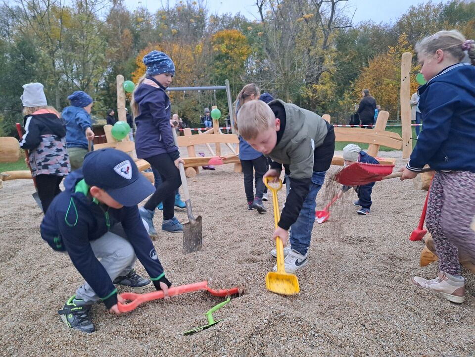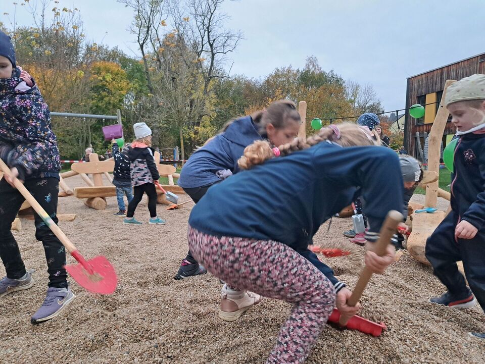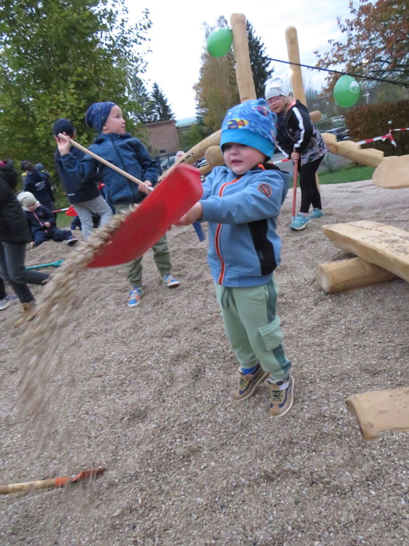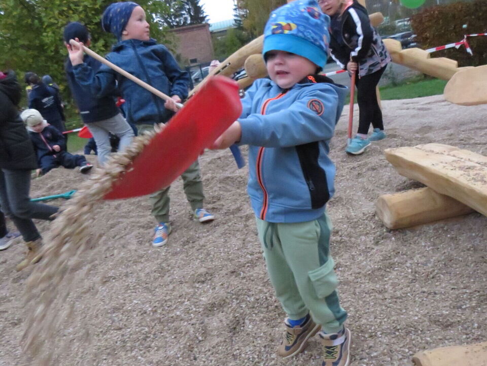 Zu Beginn unseres Herbstfestes und vor der Einweihung unserer neuen Spiel- und Ruhelandschaft halfen viele fleißige Kinder den Fallschutzkies "fachkundig" zu verteilen.