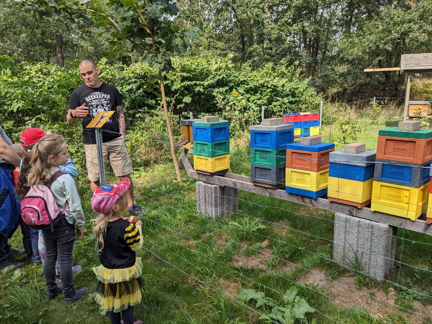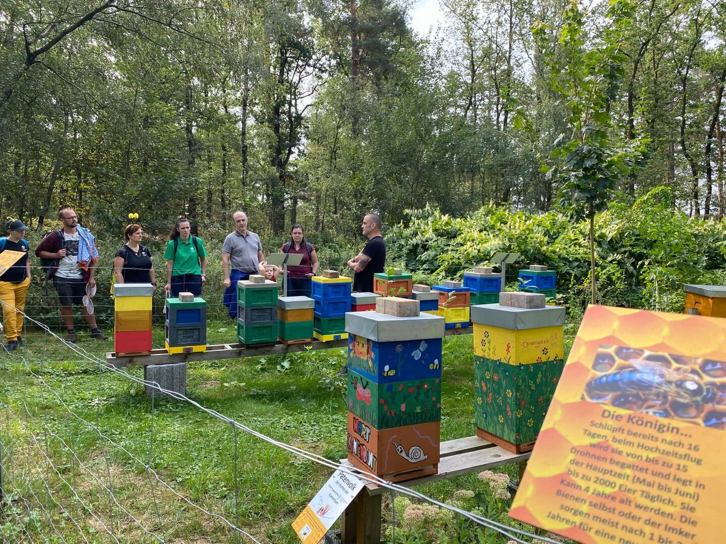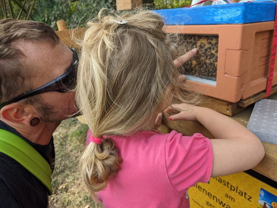Dort angekommen wurden wir von Herrn Alexander Uhlig und seiner Frau Elke begrüßt. Die beiden leidenschaftlichen Hobbyimker erklärten den Familien, wie es in so einem Bienenstock aussieht, wie Bienen die Wärme darin erhalten können, wie sie ihre Larven großziehen und welche Charaktereigenschaften eine gute Bienenkönigin haben muss, um erfolgreichen Ertrag zu bringen.
