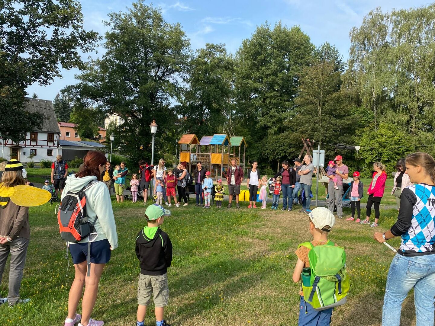 Bei wunderschönem Sonnenschein trafen sich am Samstag 18 Familien mit insgesamt 35 Kindern zur traditionellen Familienwanderung der Kita „Sonnenkäfer“. In diesem Jahr ging es auf Bienentour durch den Ortsteil Hilbersdorf. Startpunkt war der Spielplatz, auf dem erst einmal die Wanderkarten ausgegeben wurden, damit sich auf der Tour niemand verläuft. Anschließend sangen wir alle gemeinsam ein Bienenlied, um uns einzustimmen. Mit Wanderkarte in der Hand ging es, stets den Pfeilen auf der Straße folgend, einen großen Berg hoch. Oben angekommen konnten sich alle Wanderer mit köstlichem alkoholfreien Kindermet erfrischen.
