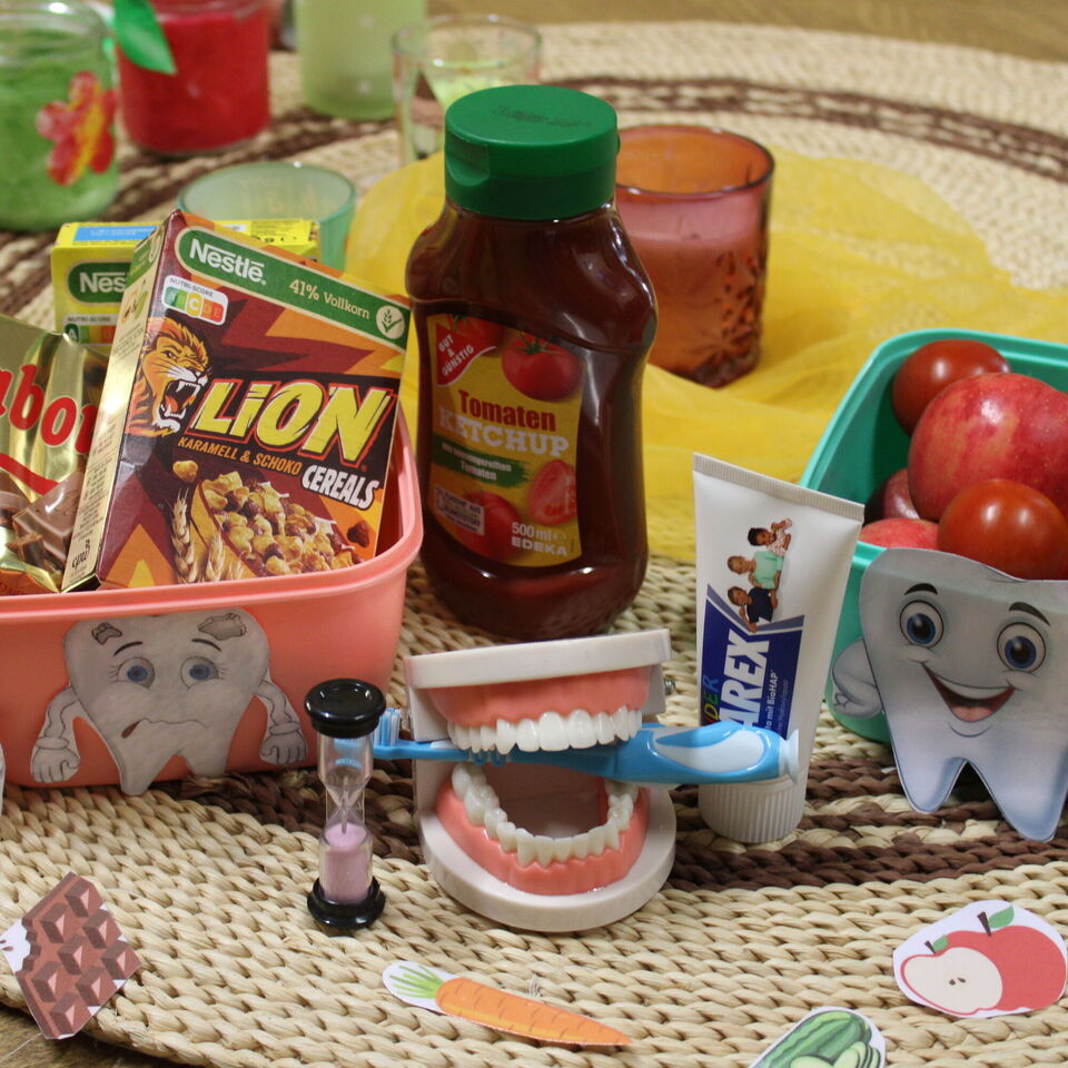 In unserer großen Runde kamen viele Fragen auf. „Welche Lebensmittel sind gesund und stärken unsere Zähne?“ „Welche Lebensmittel schaden unseren Zähnen, wenn man zu viel von ihnen isst und die Zähne danach nicht gründlich putzt?“ Gemeinsam sammelten wir Antworten. Wir ordneten verschiedene Lebensmittel nach gesund und ungesund für unsere Zähne. Mit dem Fingerspiel vom „Zahnbürstenmann“ ging unser Morgenkreis zu Ende.