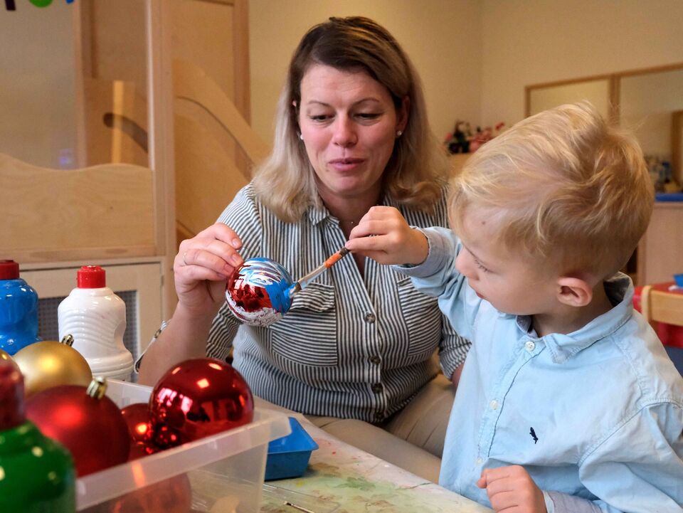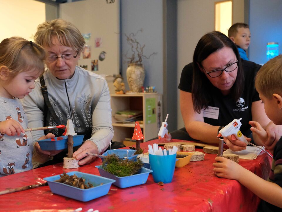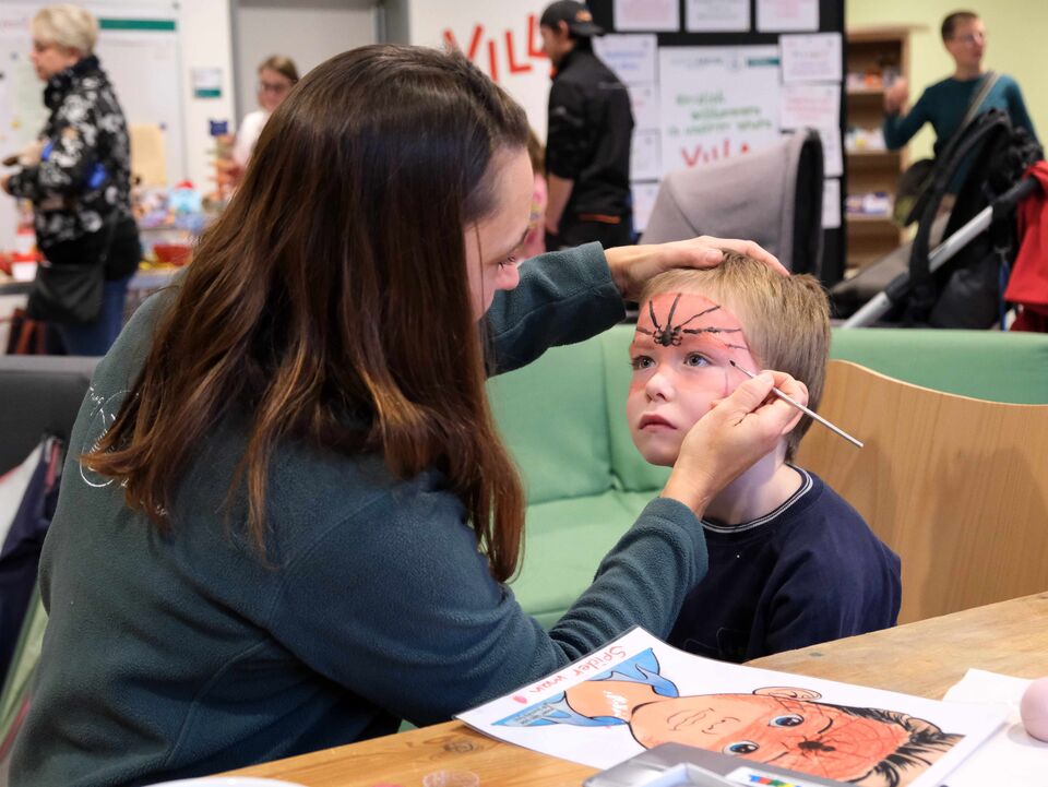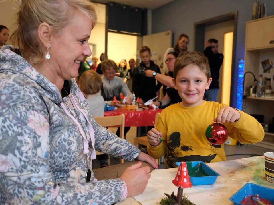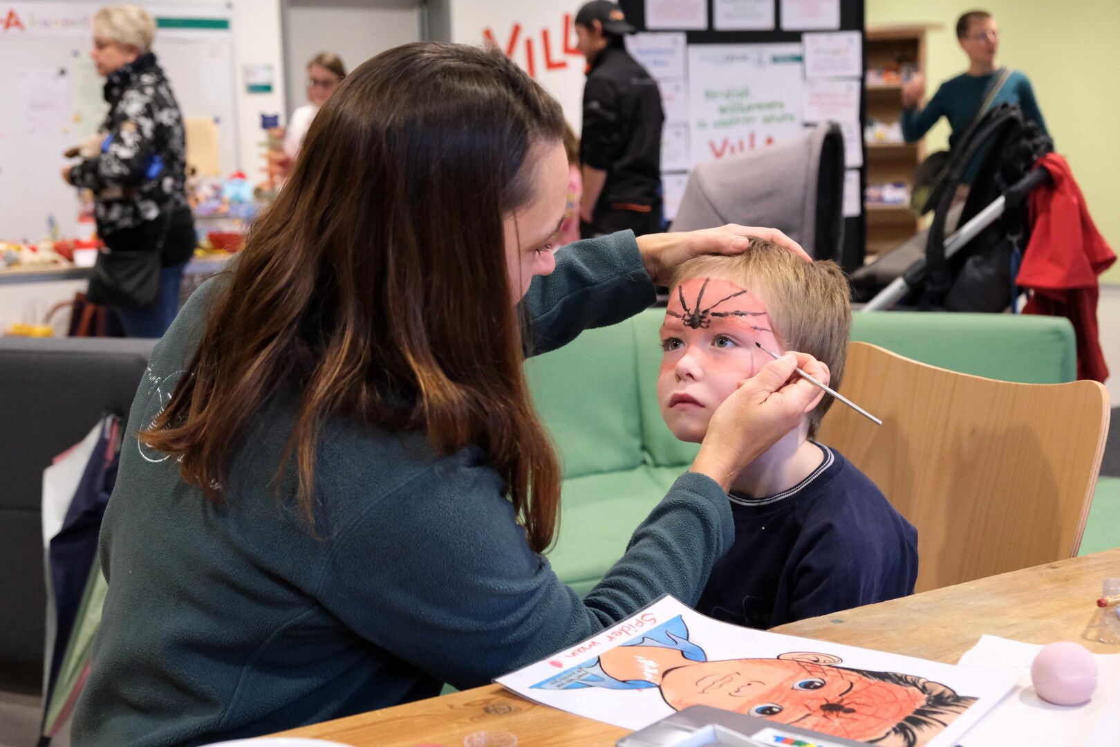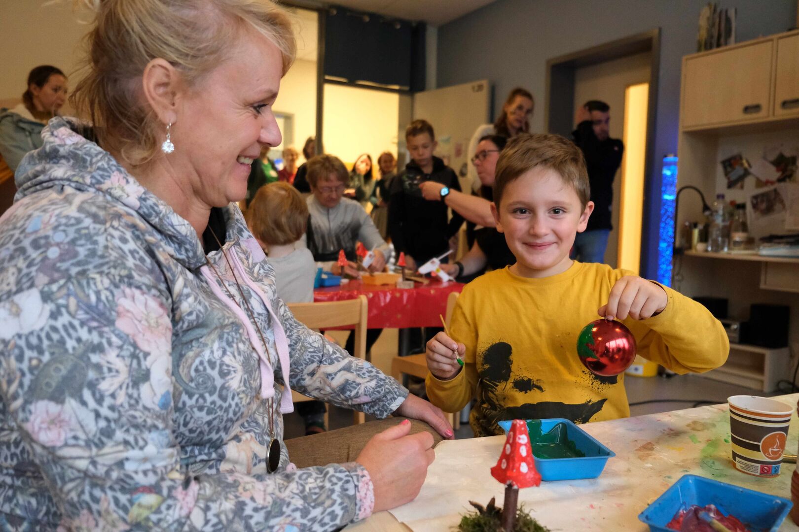 Dann wurden das Kuchenbuffet mit einer beachtlichen Geburtstagstorte und das kunterbunte Treiben im ganzen Haus eröffnet. In allen Bereichen konnten die Kinder mit ihren Eltern Kaffeetrinken, spielen und an zahlreichen Stationen weihnachtliche Basteleien anfertigen: vom Papiertannenbaum über selbst angemalte Baum-Kugeln bis hin zu Tischschmuck aus Naturmaterialien. Im Foyer wartete eine große Tombola und ein Kinderschminktisch auf die Mädchen und Jungen.