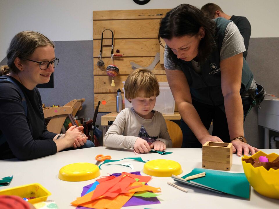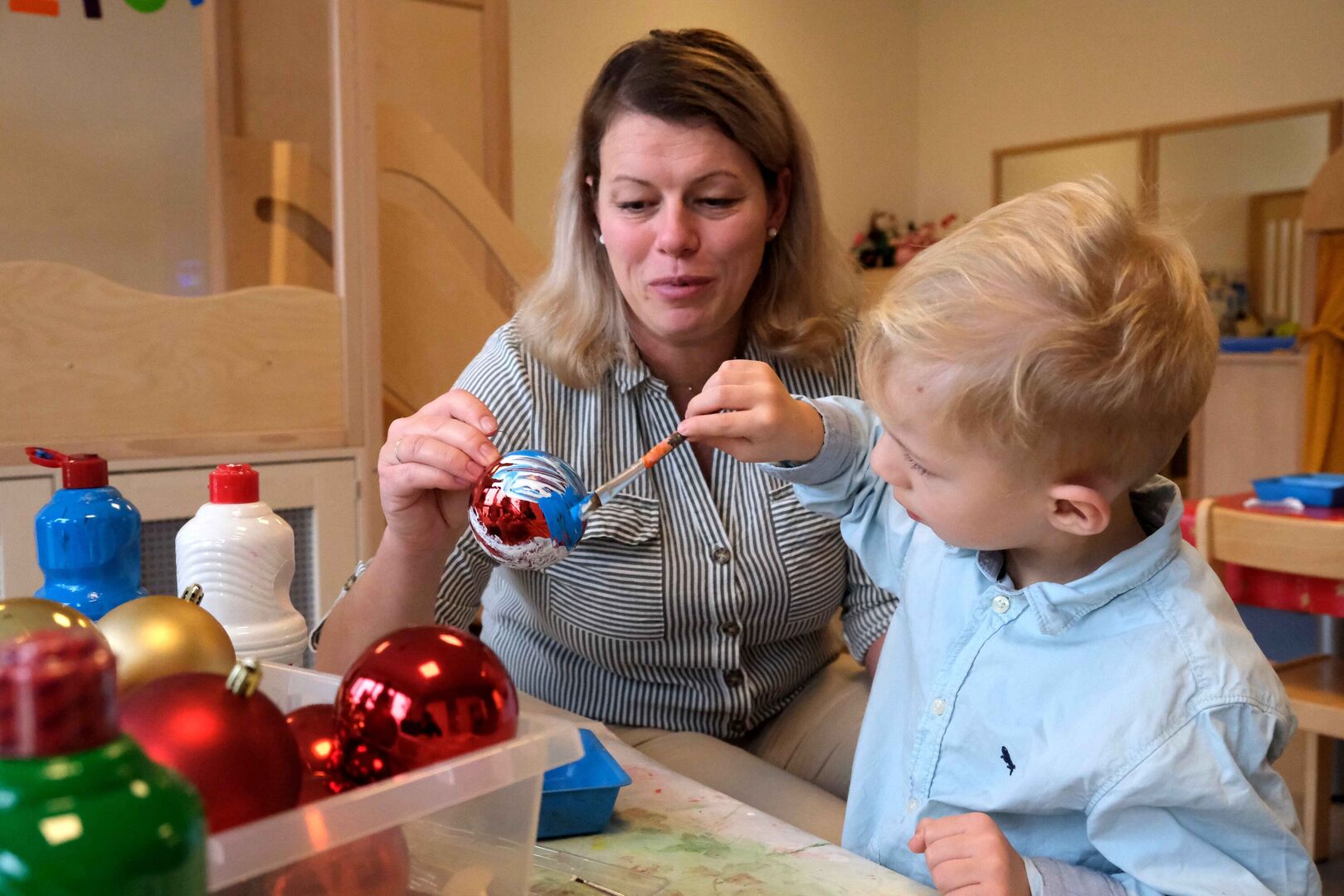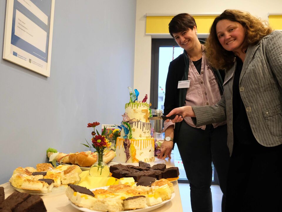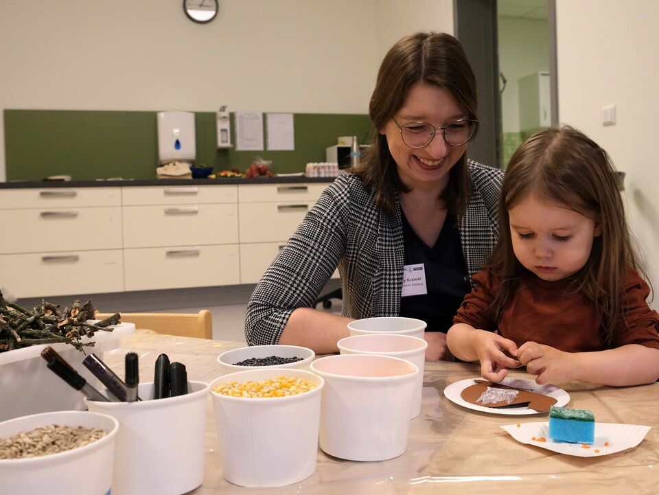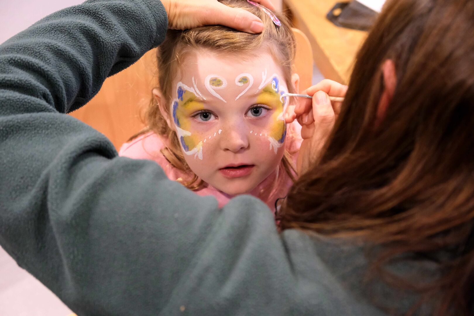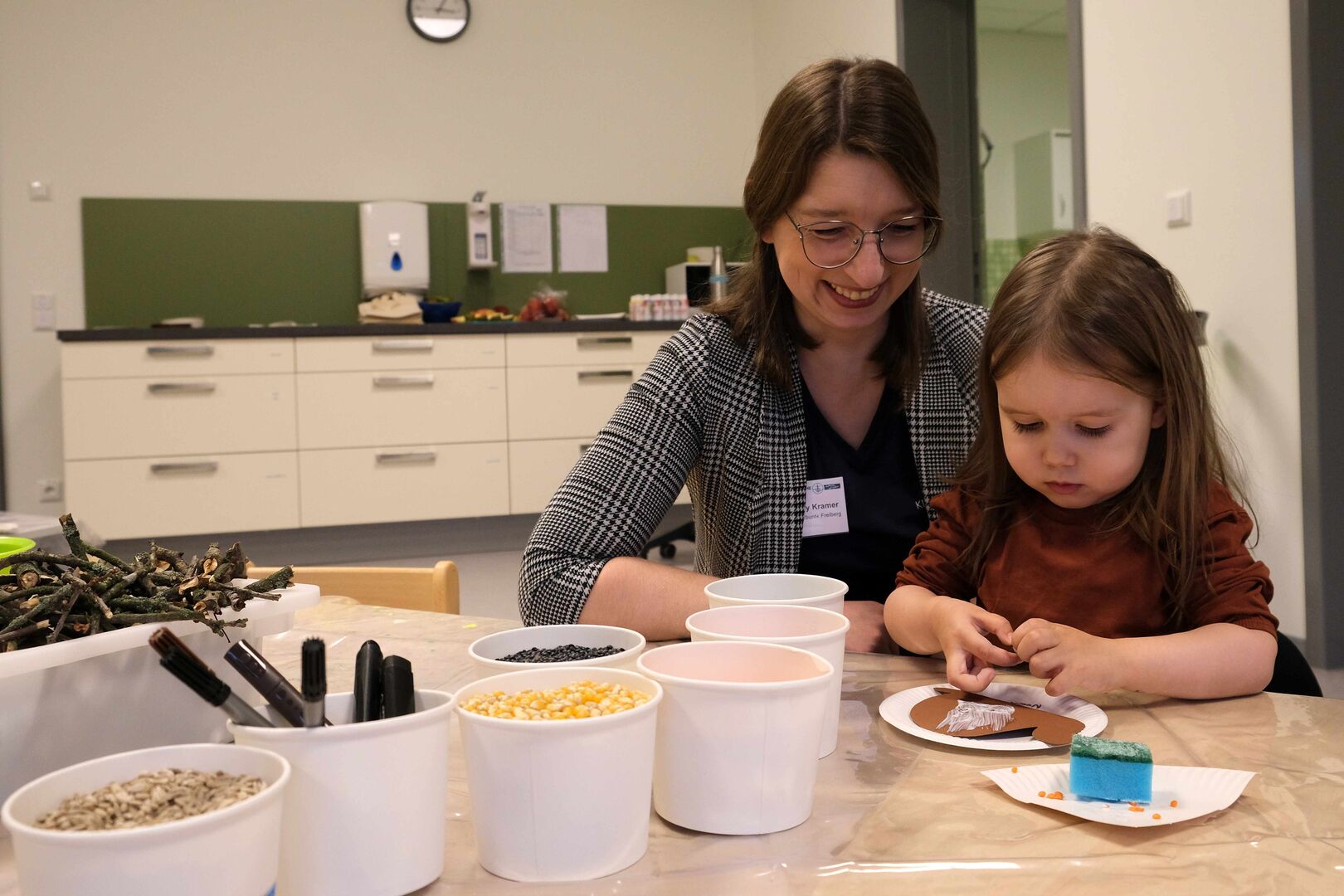 Dann wurden das Kuchenbuffet mit einer beachtlichen Geburtstagstorte und das kunterbunte Treiben im ganzen Haus eröffnet. In allen Bereichen konnten die Kinder mit ihren Eltern Kaffeetrinken, spielen und an zahlreichen Stationen weihnachtliche Basteleien anfertigen: vom Papiertannenbaum über selbst angemalte Baum-Kugeln bis hin zu Tischschmuck aus Naturmaterialien. Im Foyer wartete eine große Tombola und ein Kinderschminktisch auf die Mädchen und Jungen.