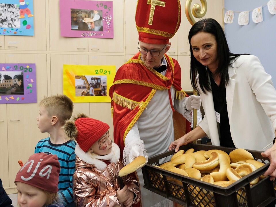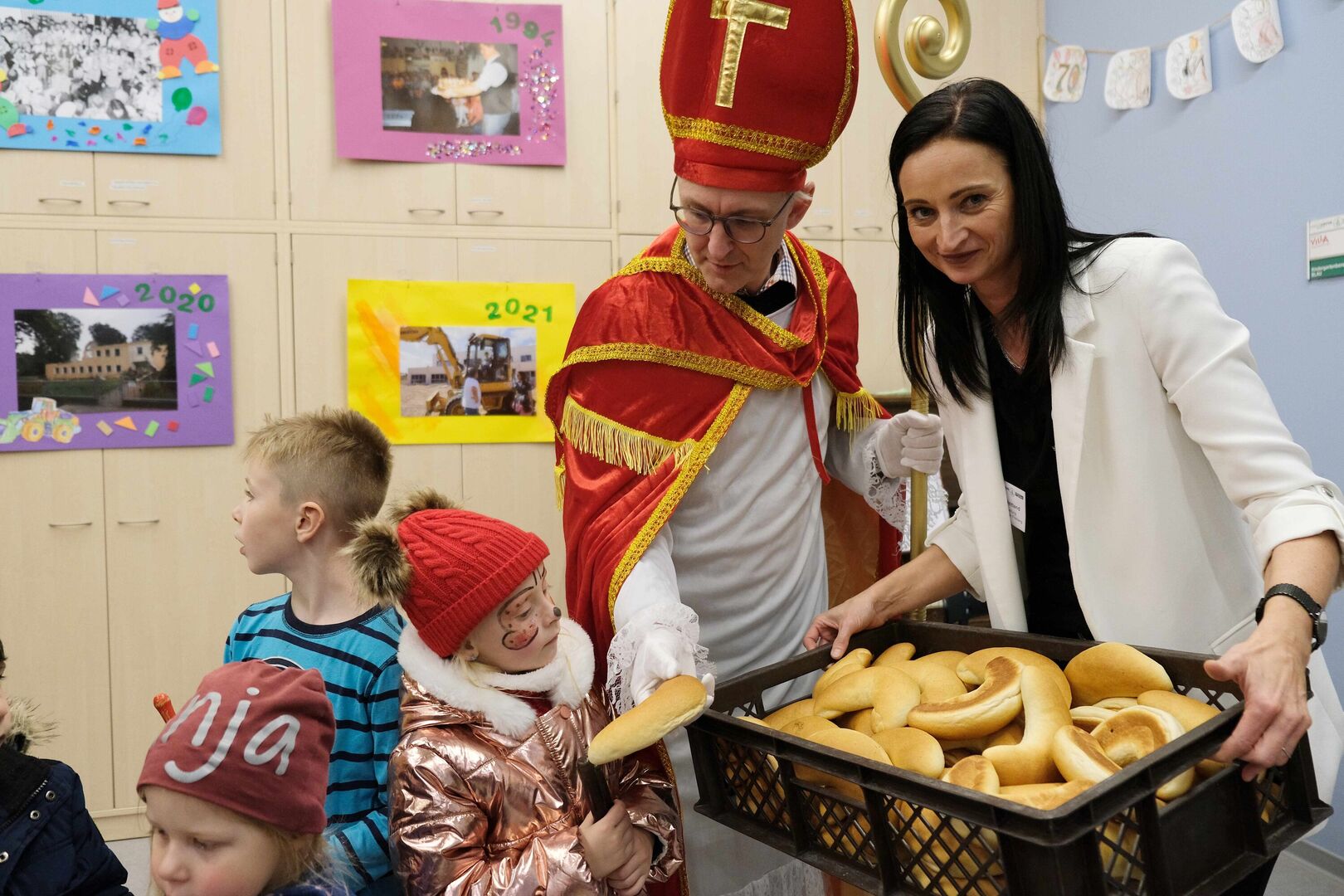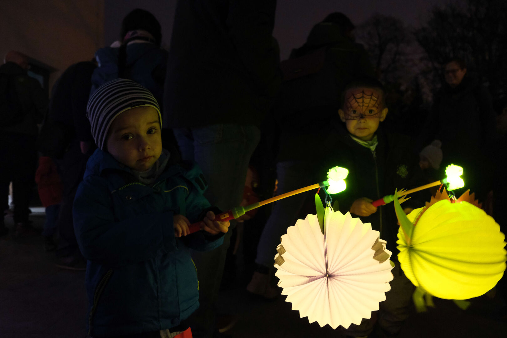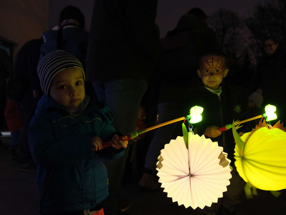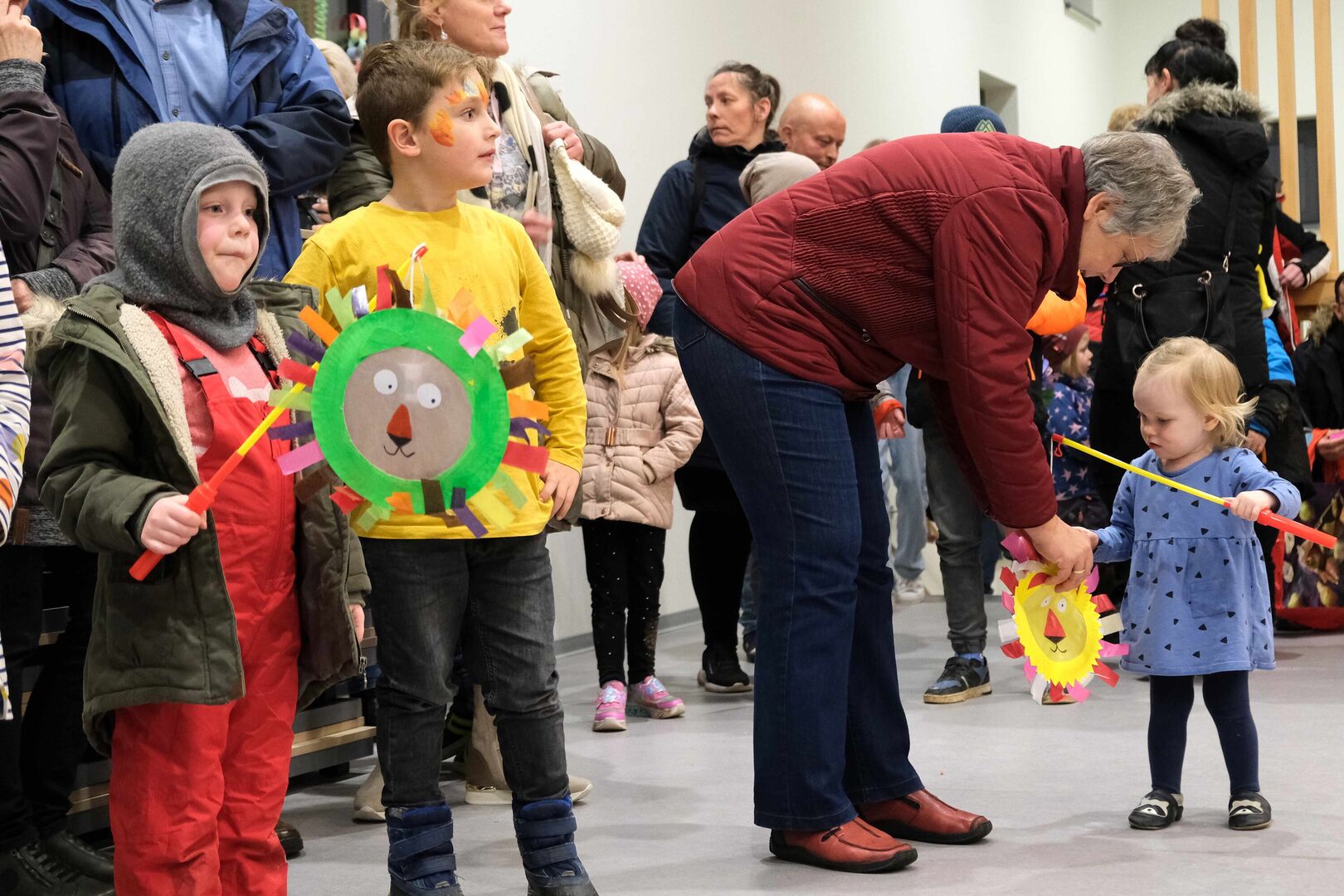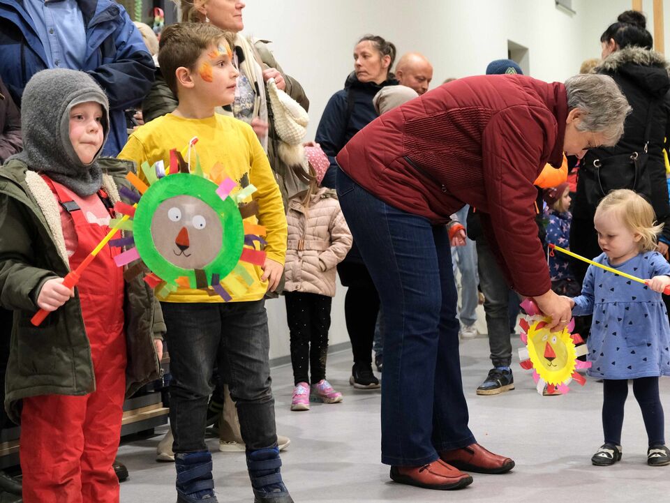 Mit Einbruch der Dunkelheit versammelten sich noch einmal alle im großen Mehrzweckraum, wo bereits der Heilige Martin (alias Dompfarrer Dr. Gunnar Wiegand) wartete, um nach einer weiteren Aufführung des Martinsstückes die traditionellen Martinshörnchen auszuteilen. Danach zogen Eltern und Kinder mit ihren Laternen in den Garten und von dort in einem langen Martinszug durchs Quartier.