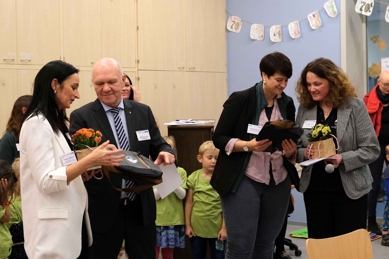 Zum Abschluss des offiziellen Programms dankte auch Kinderarche-Vorstand Matthias Lang noch einmal allen langjährigen Partnern und Freunden des Hauses und überreichte gemeinsam mit unserer neuen Kita-Fachbereichsleiterin Franziska Decker den beiden Kita-Leiterinnen Anne Maria Stahl und Franziska Weitland Blumen und ein kleines Geschenk.