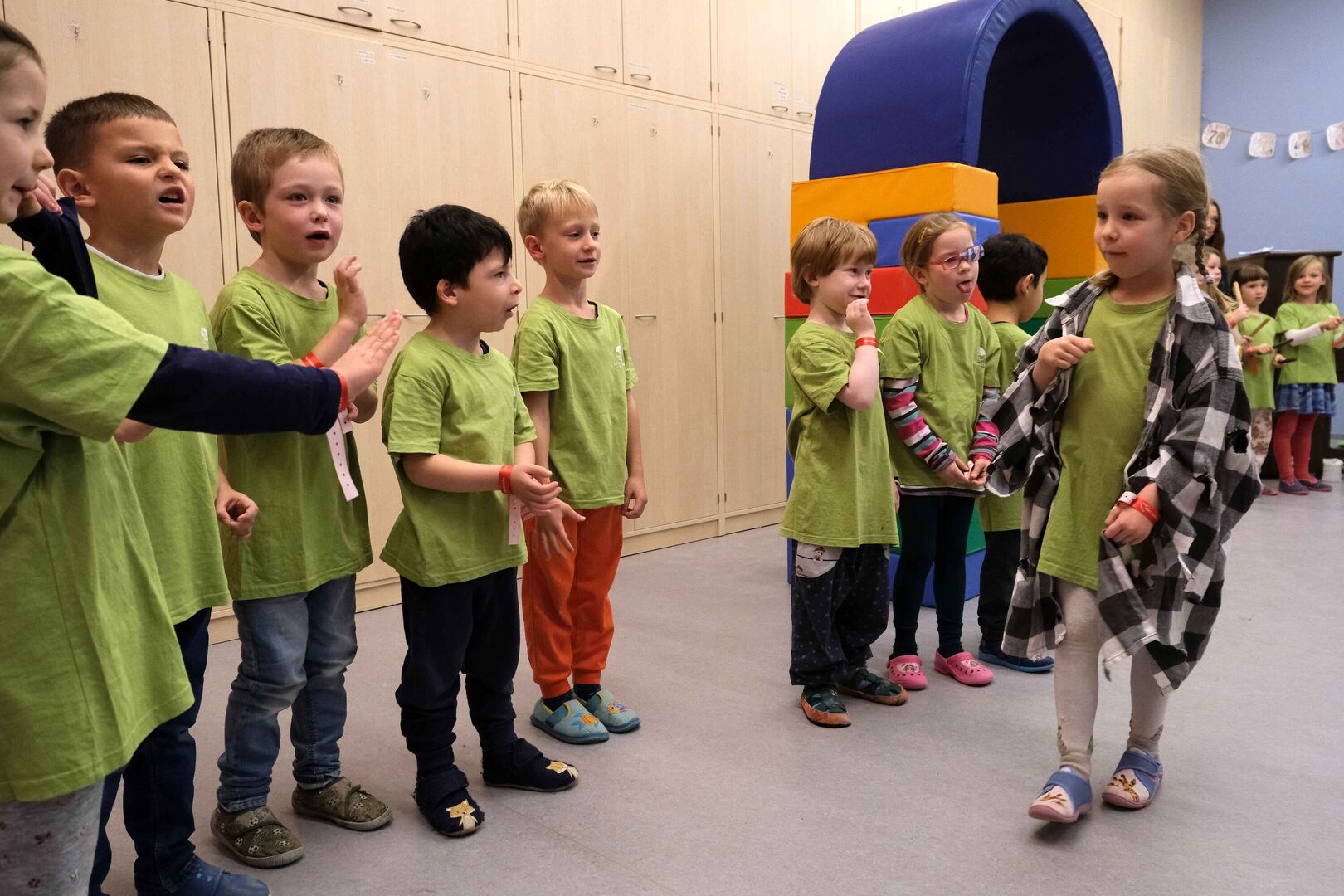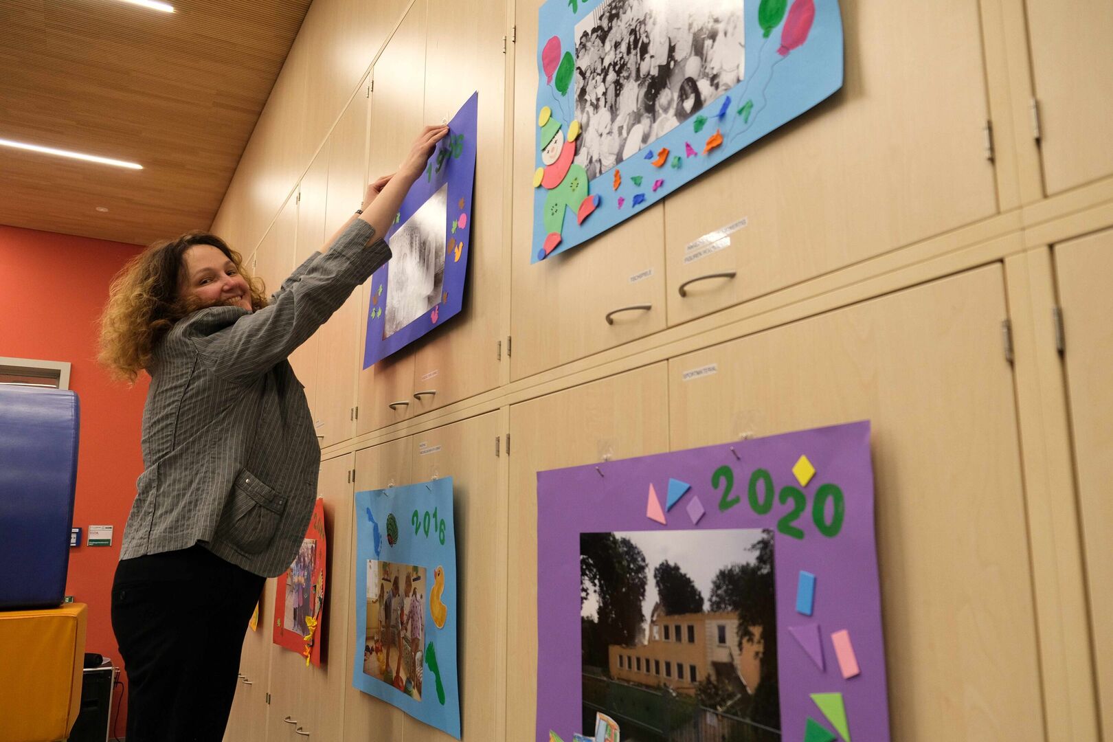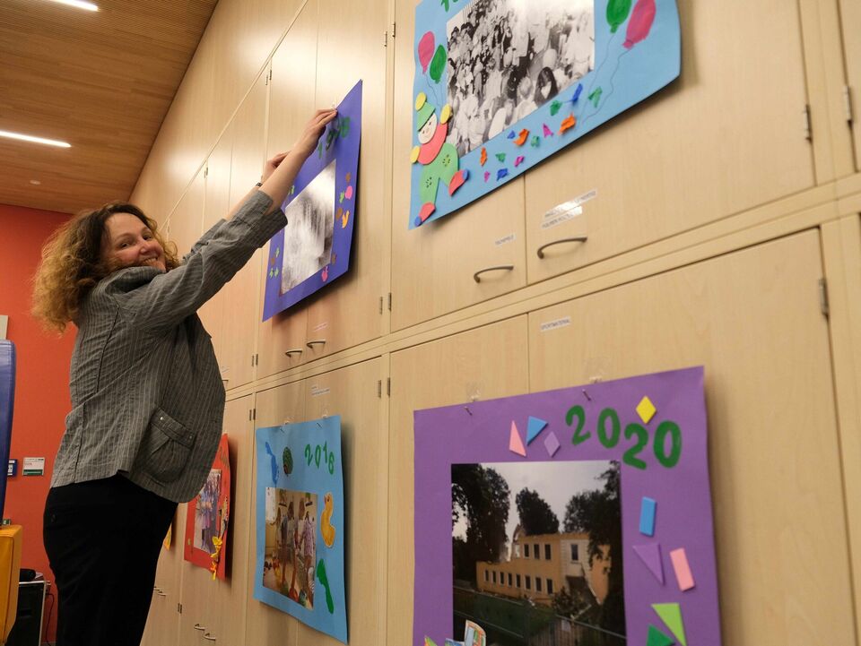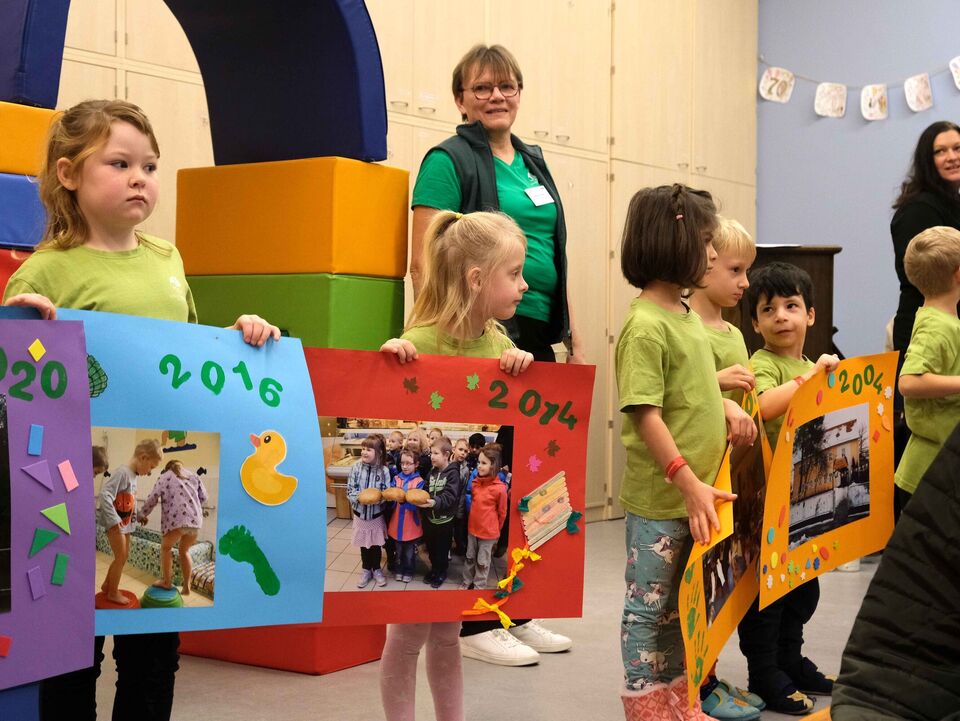 In einer langen Reihe stellten sich die Kinder vor den Gästen auf und hielten Plakate mit einzelnen Blitzlichtern aus der 70-jährigen Geschichte in der Hand.