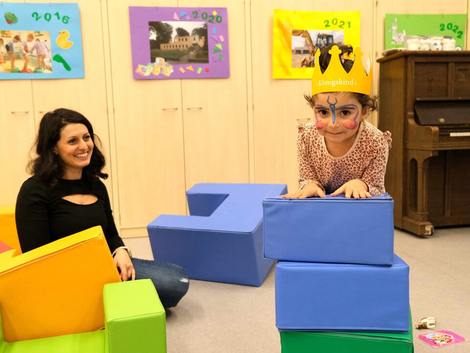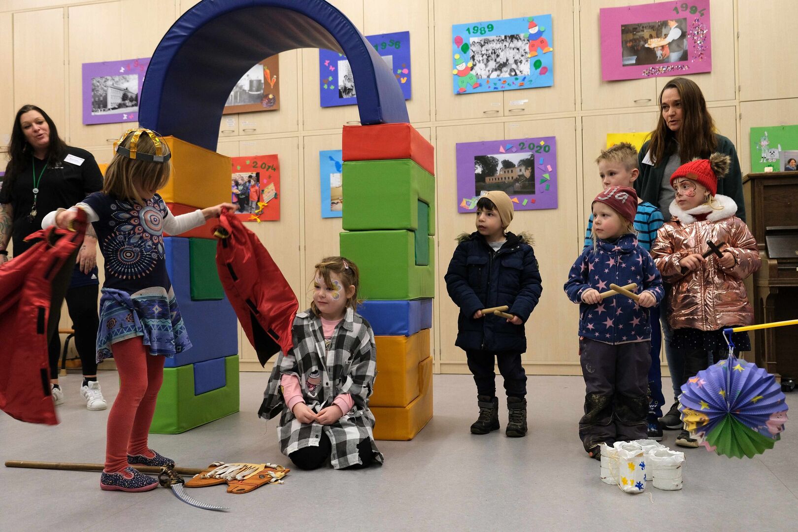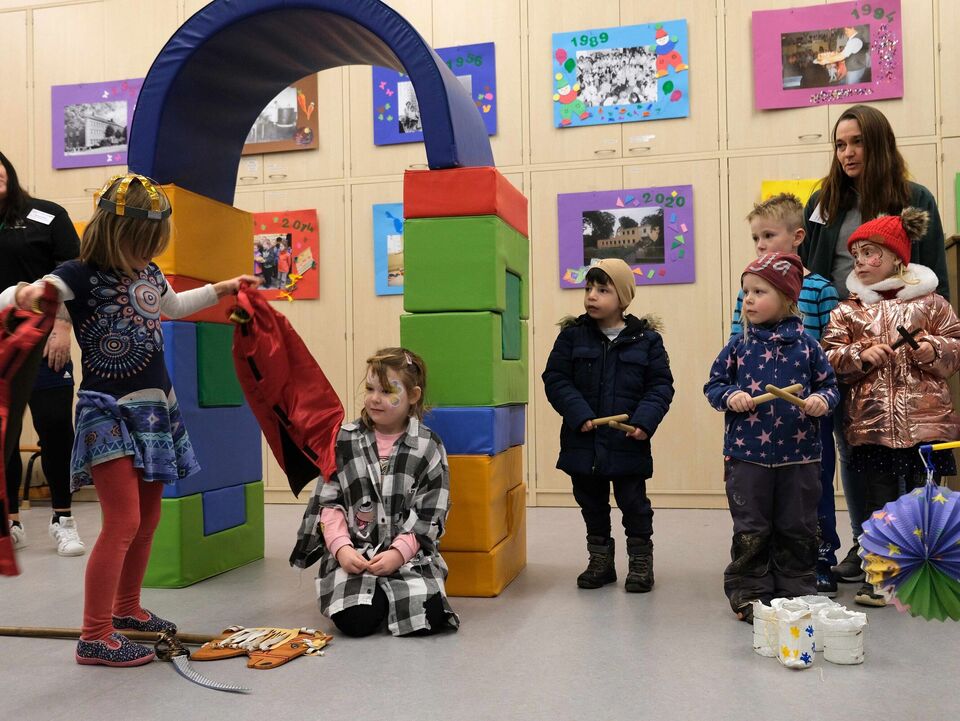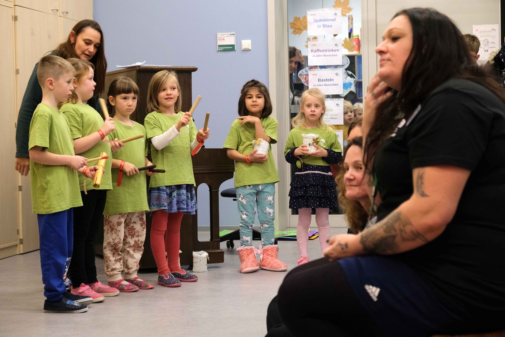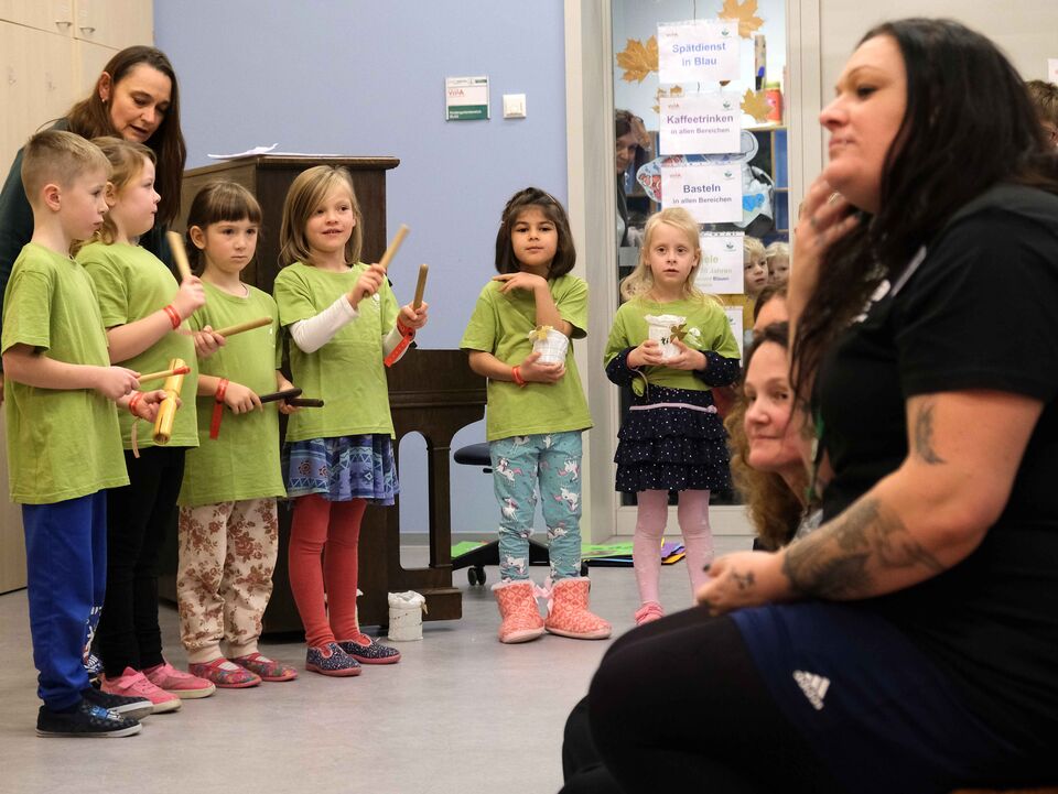 Und weil wir im November nicht nur den Kita-Geburtstag, sondern auch das Martinsfest feiern, führten die Kinder noch ein kurzes Martinsspiel mit musikalischer Begleitung auf. So wie Martin seinen Mantel mit dem armen Bettler teilt, so wollen auch wir etwas abgeben: Ein Teil der Jubiläumsspenden geht an die Diakonie Freiberg, die damit Gesundheitskurse für (werdende) Mütter mit Flucht- und Migrationshintergrund finanzieren will.