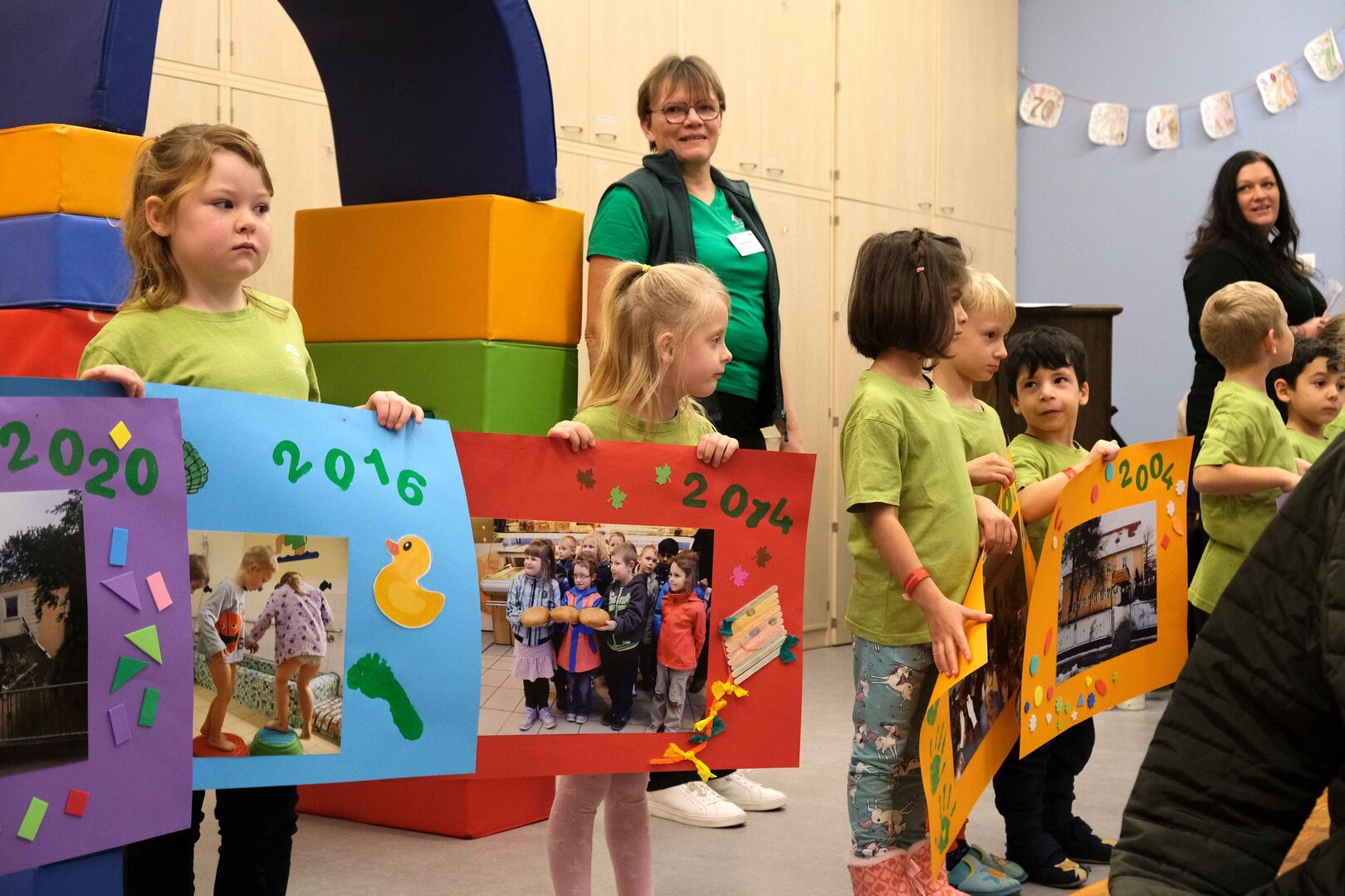 Wenn ein Mensch seinen 70. Geburtstag feiert, dann blickt er schon auf ein langes Leben zurück. Und auch wenn eine Kita 70 Jahre alt wird, gibt es viel zu erzählen. Die Mädchen und Jungen unserer „Villa Kunterbunt“ in Freiberg taten das zum Jubiläumsfest am 13. November auf sehr beeindruckende Weise: In einer langen Reihe stellten sie sich vor den Gästen auf und hielten Plakate mit einzelnen Blitzlichtern aus der Geschichte in der Hand.