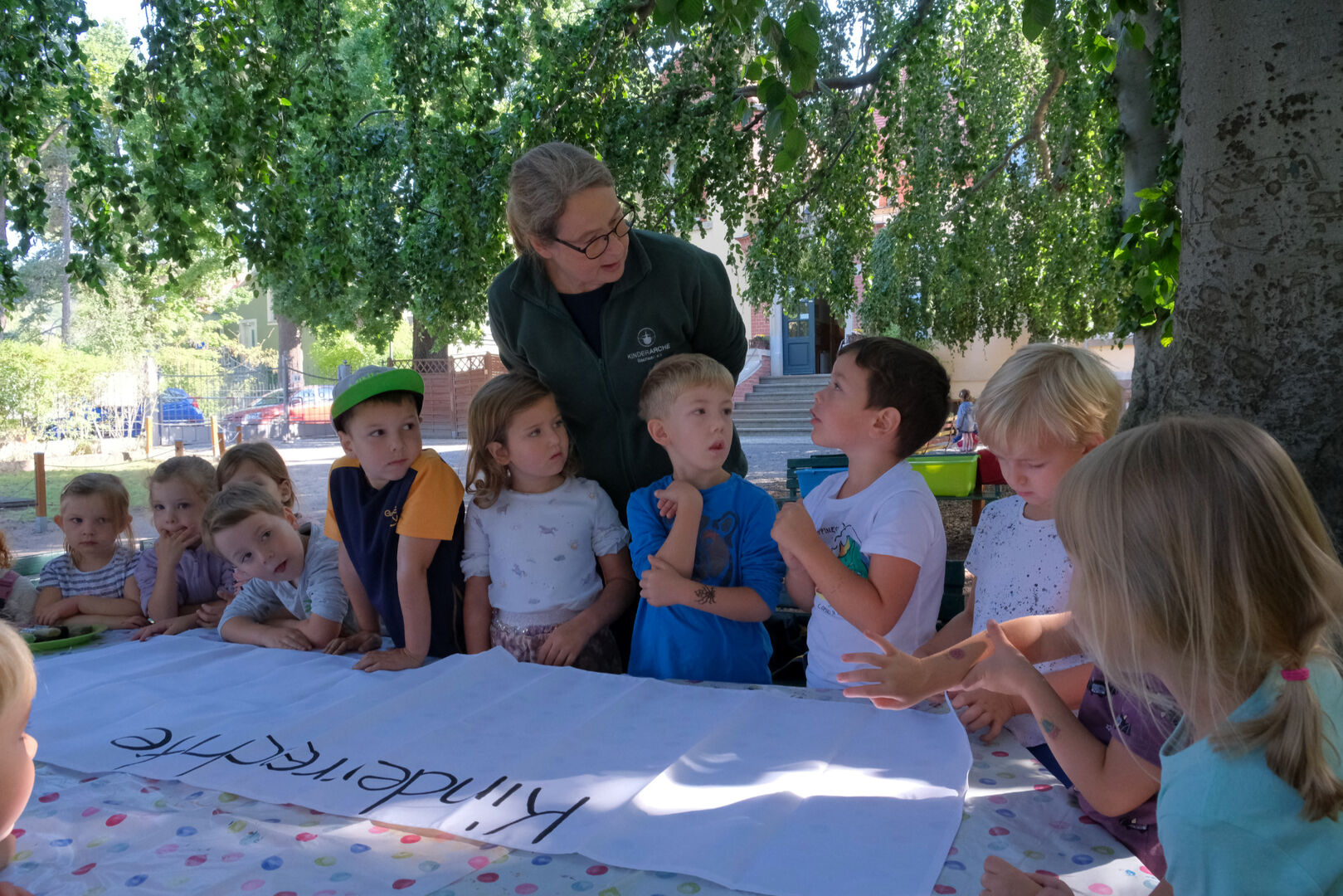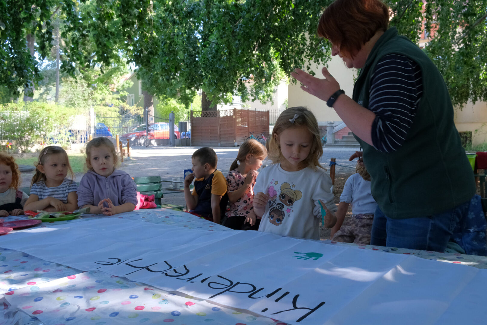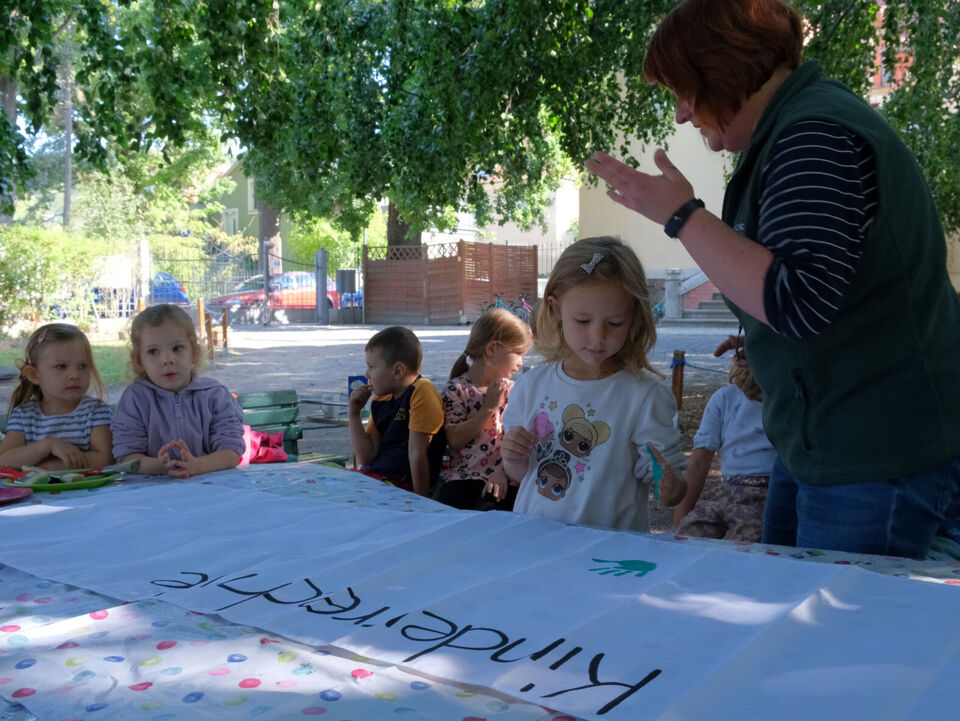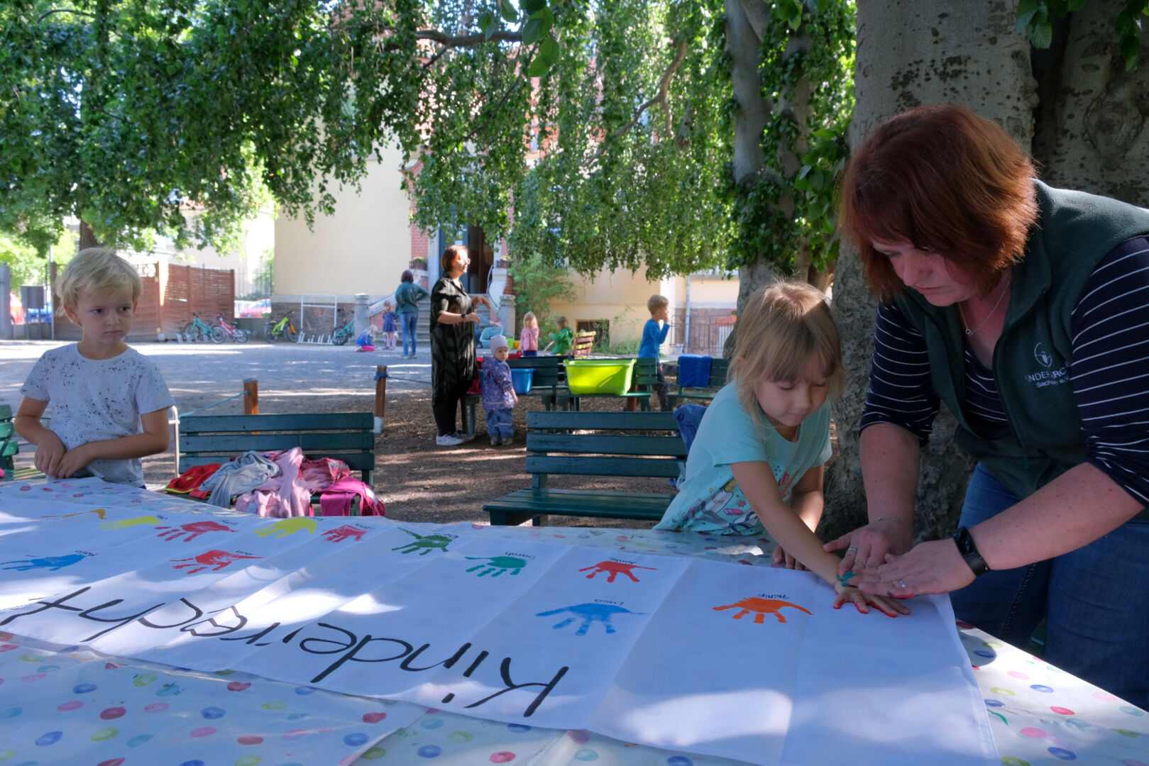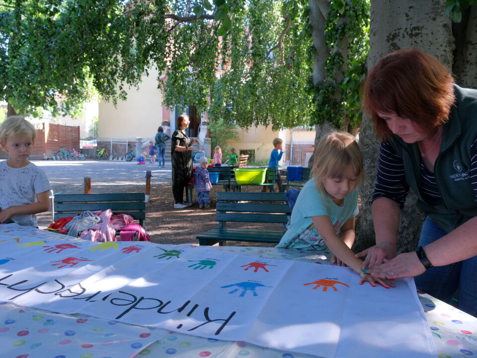 Diese Erkenntnis haben die Kinder aus dem „Kinderkreis Natur, Heimat und Gesundheit“ jetzt farbenfroh ins Bild gesetzt. Am 1. September starteten sie mit einer kreativen Aktion in den Kinderrechte-Monat. Im Garten haben sie ein großes weißes Banner entrollt und mit ihren Handabdrücken verziert. Jeder durfte sich mit seiner Lieblingsfarbe auf dem Banner verewigen. Erzieherin Katharina Besser schrieb unter jeden Handabdruck den Namen des Kindes. Denn das Recht auf eine eigene Identität – und damit auf einen eigenen Namen – ist ein wichtiges Kinderrecht.