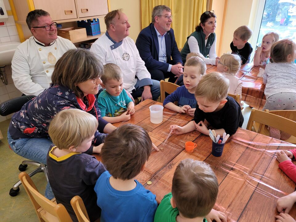 René Buschmann, Inhaber der Bäckerei Schramm in Dorfchemnitz und Stollenfest-Organisator (li.), und Karsten Liebscher, Obermeister der Bäckerinnung Meißen, brachten den Scheck und sahen den Kindern beim Experimentieren mit Wasser über die Schulter.
