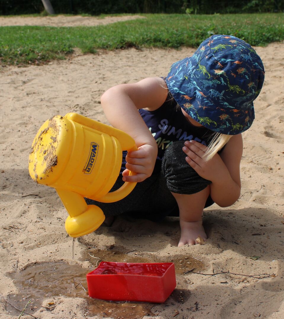 Also heißt es im Sommer „Auf die Plätze, fertig, Wasser marsch!“ Der Sandkasten wird geflutet. Alle Kinder quieken vor Freude. Die Schuhe und Socken werden mit Freude von den Füßen gestrampelt. Es werden Töpfe mit Wasser befüllt, Kleckselburgen entstehen und Wasserparcours werden gebaut. Ab und an wird sich auch mit vollem Körpereinsatz ins kalte Nass gestürzt. Wasser ist für Kinder das wohl mit Abstand interessanteste Element.