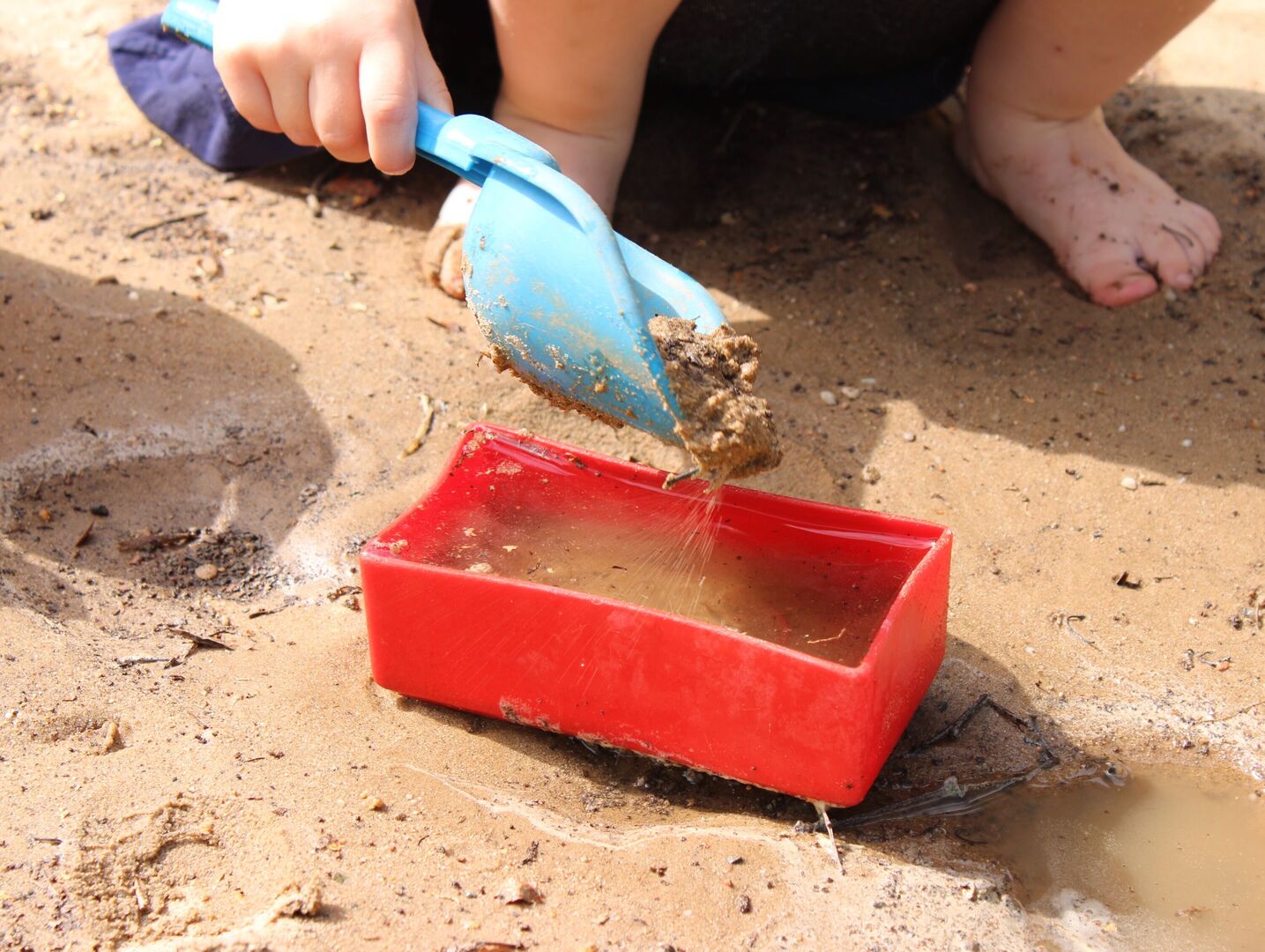 Also heißt es im Sommer „Auf die Plätze, fertig, Wasser marsch!“ Der Sandkasten wird geflutet. Alle Kinder quieken vor Freude. Die Schuhe und Socken werden mit Freude von den Füßen gestrampelt.