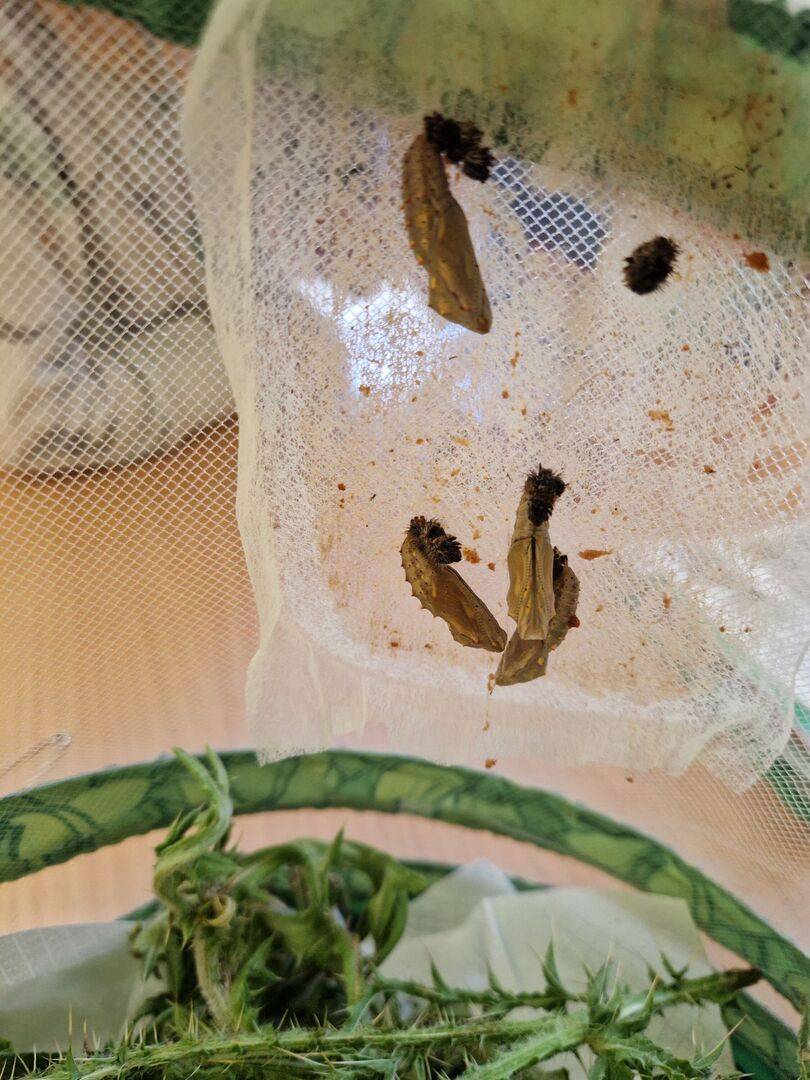 Und dann war es soweit – nach 11 Tagen durften die vollständig verhärteten Puppen in ihre Aufzucht-Voliere umziehen. Ganz vorsichtig befestigten wir das Vliestuch, an dem sie hingen, in ihrer neuen Behausung. Frisch gepflückte Disteln und Brennnesseln in einem Wasserglas erwarteten sie dort. Die Puppen schüttelten sich nun instinktiv, um eventuelle Fressfeinde abzuschrecken. Wir machten uns gemeinsam Gedanken darüber, wer oder was einer Raupe oder sogar einem Schmetterling gefährlich werden könnte. Mit größter Freude sangen wir ganz oft das schöne Lied von der Raupe Nimmersatt oder spielten ein passendes Fingerspiel. Auch das herrlich illustrierte Kinderbuch und das dazugehörige Brettspiel begleitete uns während des Projektes immer wieder.