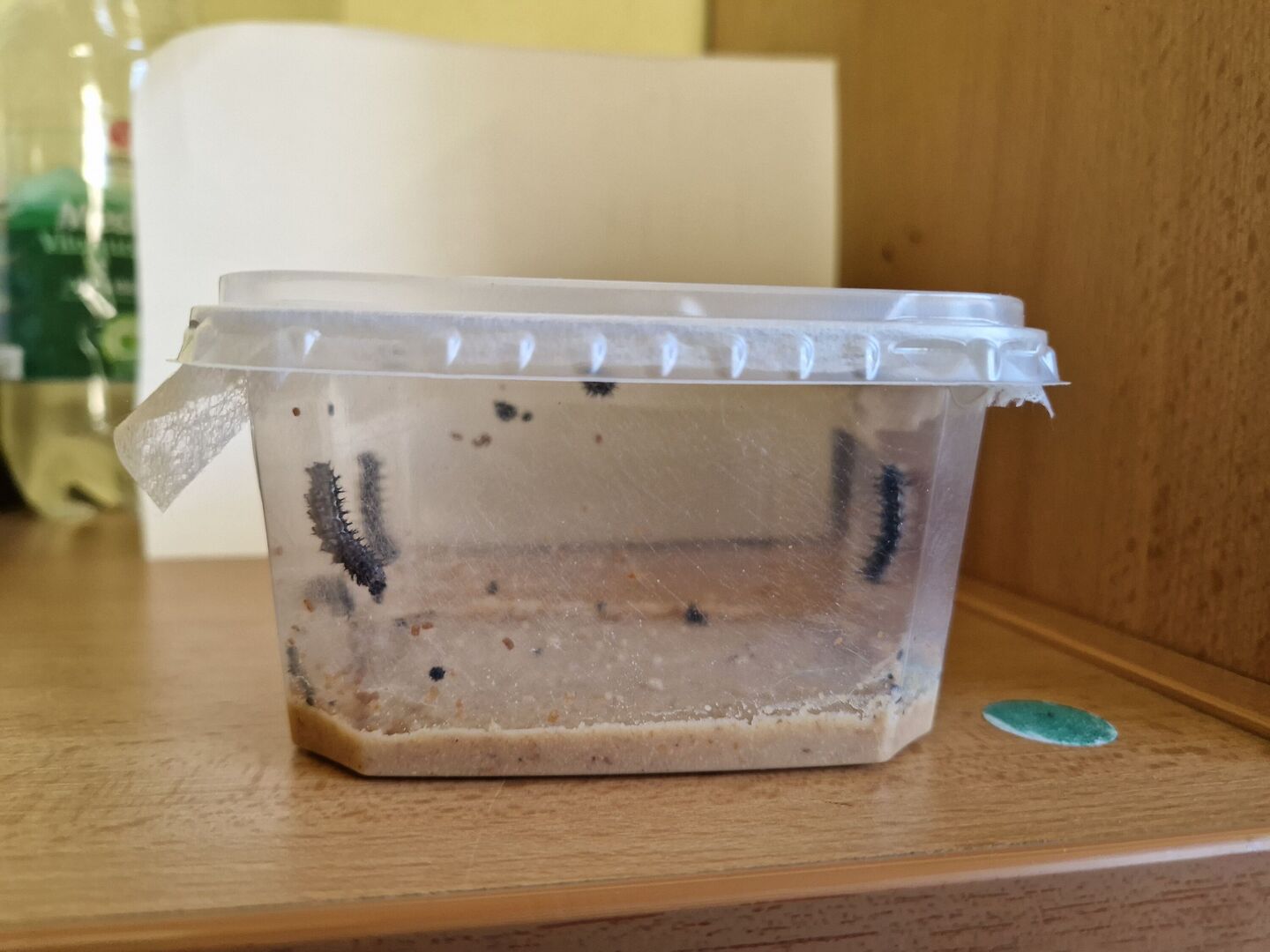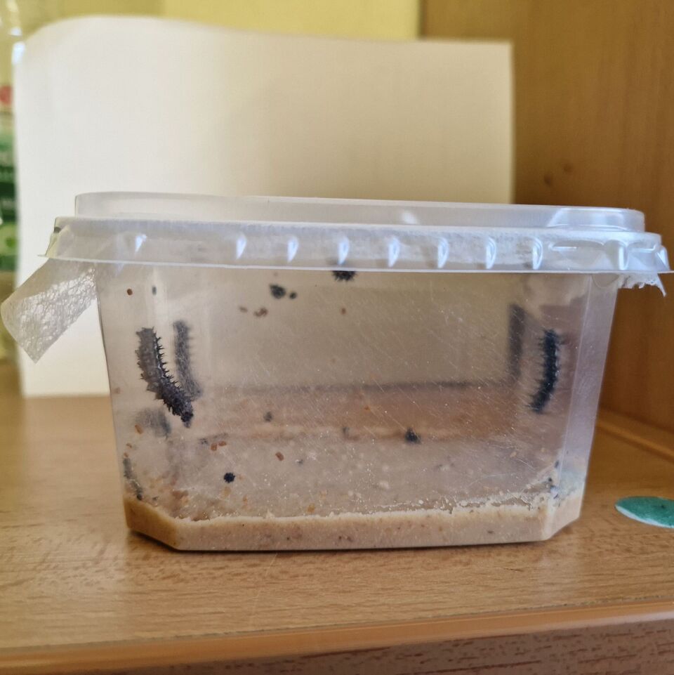Am 14.06.2024 brachte uns der Postbote ein Päckchen mit 6 klitzekleinen, nur wenige Tage alten Raupen des Distelfalters. Diese stellten wir an einen warmen, nicht so sonnigen Platz – gut sichtbar für Kinder und Erwachsene.
