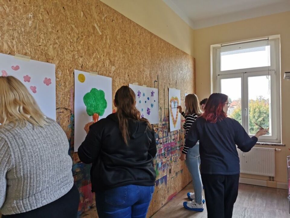 Bald darauf gehen einige auf den nahe gelegenen Sportplatz und einige betreten, wohl zum ersten Mal das Kinderhaus! Es sind die Schülerinnen und Schüler des DRK Sachsen im 3. Lehrjahr der Erzieherausbildung, mit ihren beiden Lehrkräften, die an diesem Montag unser Haus kennenlernen. Sie wollen weitere praktische Erfahrung erfragen und sammeln. So starten einige auf dem Sportplatz und tanzen mit den Kindern und motivieren die vorerst etwas skeptischen Kinder, ihren aufgebauten Parcours auszuprobieren. Nach wenigen Minuten sind die Kinder mit Freuden dabei.