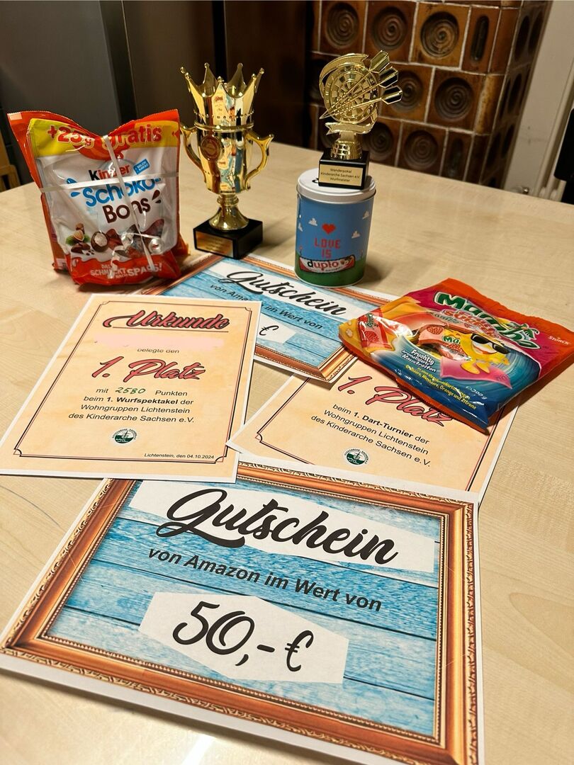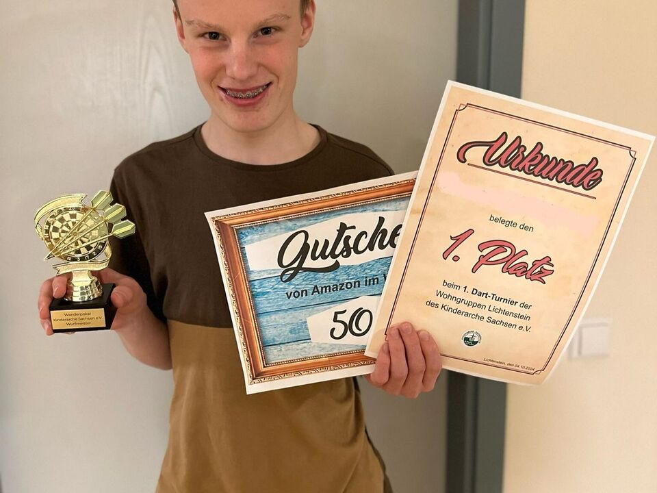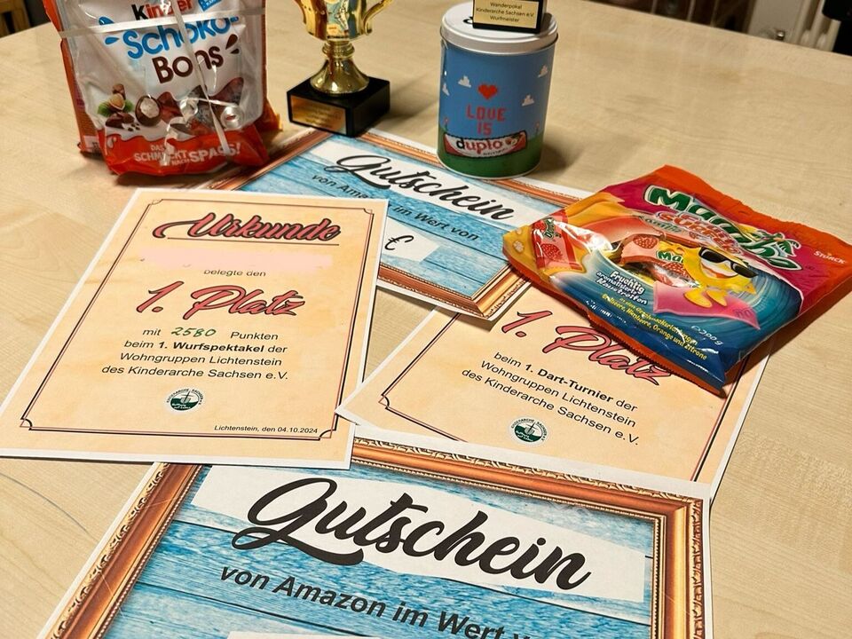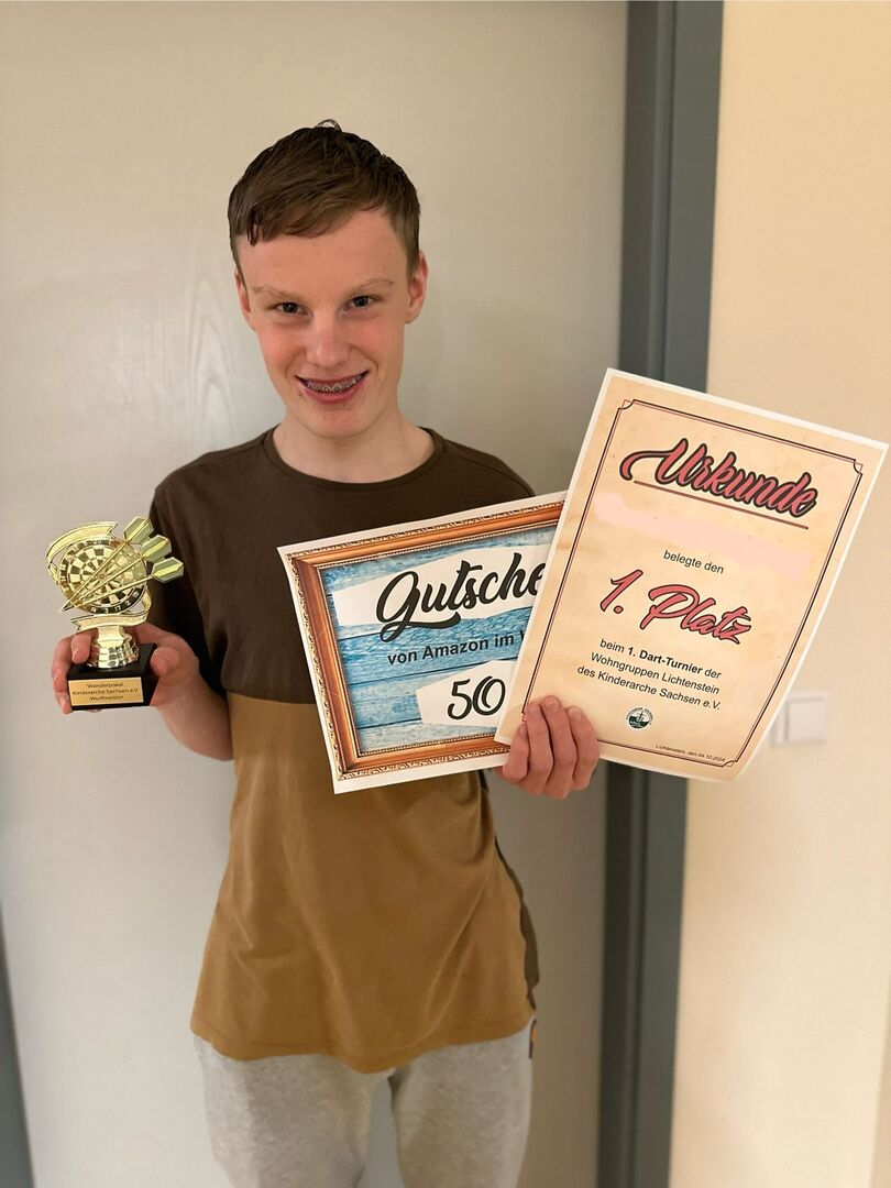 Die Spannung und Freude waren an allen Stationen zu spüren, besonders als es an die Preisverleihung ging. Für den sportlichen Einsatz gab es tolle Preise. Der 1. Platz wurde mit einem 50 € Amazon-Gutschein und einem Pokal geehrt, der 2. Platz erhielt einen 25 € Amazon-Gutschein und der 3. Platz durfte sich über einen 10 € Gutschein sowie Süßigkeiten freuen. Keine große Überraschung war, dass der 18-jährige Leon, der erfolgreich in einer Freizeitmannschaft Dart spielt, den 1. Platz in dieser Disziplin für sich entschied.