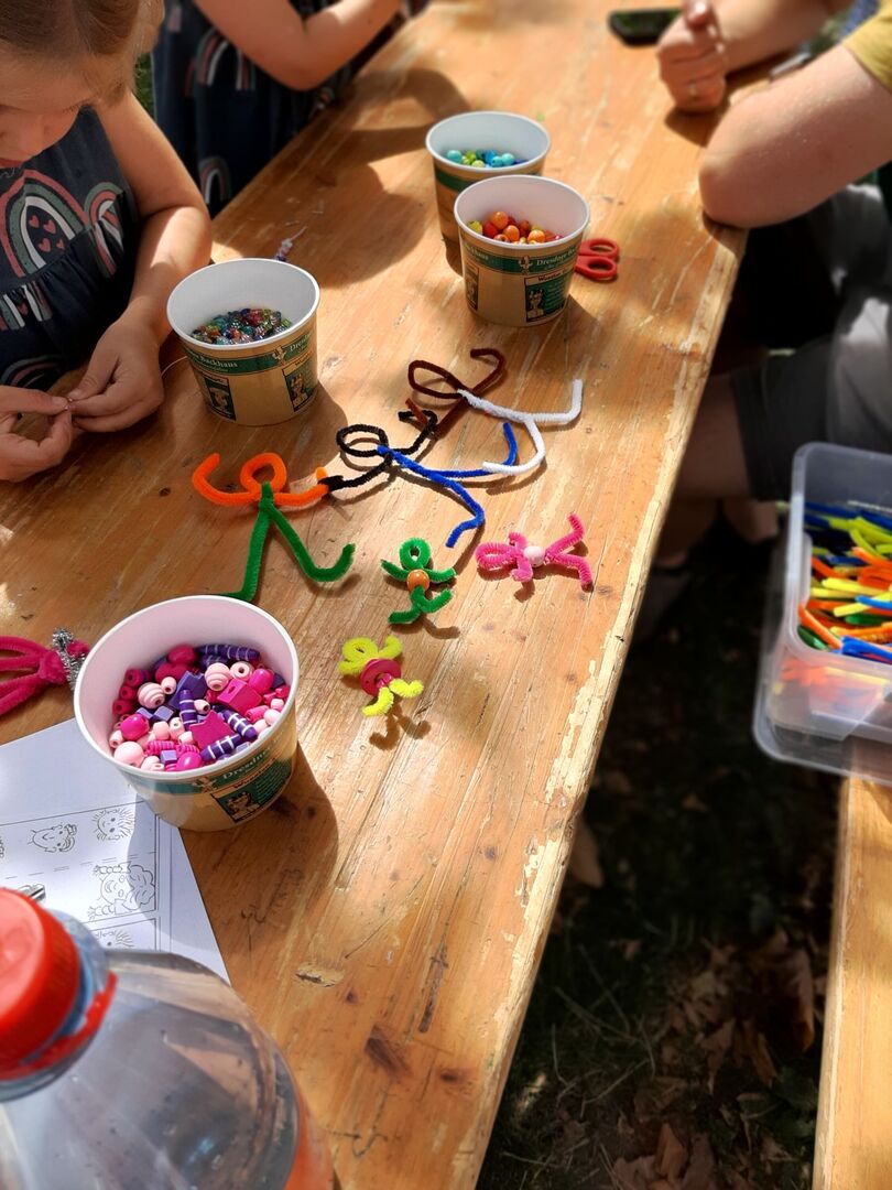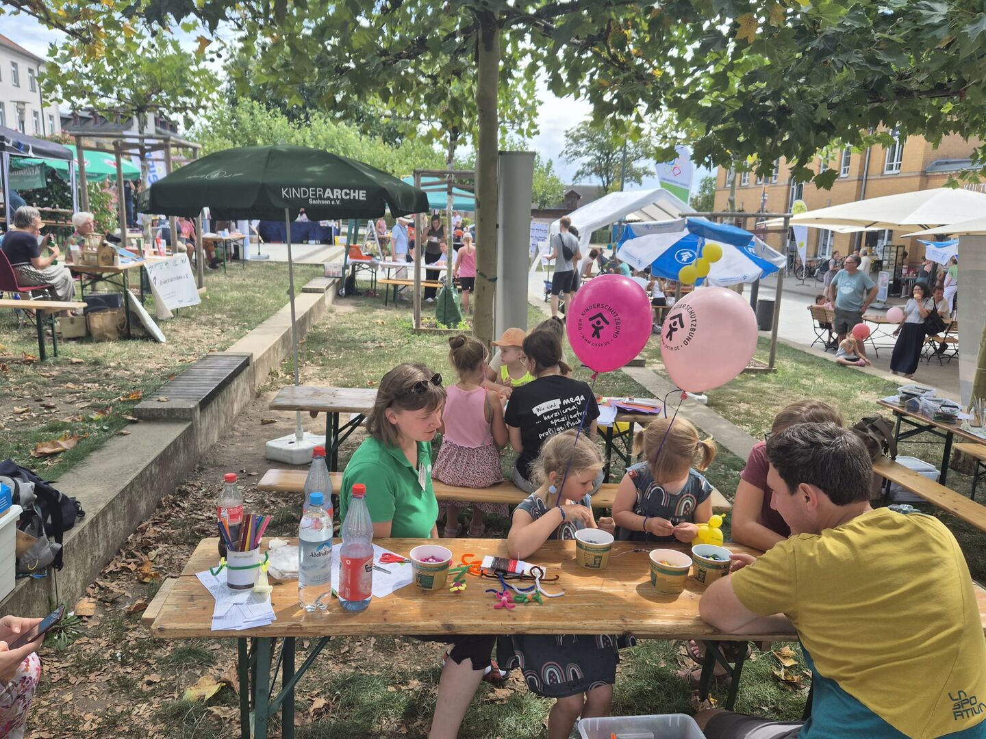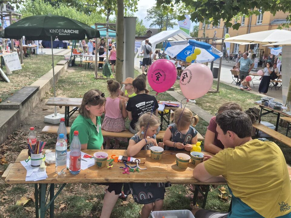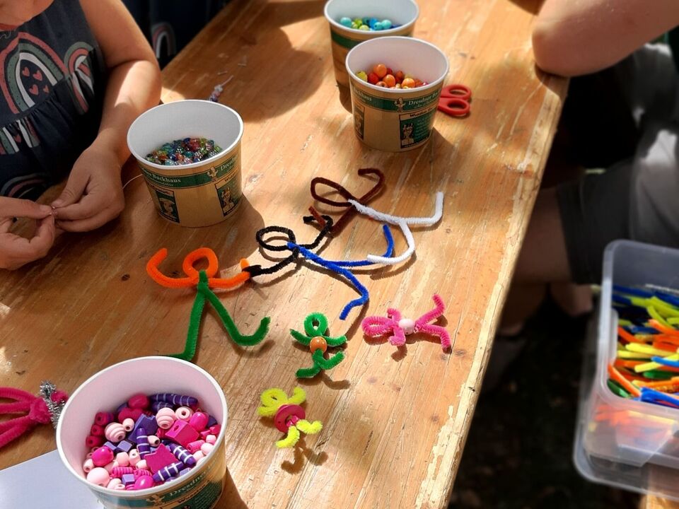 Zum 3. Vereinstag der Stadt Radebeul am 17. August hat sich auch die Kinderarche Sachsen mit ihren Kitas am Kulturbahnhof in Radebeul-Ost vorgestellt. Vertreterinnen aus unserer Integrativen christlichen Kita „Riesenzwerge“, dem „Kinderkreis Natur, Heimat und Gesundheit“ und dem Christlichen Kinderhaus „Guter Hirte“ hatten einen spannenden Bastelstand vorbereitet, an dem die Kinder Tiere falten, Perlenarmbänder fädeln, Papierpropeller und Figuren aus Pfeifenreinigern basteln konnten.