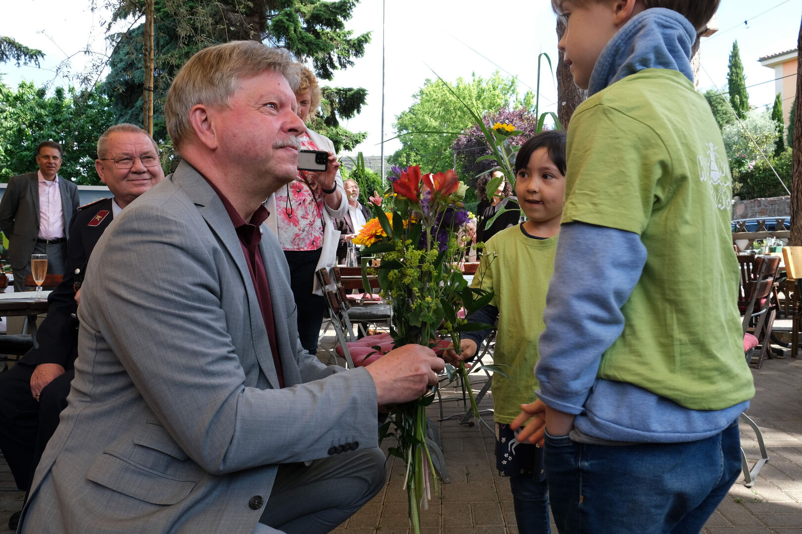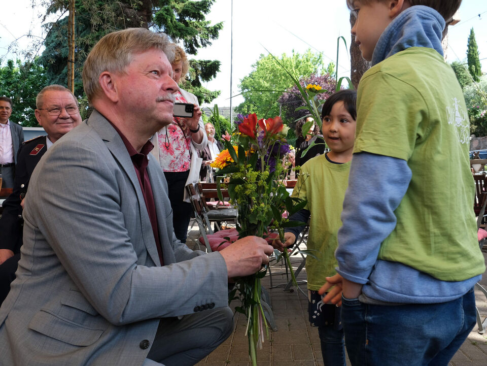 Mit Blumen, ein paar Liedern, vielen guten Wünschen und einem großen Pfefferkuchen-Herz gratulierten die Kinder und Kinderarche-Vorstand Matthias Lang dem Radebeuler OB Bert Wendsche zum runden Geburtstag.