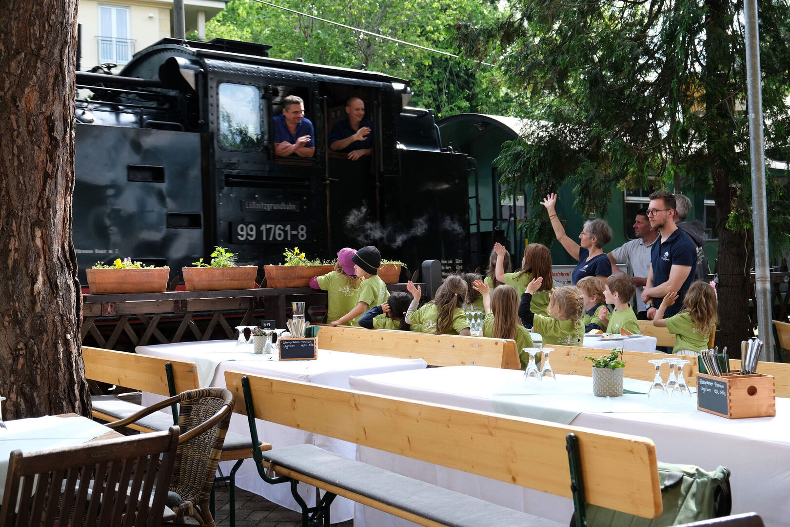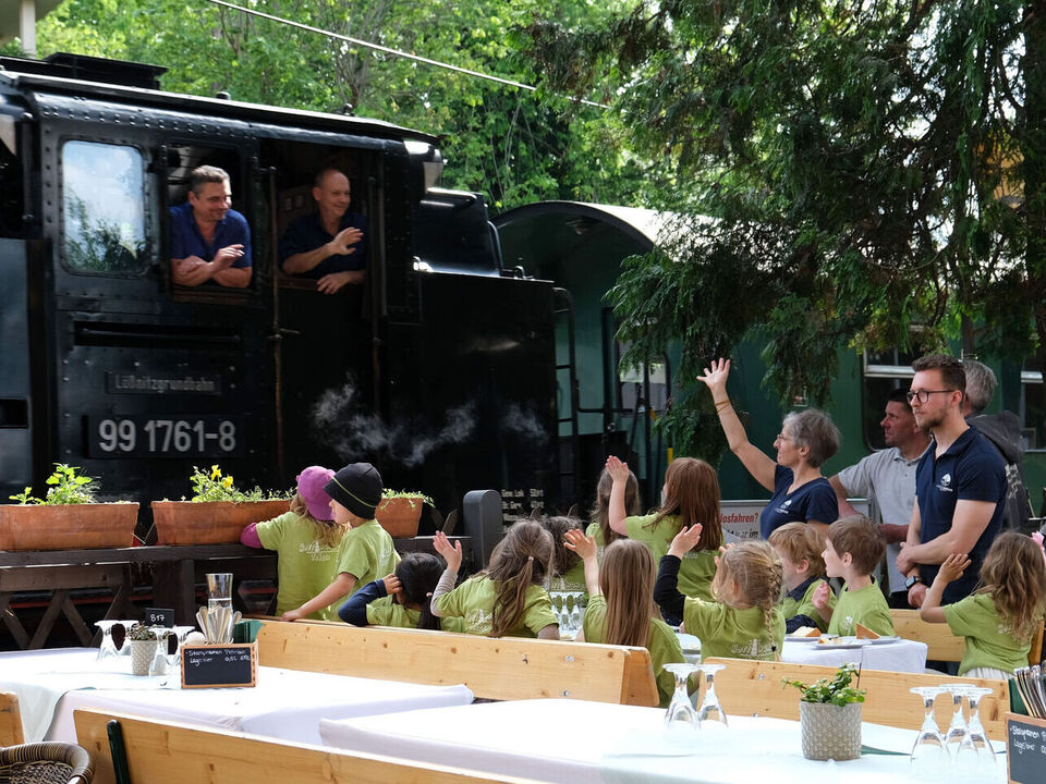 Nach ihrem Auftritt stärkten sich die jungen Sängerinnen und Sänger am Kuchenbuffet und konnten sogar noch dem Lößnitzdackel zuwinken, der direkt an ihrem Tisch vorbeifuhr. Wir schließen uns den Kindern an und wünschen von Herzen Gesundheit, Schaffenskraft und Gottes guten Segen auf allen Wegen.