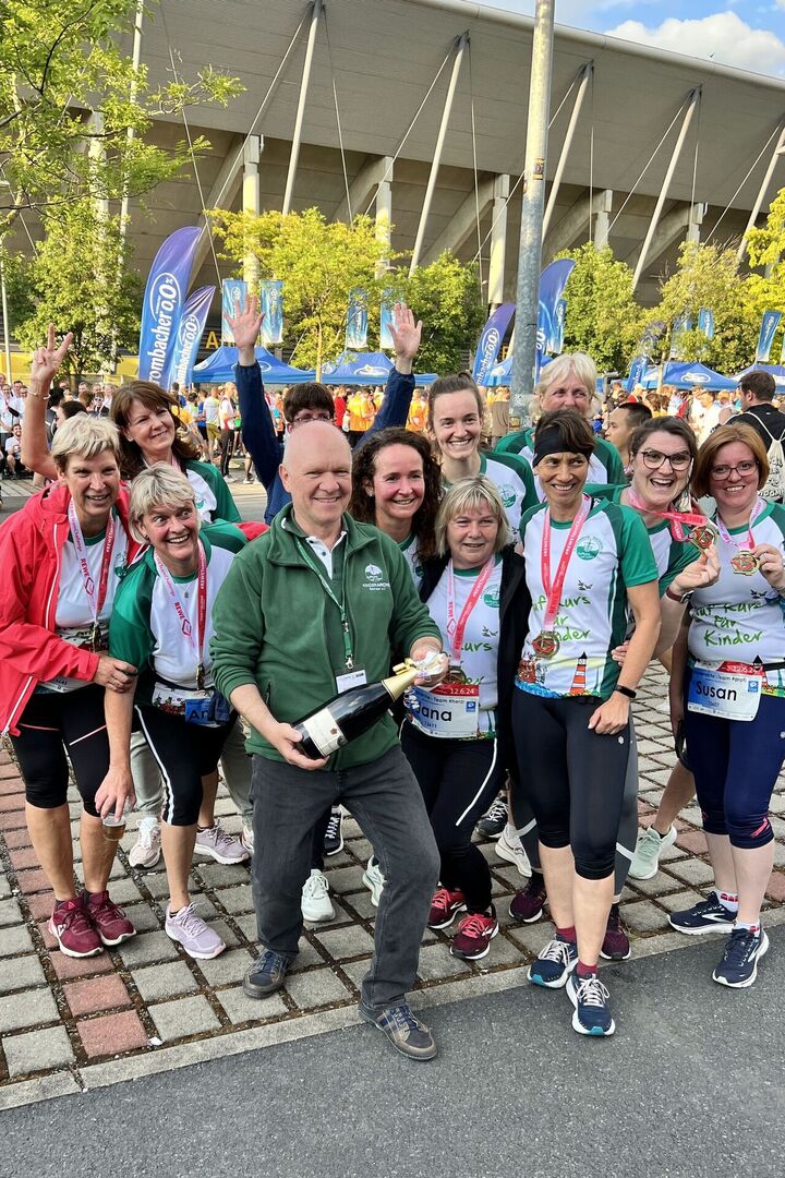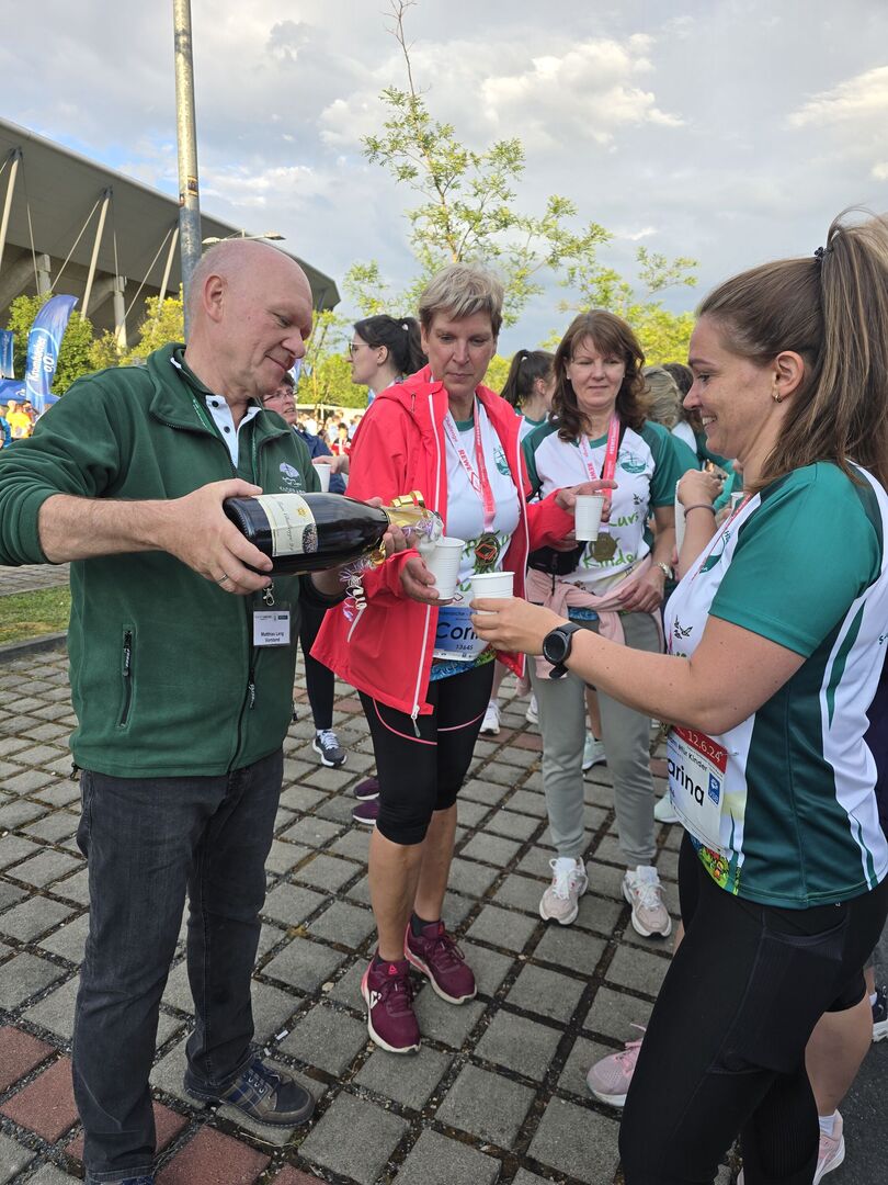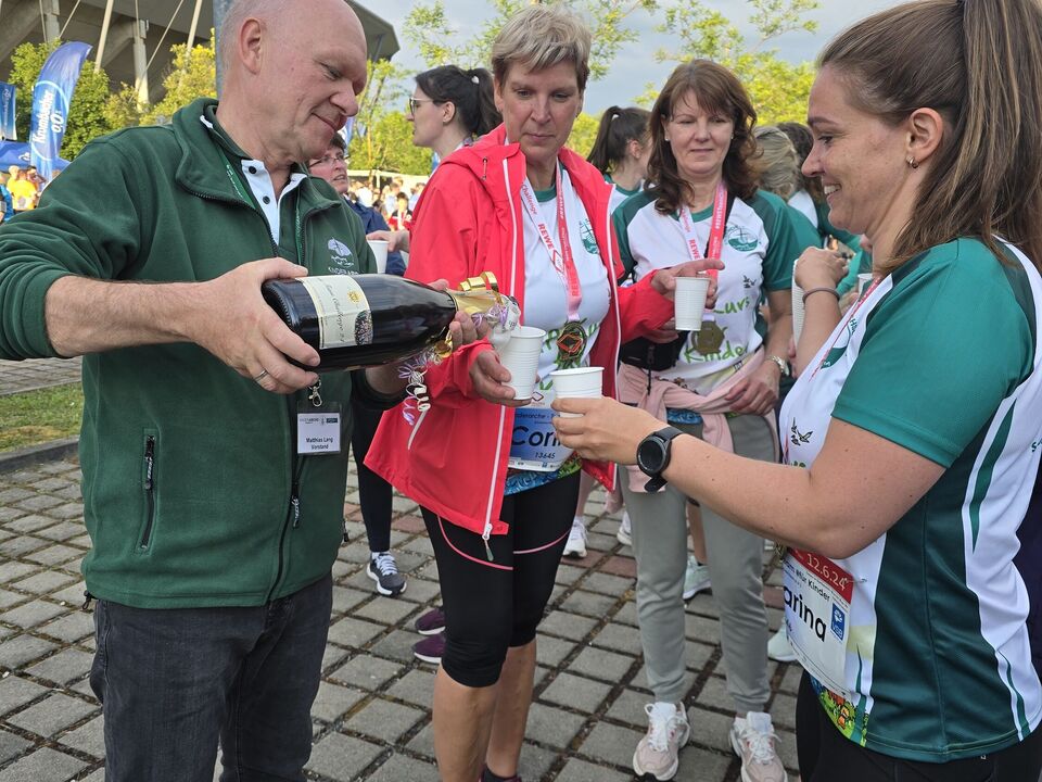 Kinderarche-Vorstand Matthias Lang war zwar nicht unter den Läufern, aber feuerte seine Teams sowohl beim Start als auch beim Zieleinlauf kräftig an und stieß mit den geschafften Läuferinnen und Läufern mit eigens etikettiertem Rewe Team Challenge Sekt zünftig auf den Sieg an. Wir sind dankbar für einen tollen Abend in einer großartigen Gemeinschaft!
