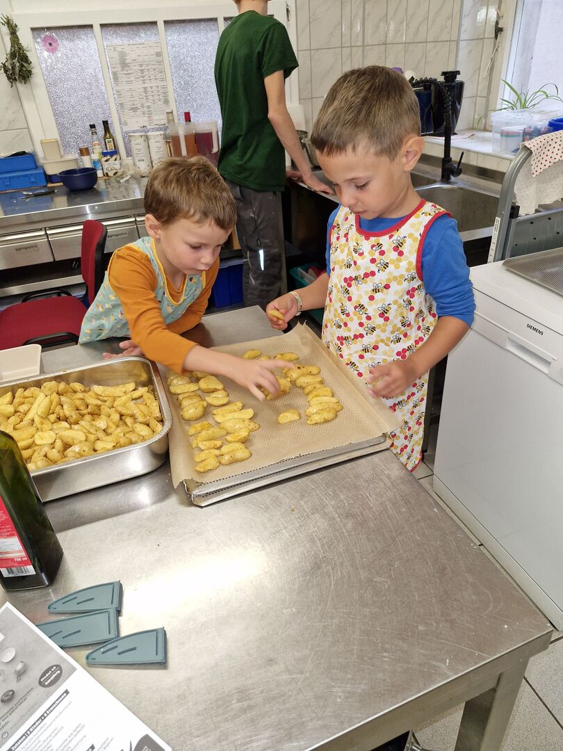 Gemeinsam wurden Obst und Kartoffeln für die Obstspieße und Ofenkartoffeln geschnitten.