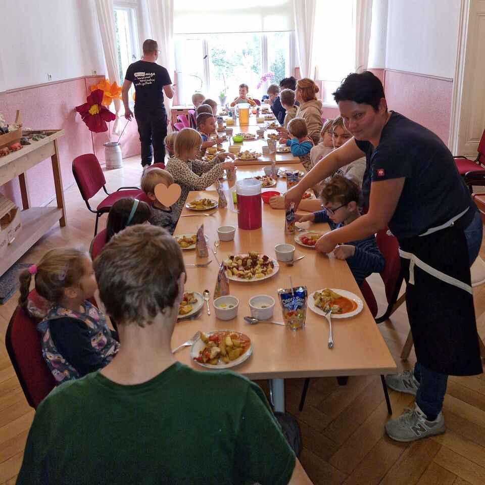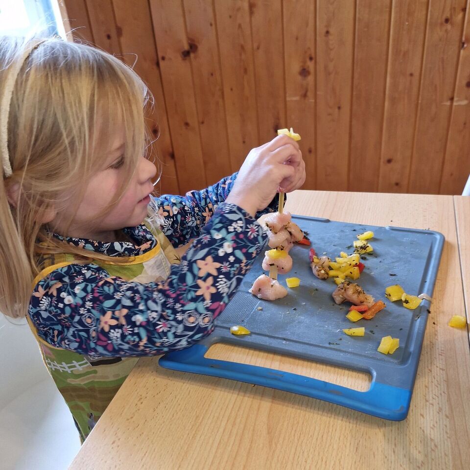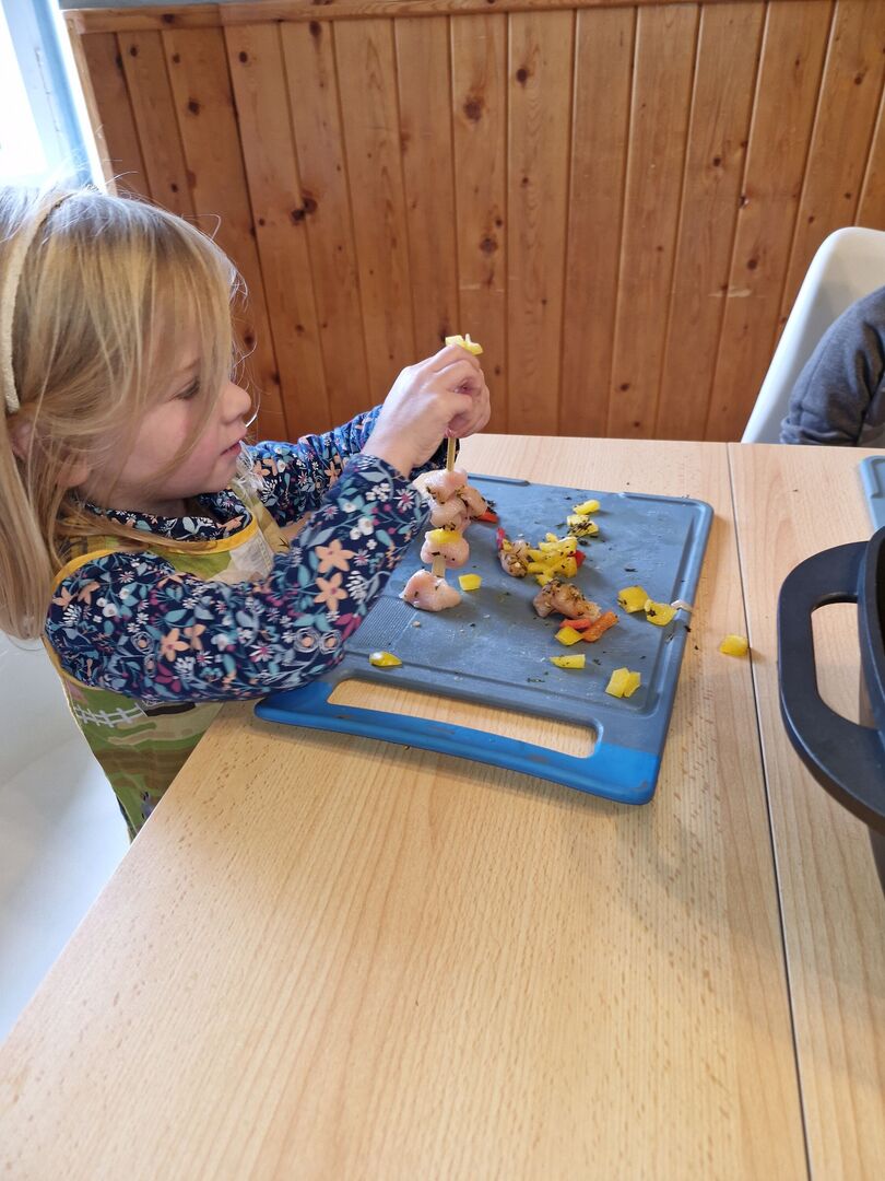 Hähnchen und Gemüse wurden für die Hähnchenspieße vorbereitet, welche anschließend ihren Platz in der Pfanne fanden. Natürlich durfte ein Nachtisch nicht fehlen und so zauberten die kleinen Köche einen leckeren Vanillepudding. Anschließend nahmen alle an der großen Tafel Platz, um das gemeinsam zubereitete Mittagessen zu genießen.