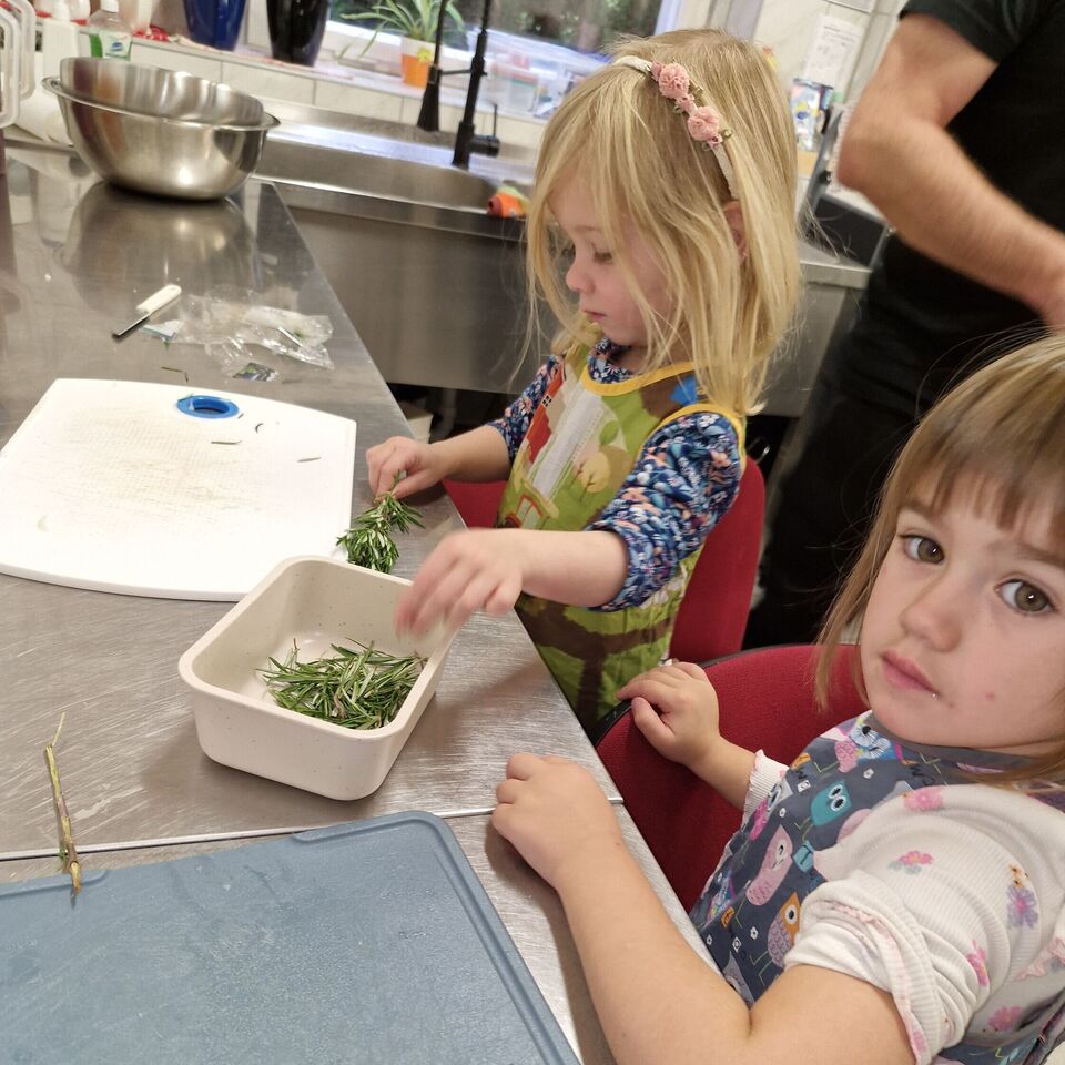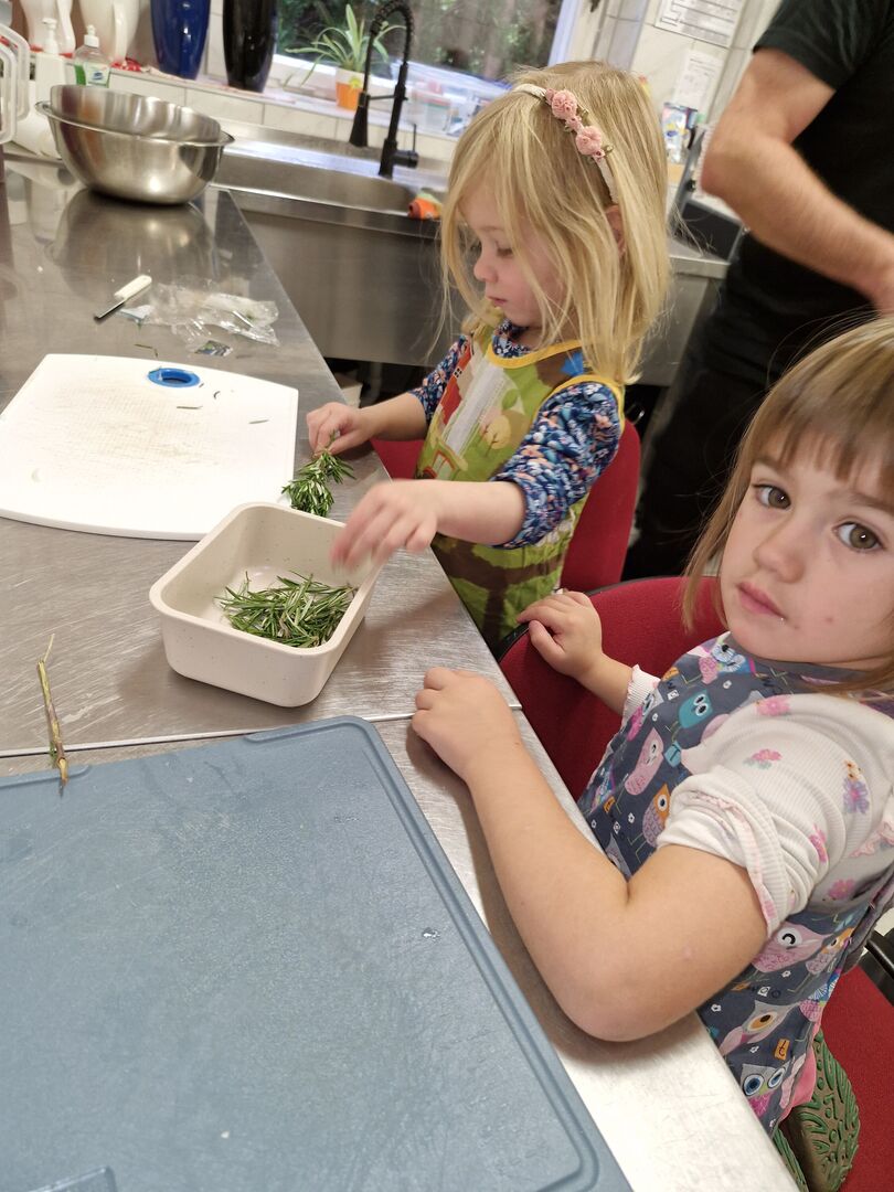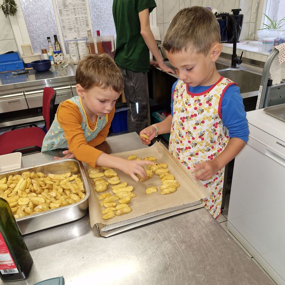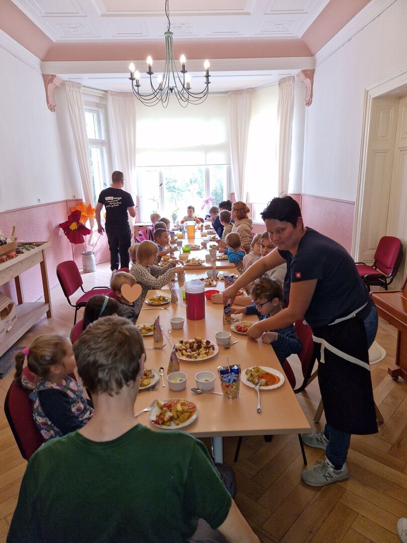 Hähnchen und Gemüse wurden für die Hähnchenspieße vorbereitet, welche anschließend ihren Platz in der Pfanne fanden. Natürlich durfte ein Nachtisch nicht fehlen und so zauberten die kleinen Köche einen leckeren Vanillepudding. Anschließend nahmen alle an der großen Tafel Platz, um das gemeinsam zubereitete Mittagessen zu genießen.