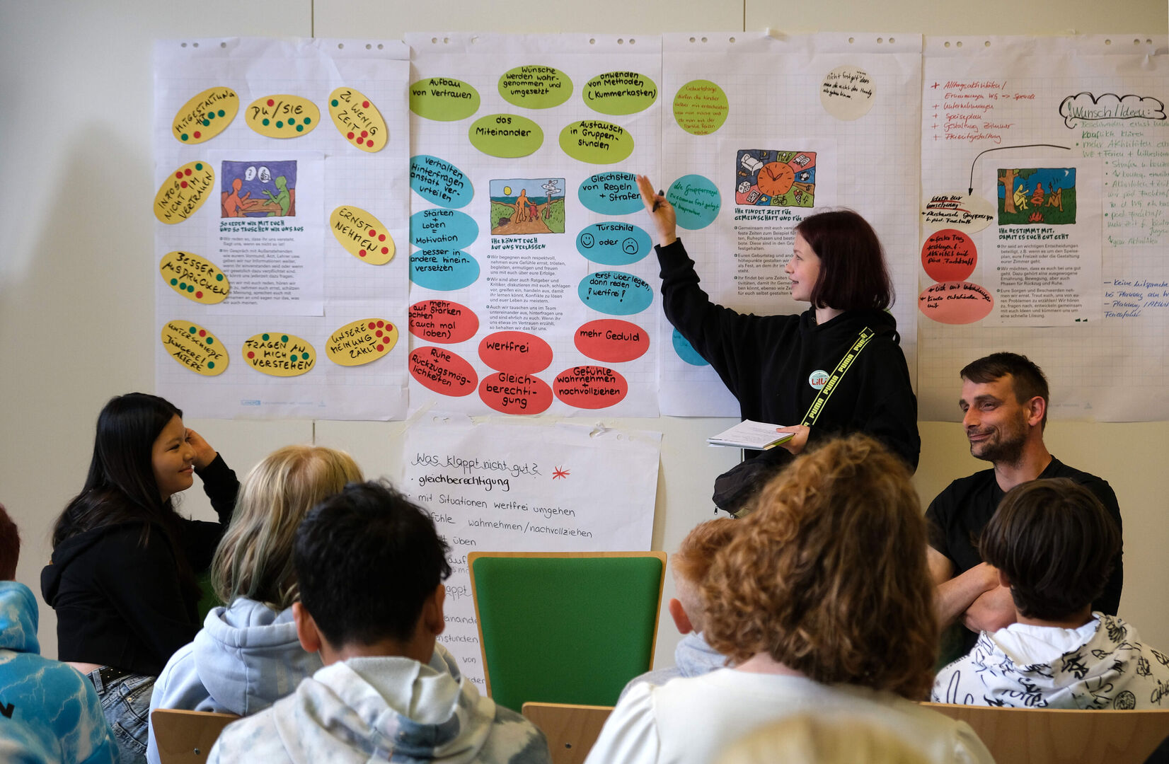 In allen Gruppen gab es Lob für Dinge, die schon gut laufen: z.B. das Miteinander, gegenseitiges Vertrauen, die Gestaltung von Gruppenstunden, das gemeinsame Aushandeln von Regeln, Mitbestimmung bei der Zimmergestaltung und Alltagsaktivitäten. Aber es gab auch Dinge, die sich die jungen Menschen anders wünschen: „Traut uns mehr zu! Jeder von uns hat Stärken und verdient Lob dafür!“ – „Erst überlegen, dann reden – das sollte auch für Erzieher gelten!“ – „Habt Verständnis für unser Verhalten, nehmt uns ernst!“ – „Bezieht uns ein, wenn es um unseren Alltag geht!“ – „Drückt euch so aus, dass wir es verstehen!“ waren einige Wünsche, die die jungen Menschen als Anregung für eine bessere Umsetzung der Fachstandards äußerten.