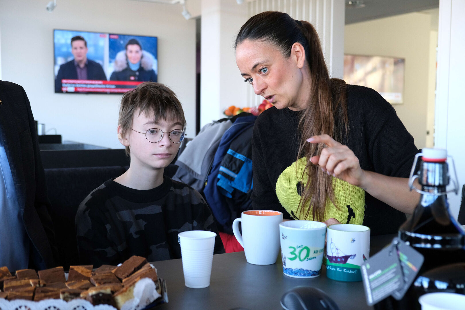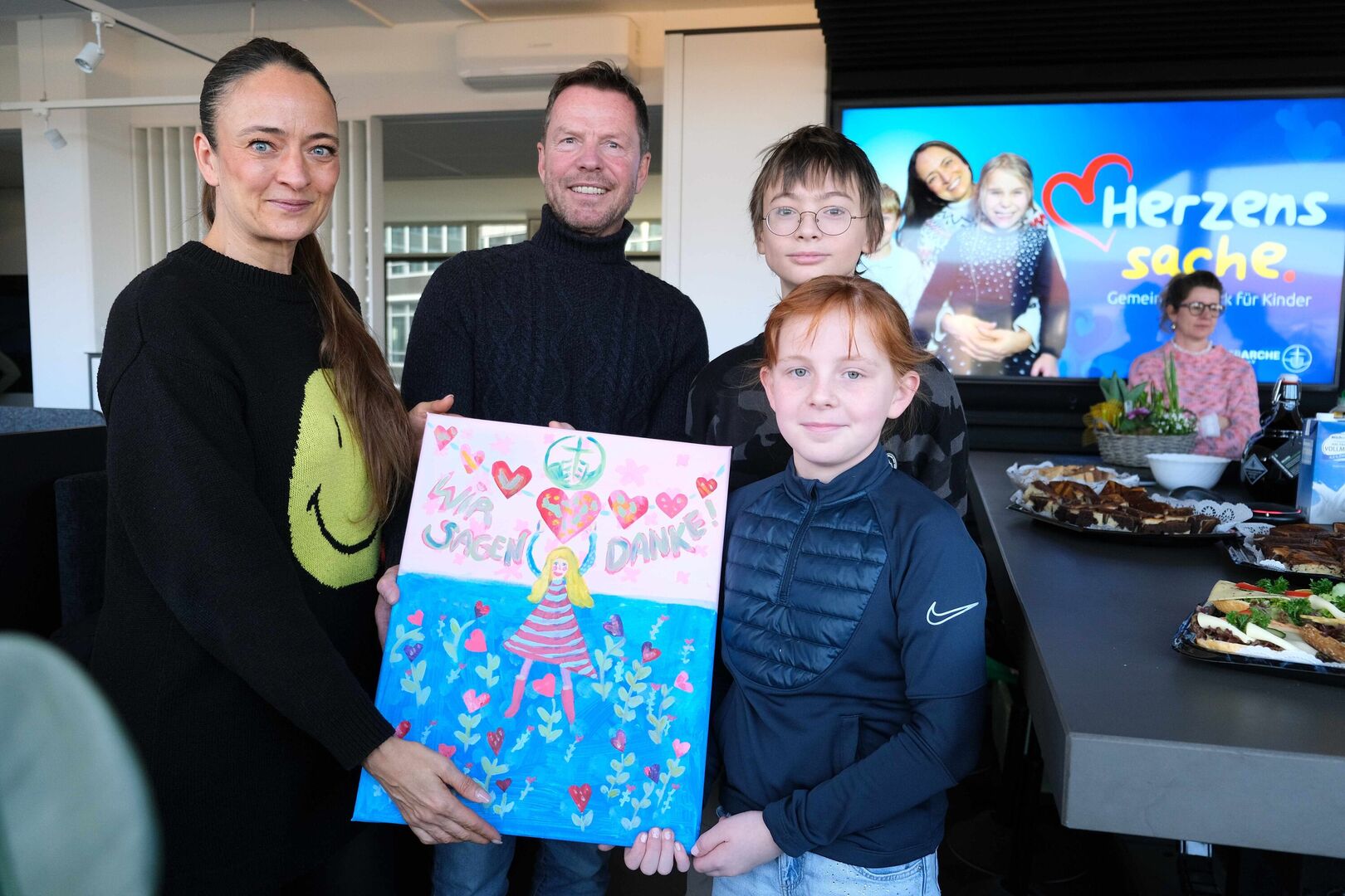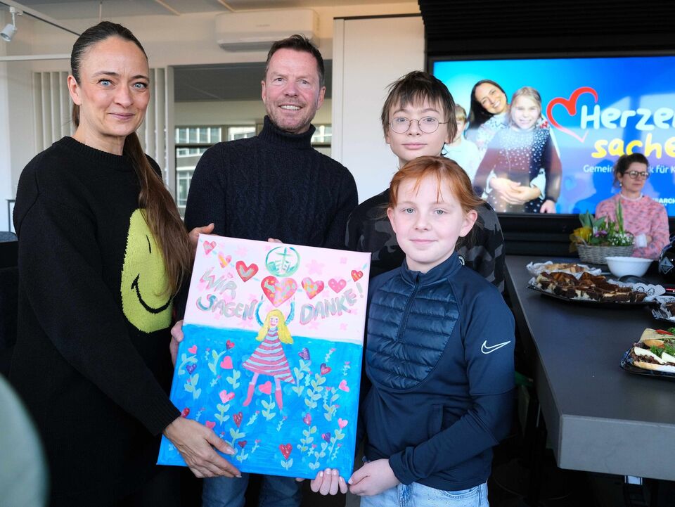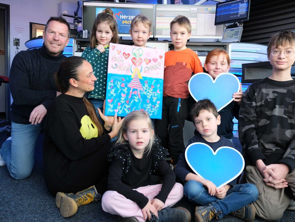 Stellvertretend für alle jungen Menschen an Bord der Kinderarche Sachsen war diese kleine „Abordnung“ am Montagvormittag in den Radio-Sender gefahren, um sich mit einem Liedchen, einem selbst gemalten Bild aus dem Integrativen Familienwohnen, Blumen, Kaffee und Kuchen beim Team von „André und die Morgenmädels“ für die Spenden aus der „Herzenssache 2024“ zu bedanken.