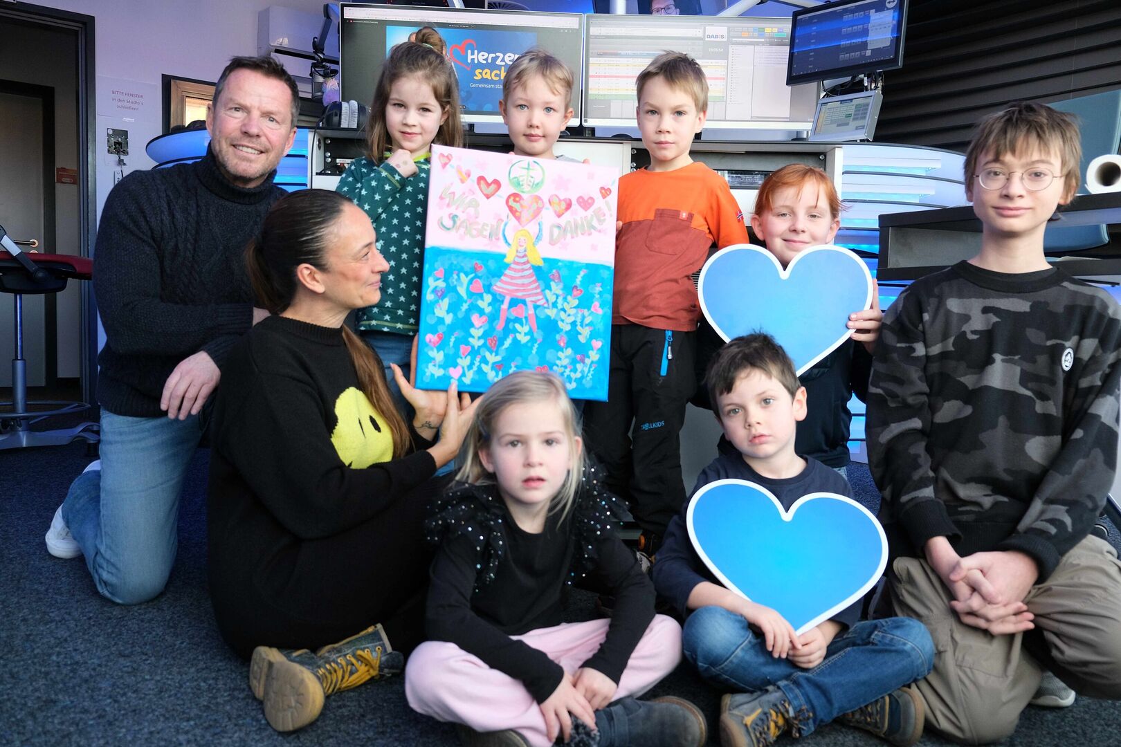 Dem Team im Radio-Sender auf der Dresdner Ammonstraße sind gestern Morgen fast die Ohren abgefallen, als unsere Kinder lautstark ins Mikrofon riefen „Vielen vielen Dank!“ Auch André und Kristin Hardt waren einigermaßen beeindruckt davon, wie stimmgewaltig die Kinder aus unserer Kita „Riesenzwerge“ und der Wohngruppe Weinberghaus sein können.