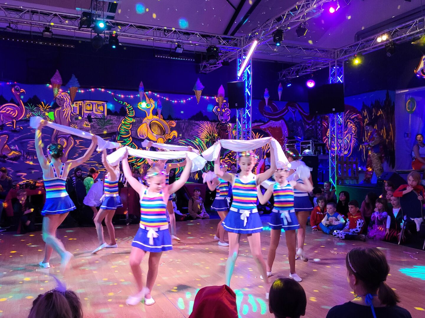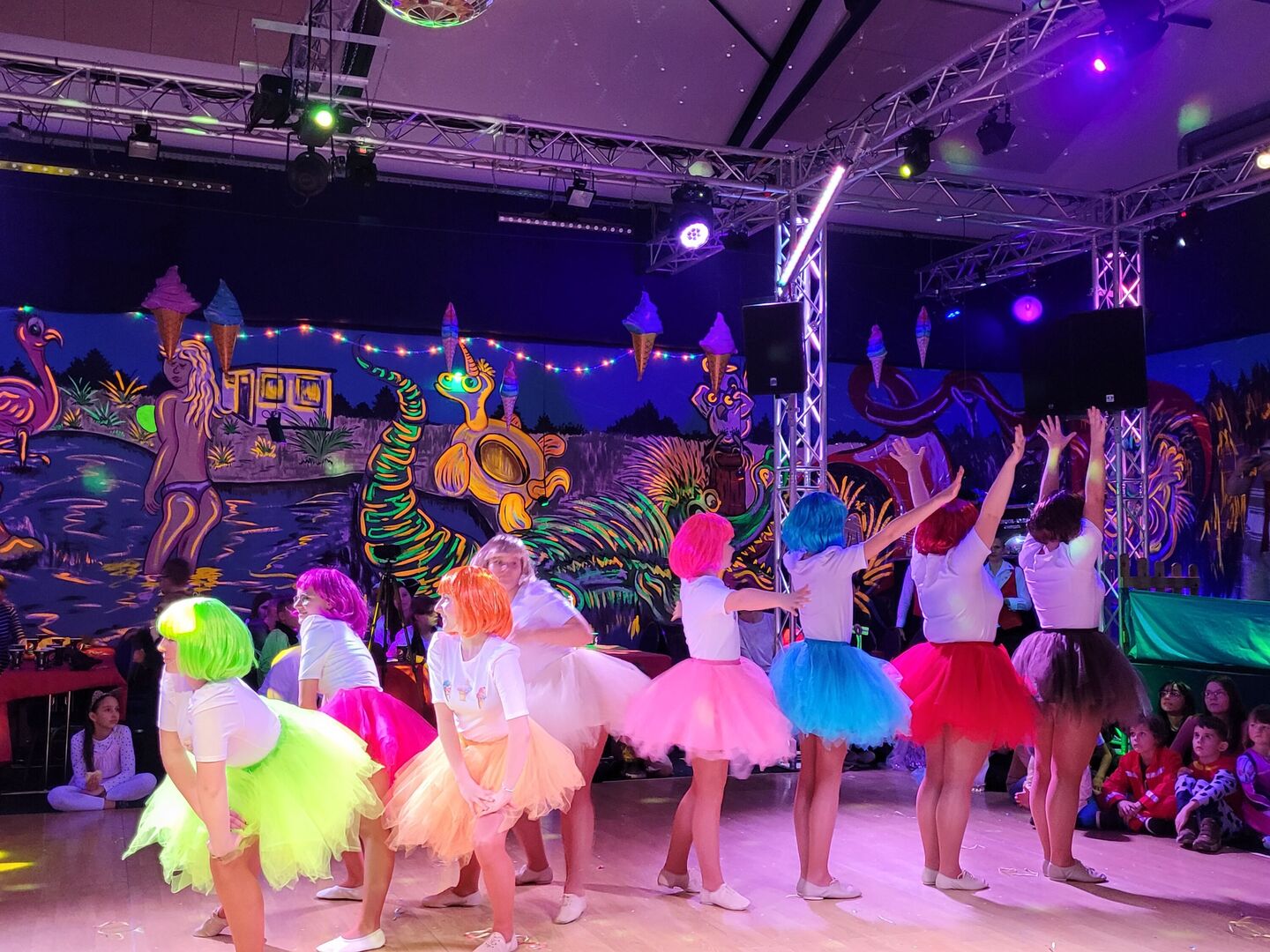 Im folgenden Theaterstück von Kindern für Kinder ging es in der Kulisse des Schwimmbades natürlich ums Schwimmen-Lernen und wie viel man in Gemeinschaft und mit Zusammenhalt schaffen kann. Nach weiteren bunten Showtanzeinlagen regnete es zur Freude aller Kinder Bonbons und Süßigkeiten von der Bühne.