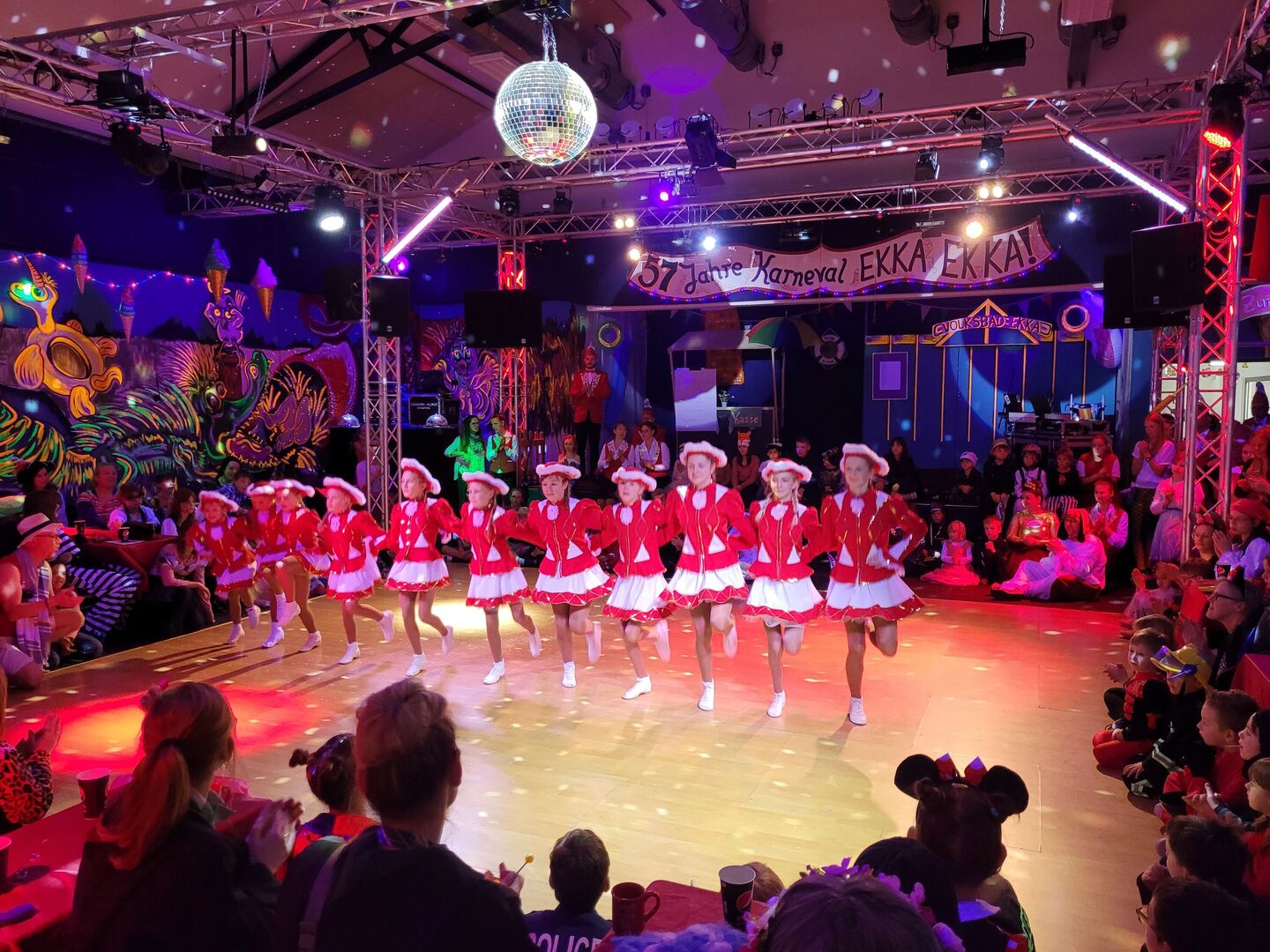 Gleich nach der Begrüßung mit Bademeister Holm und seinem Hund Holly (Jan Wustmann) war auch klar, dass die Kinder an diesem Tag im Mittelpunkt stehen: Alle Erwachsenen bildeten einen langen Tunnel nur für die Kinder und Jugendlichen. Danach jagte ein Highlight das nächste. Die Funkengarde tanzte, bevor die Clowns Lilly und Hugo von den Kindern lautstark hereingerufen wurden, die reichlich Unfug anstellten.