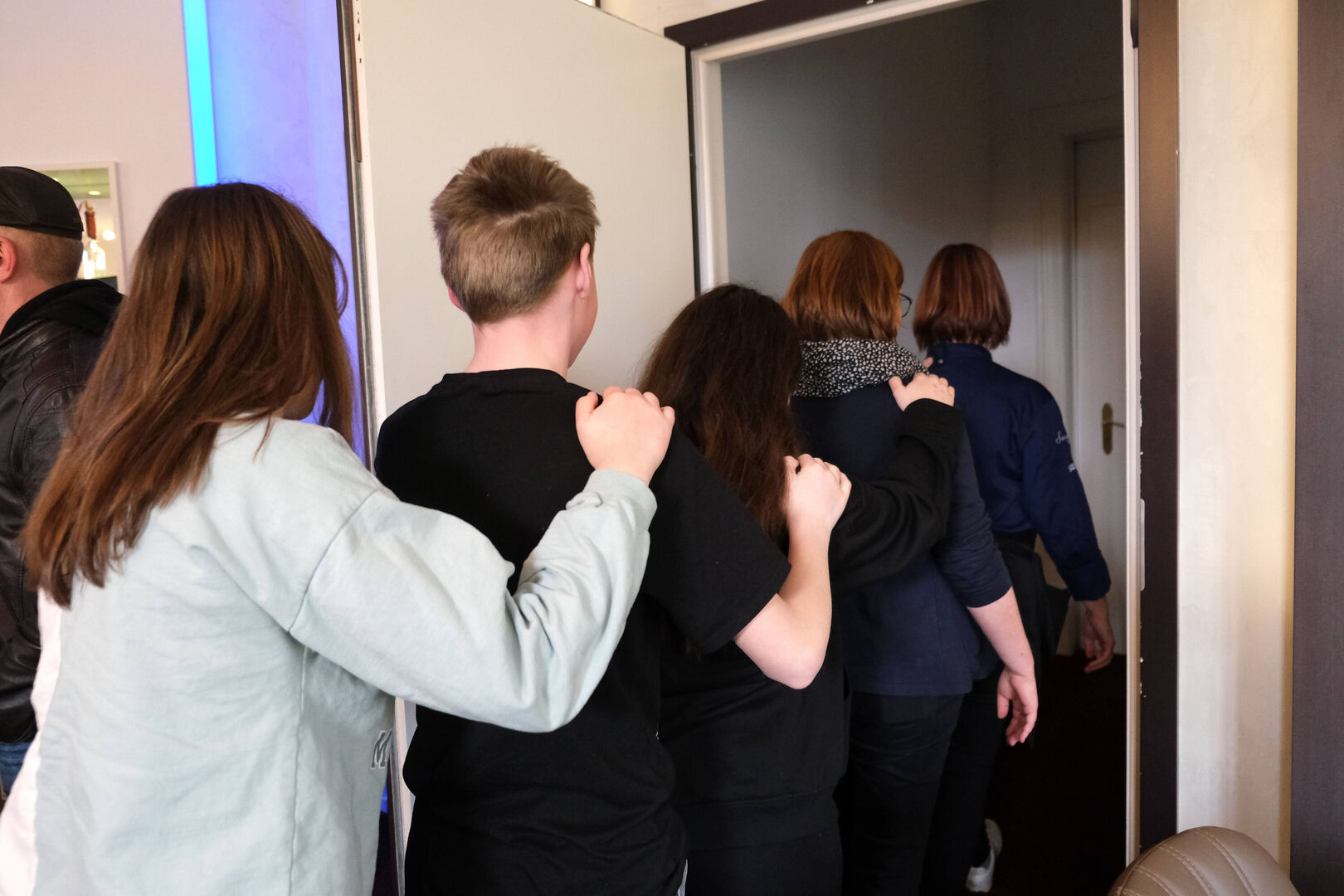 Jeweils in kleinen Gruppen und gut miteinander verbunden folgten die jungen Menschen den blinden Kellern in zwei Räume, in die tatsächlich nicht das kleinste Fünkchen Licht mehr fiel. Für viele war es zunächst eine sehr befremdliche Erfahrung, doch nach und nach gewöhnten sich die Mädchen und Jungen ans Nicht-Sehen und besannen sich auf ihre anderen Sinne. Als schließlich das Essen kam, hieß es: Sehen mit den Händen, schmecken mit der Nase und fühlen mit den Ohren.
