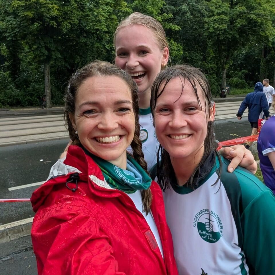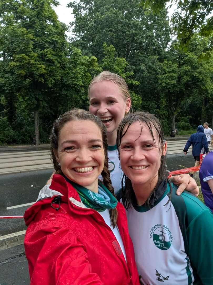 Die ersten zwei Kilometer waren tatsächlich noch halbwegs trocken, doch danach strömte es nur so auf uns herab. Mit Blitz und Donner ging’s weiter Richtung Ziel, bis wir im strömenden Regen und mit Gewitterkulisse ins Rudolf-Harbig-Stadion eingelaufen sind. Der rote Teppich im Stadion glich auch eher einer durchnässten Duschmatte. Aber: Alle sind heil angekommen und das zählt!