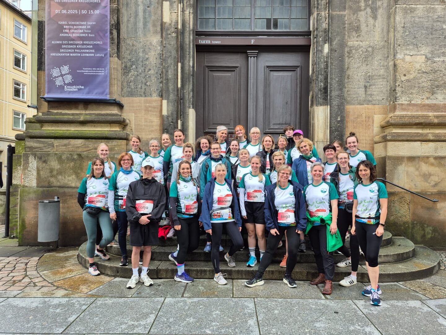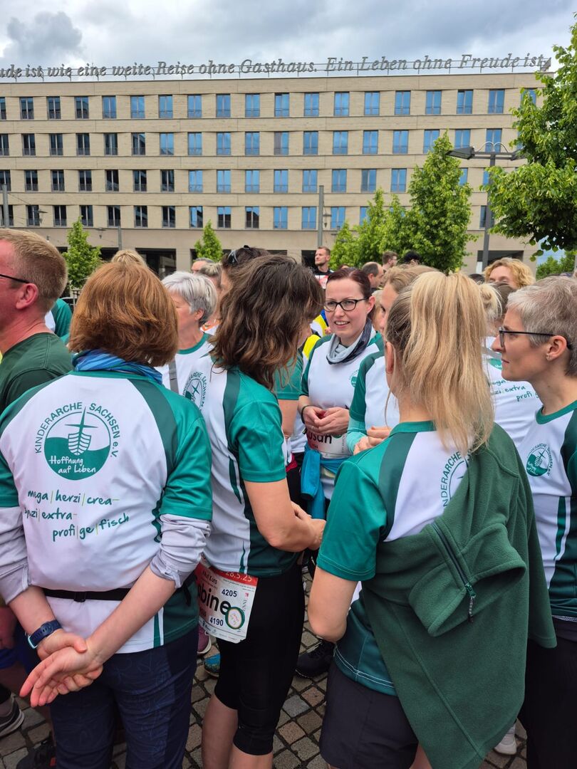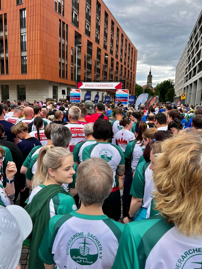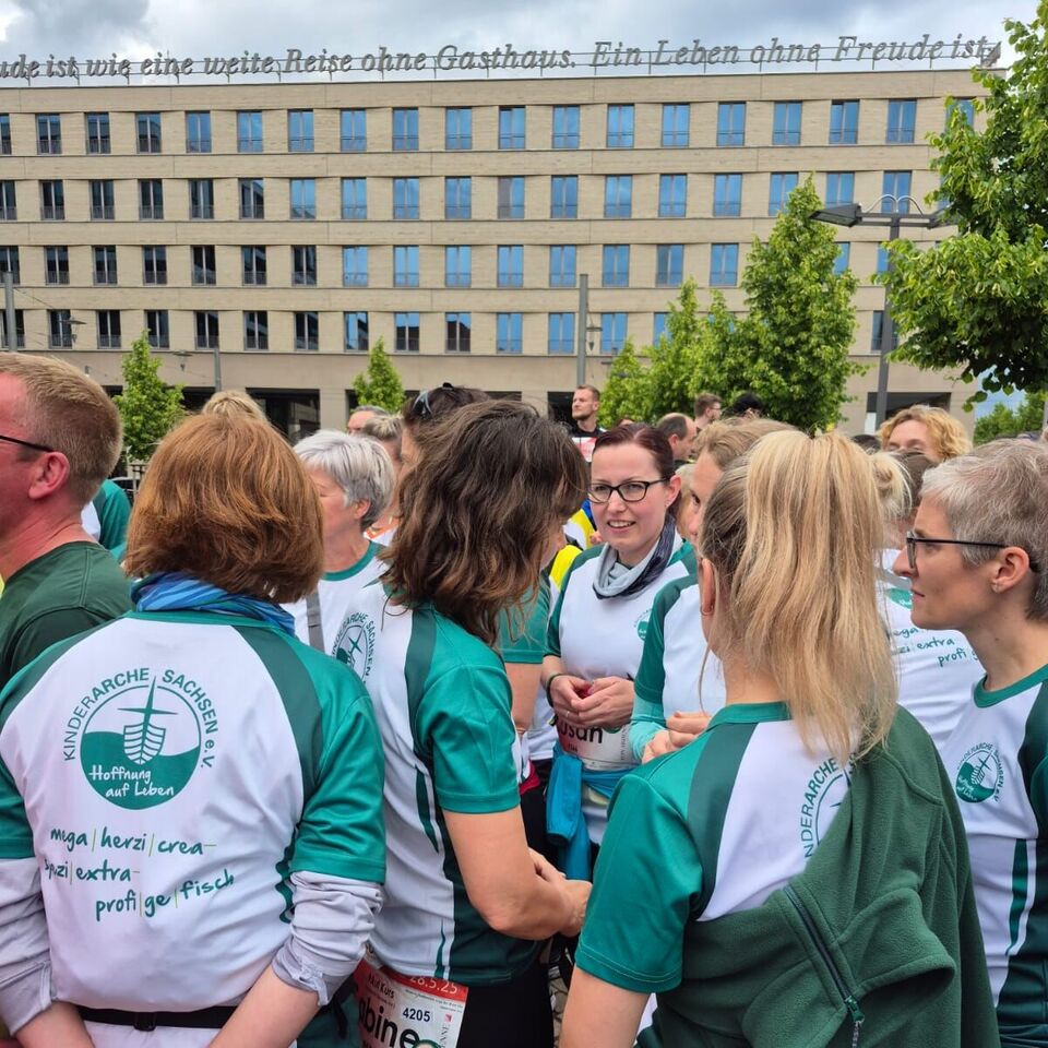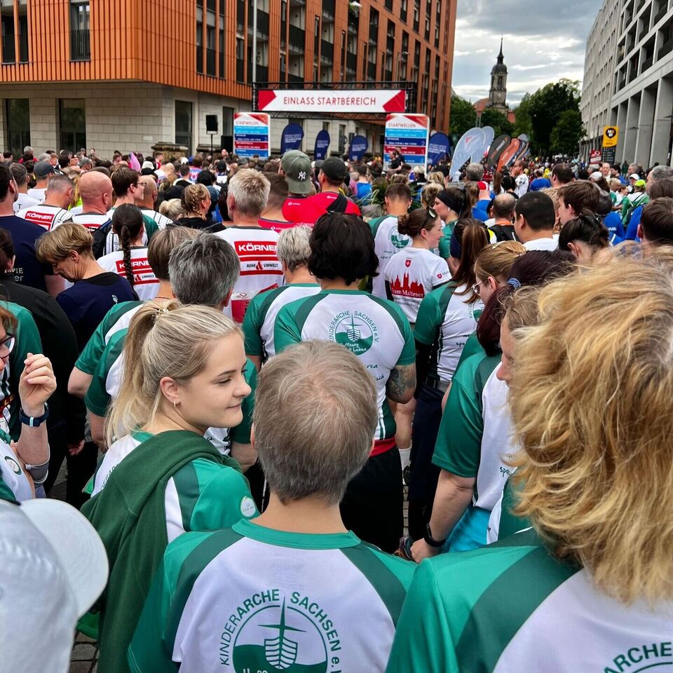 Mit einem starken Team aus 40 Läuferinnen und Läufern aus Kinderarche-Einrichtungen in ganz Sachsen sind wir ins Rennen gegangen – wenn auch erst 15 Minuten nach dem offiziellen Start, weil sich’s im Startbereich an der Annenstraße ordentlich gestaut hat.
