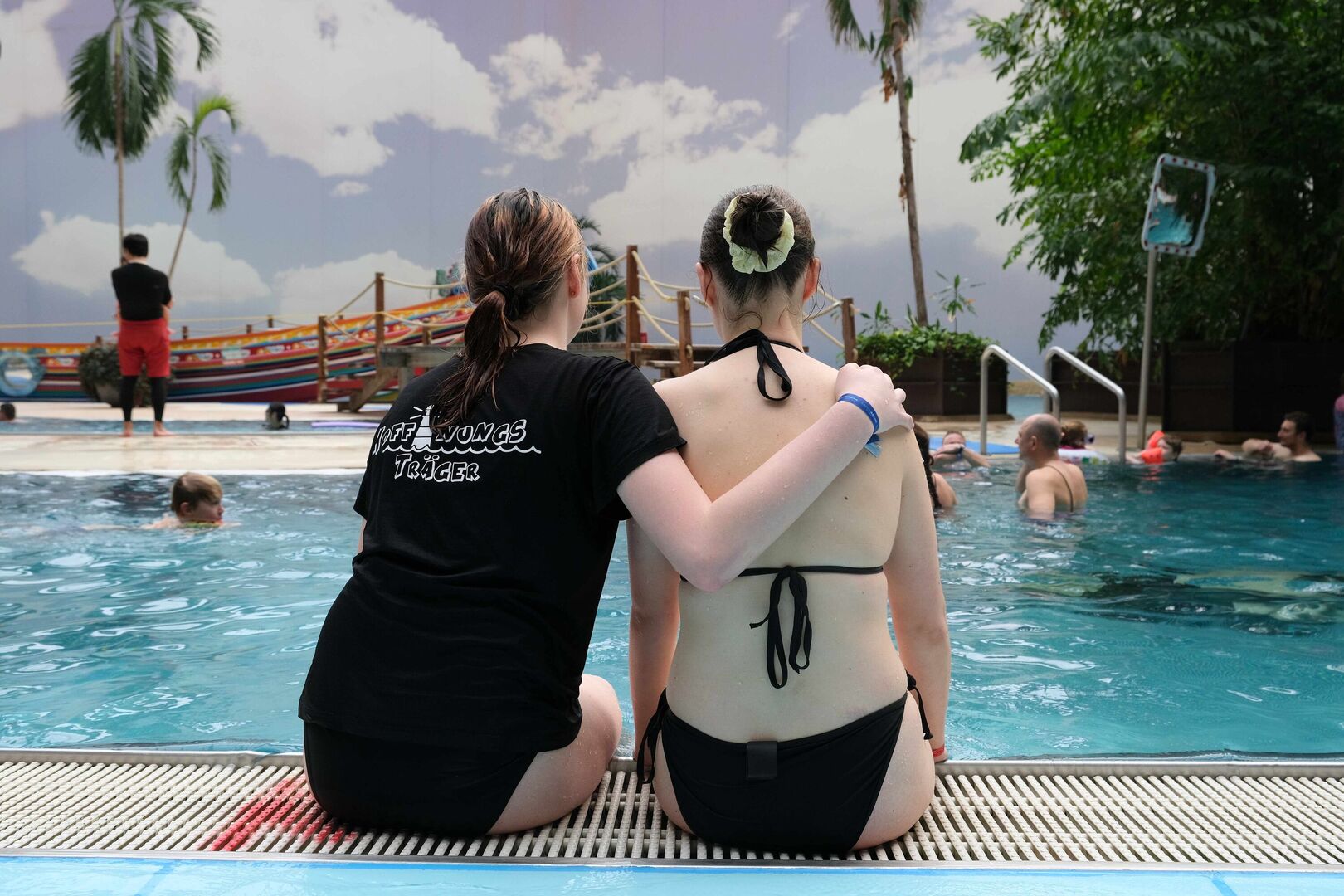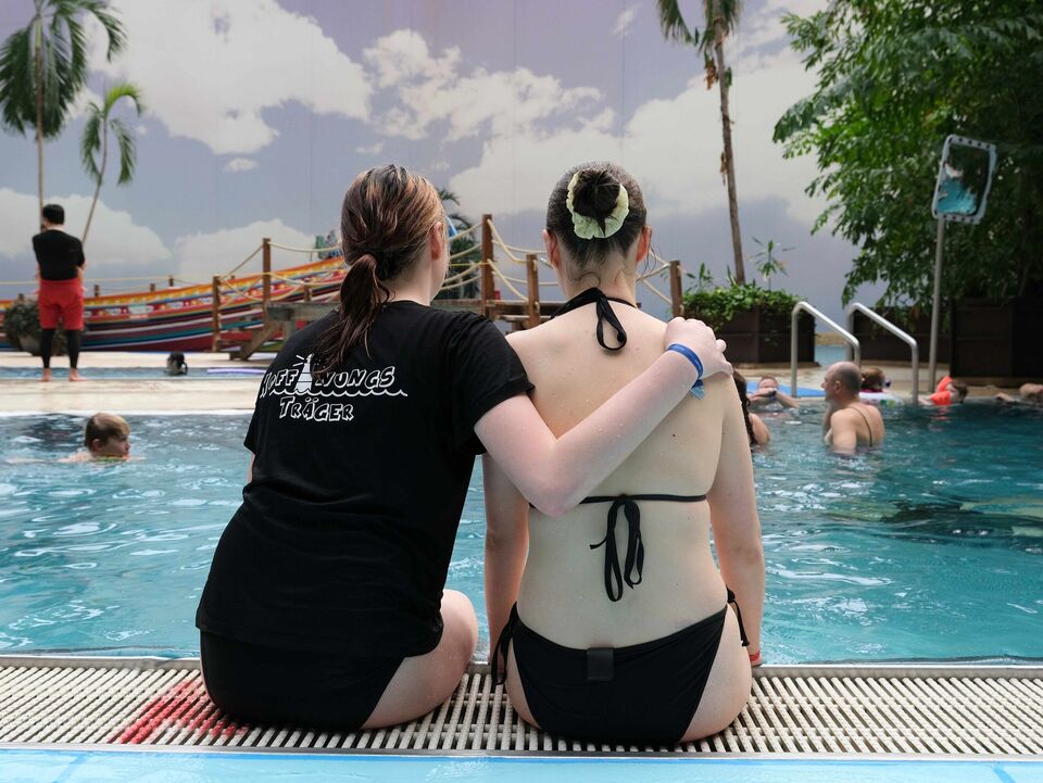Nach dem obligatorischen Gruppenbild am Bali-Tor bedankten sich Barbara Gärtner und Matthias Lang bei Matthias Möller für die nunmehr schon dritte Einladung in die Tropen – und dann gab es für die Kinder kein Halten mehr: Die Größeren lieferten sich wilde Rutsch-Duelle im Double-Racer, während die Kleinsten am Kraki-Beach planschten. Ob mit oder ohne Schwimmflügel, mit oder ohne Taucherbrille – es galt, die Lagune und die tropische See zu erkunden, sich vom Wasserstrudel mitreißen zu lassen, den Kopf unter Fontänen zu halten oder einfach die Füße in den Sand zu stecken.