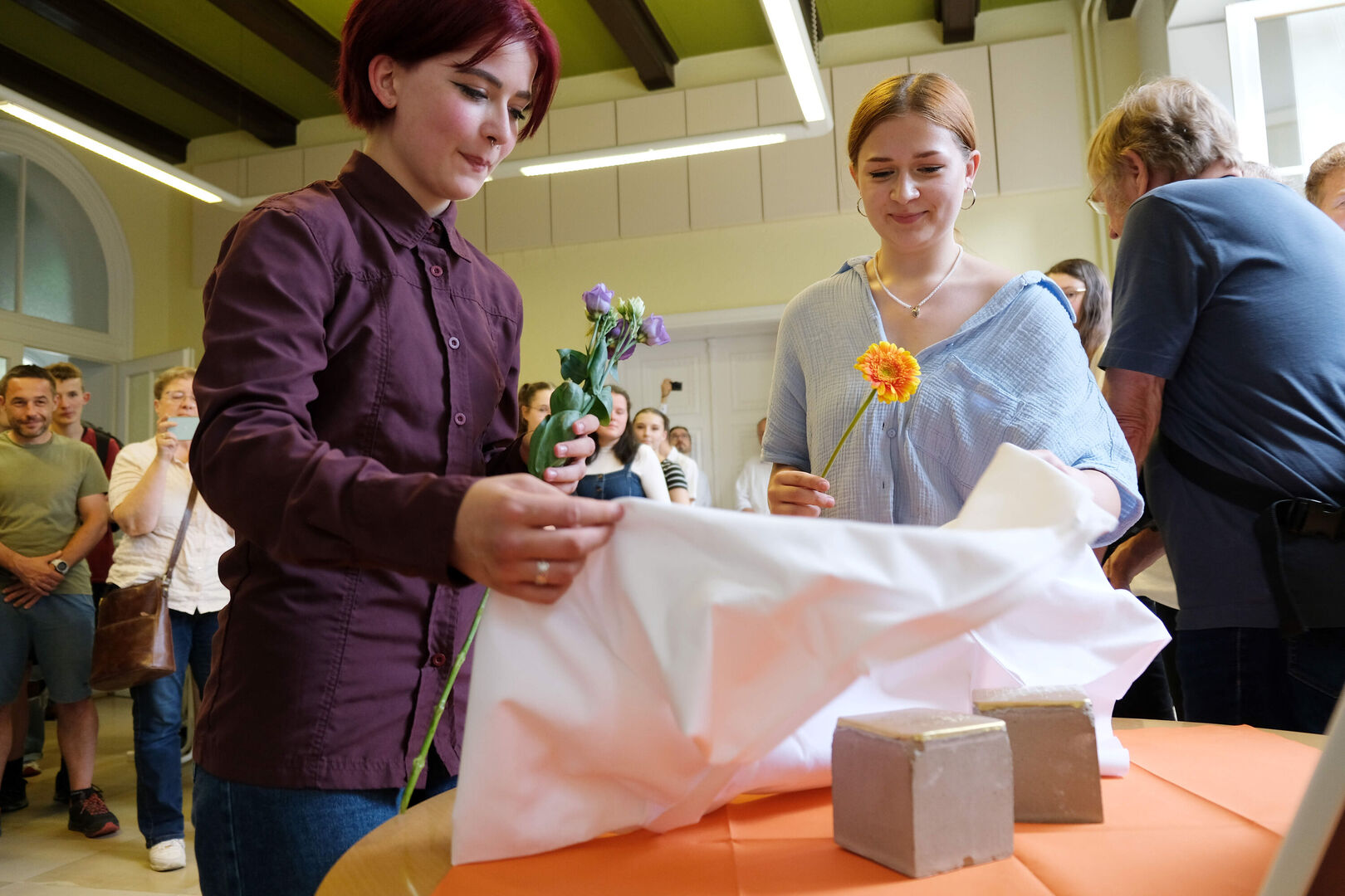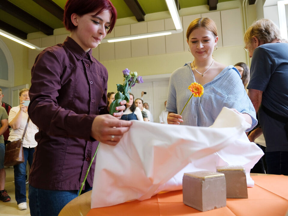 Schon im Vorfeld war der Kontakt zwischen den Schülern und ihrer Lehrerin Tanja Bendel und unserer Wohngruppe „Wach’sche Villa“ entstanden, weil auch die Mädchen und Mütter, die heute in der Villa ein Zuhause finden, großes Interesse an der Geschichte des Hauses und seiner früheren Besitzer haben. Entsprechend waren zur Übergabe der beiden Stolpersteine auch alle Bewohnerinnen der Wohngruppe gekommen, zwei von ihnen enthüllten feierlich die beiden Steine.